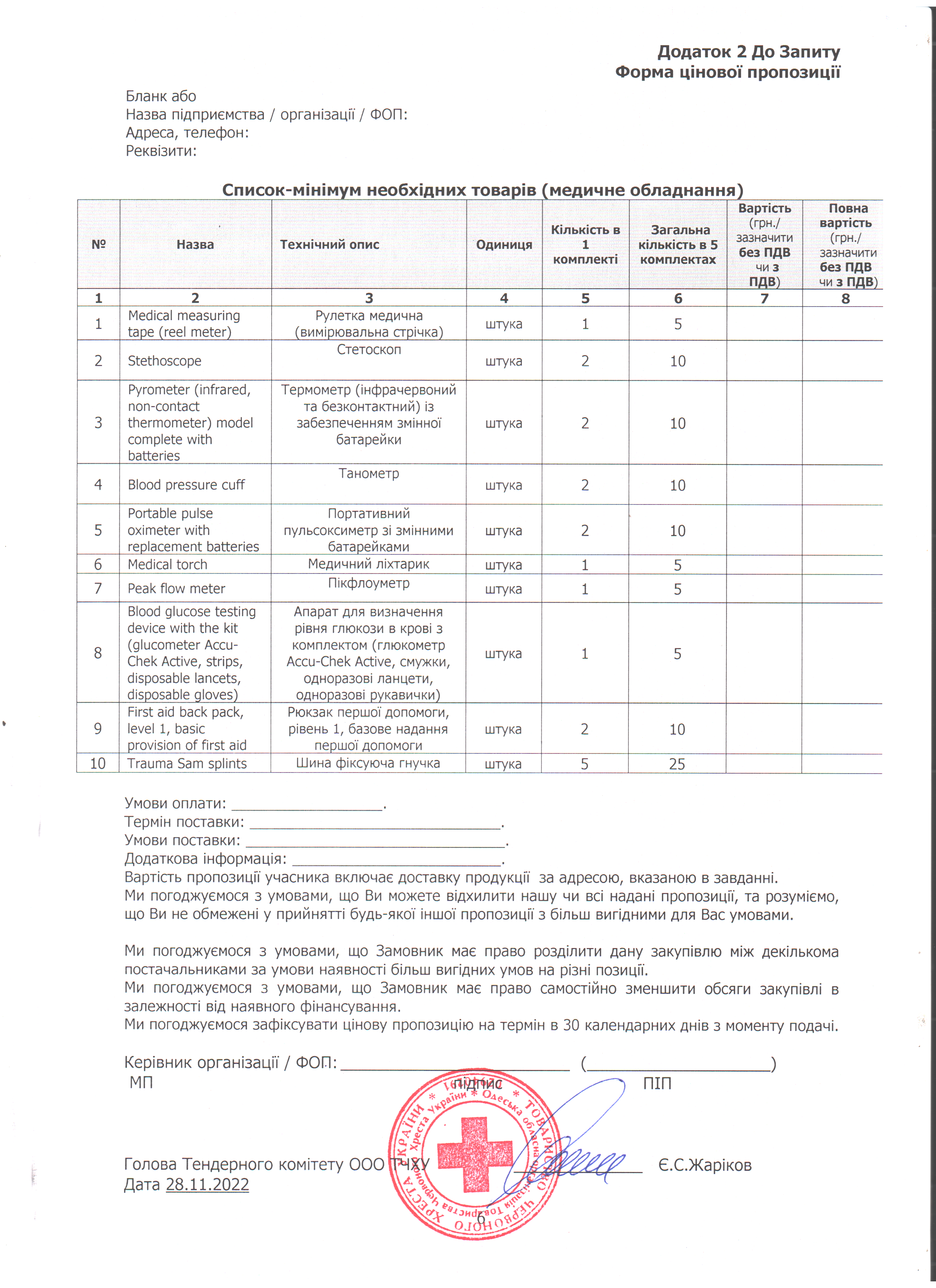 Одеська обласна організація Товариства Червоного Хреста України оголошує конкурс на місцеву закупівлю медичних витратних матеріалів та медичного обладнання.