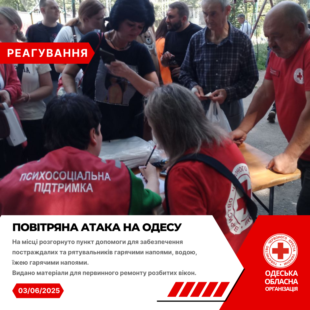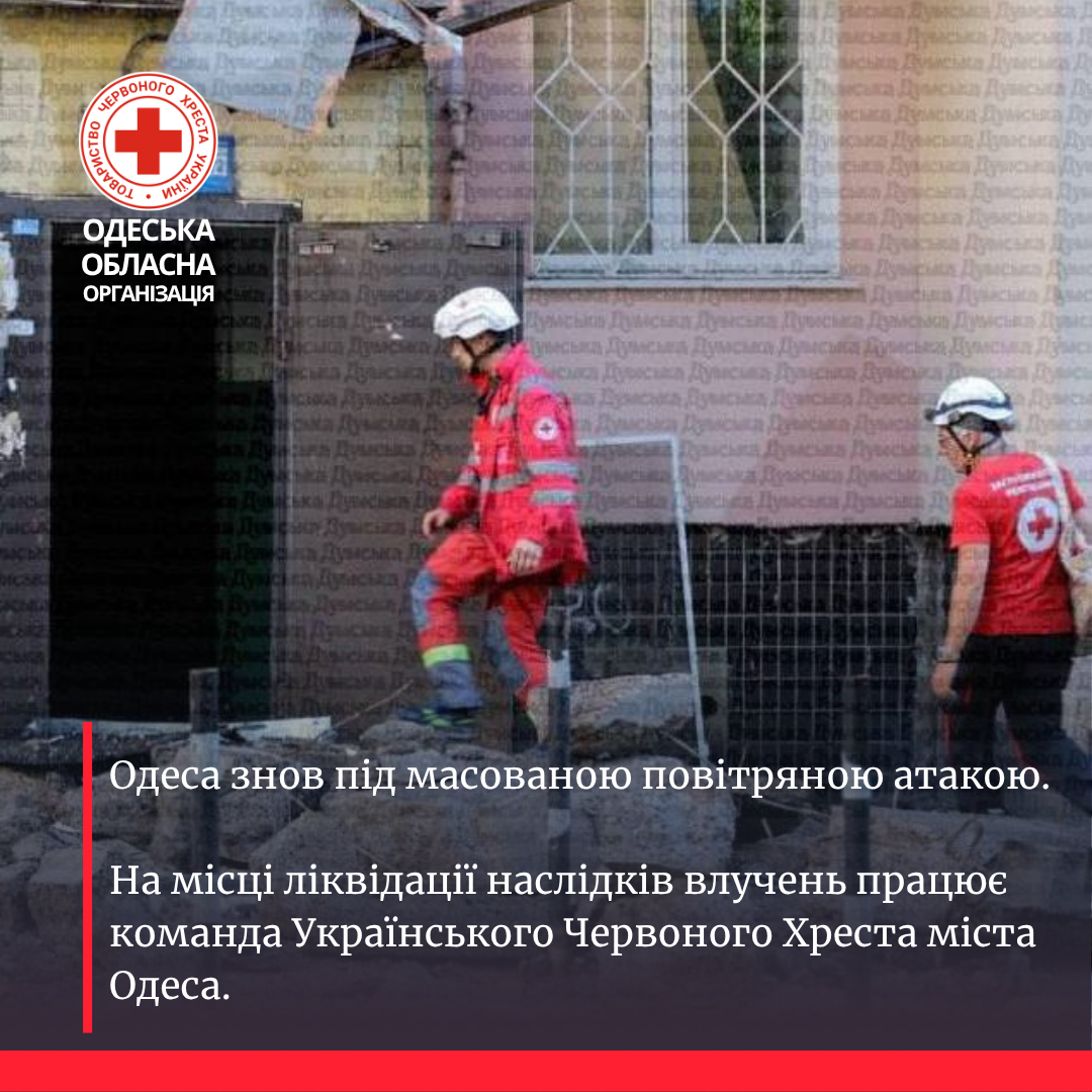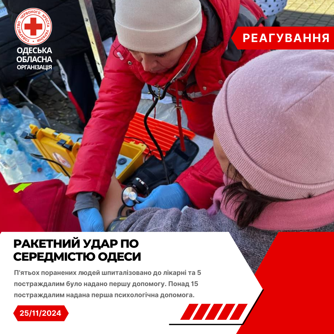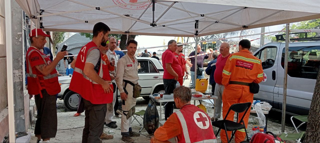 Волонтери Одеського Загону швидкого реагування Українського Червоного Хреста спільно з екстреними службами надавали першу допомогу та першу психологічну допомогу постраждалим, забезпечили питною водою учасників ліквідації наслідків обстрілу та організували спільно з партнерськими організаціями видачу гуманітарної допомоги.