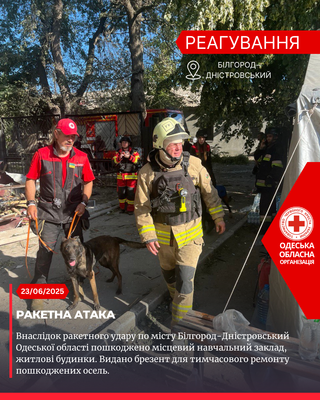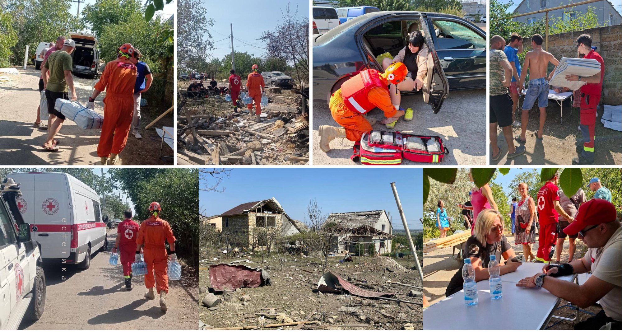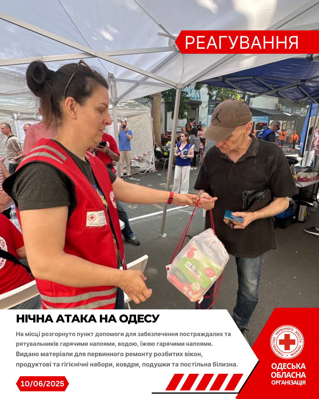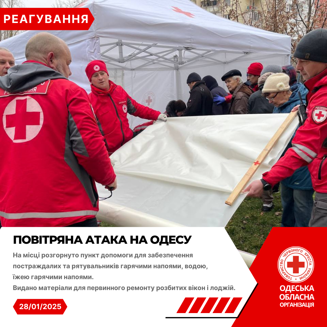 Волонтери Одеського Загону швидкого реагування Українського Червоного Хреста спільно з екстреними службами надавали першу допомогу та першу психологічну допомогу постраждалим, забезпечили питною водою учасників ліквідації наслідків обстрілу та організували спільно з партнерськими організаціями видачу гуманітарної допомоги.