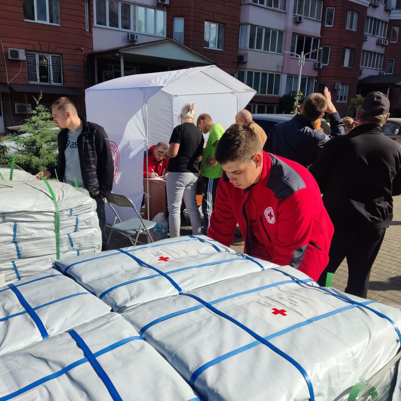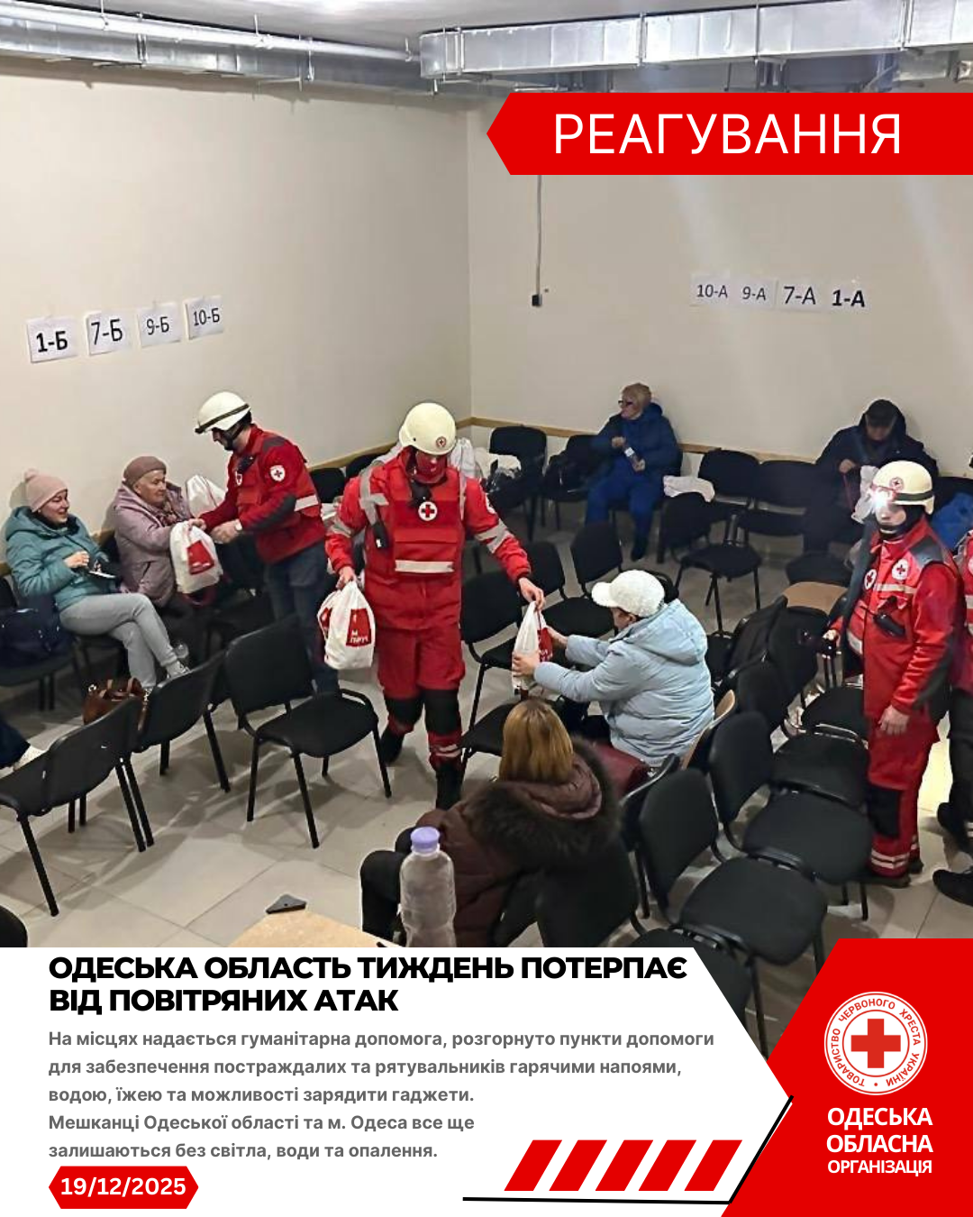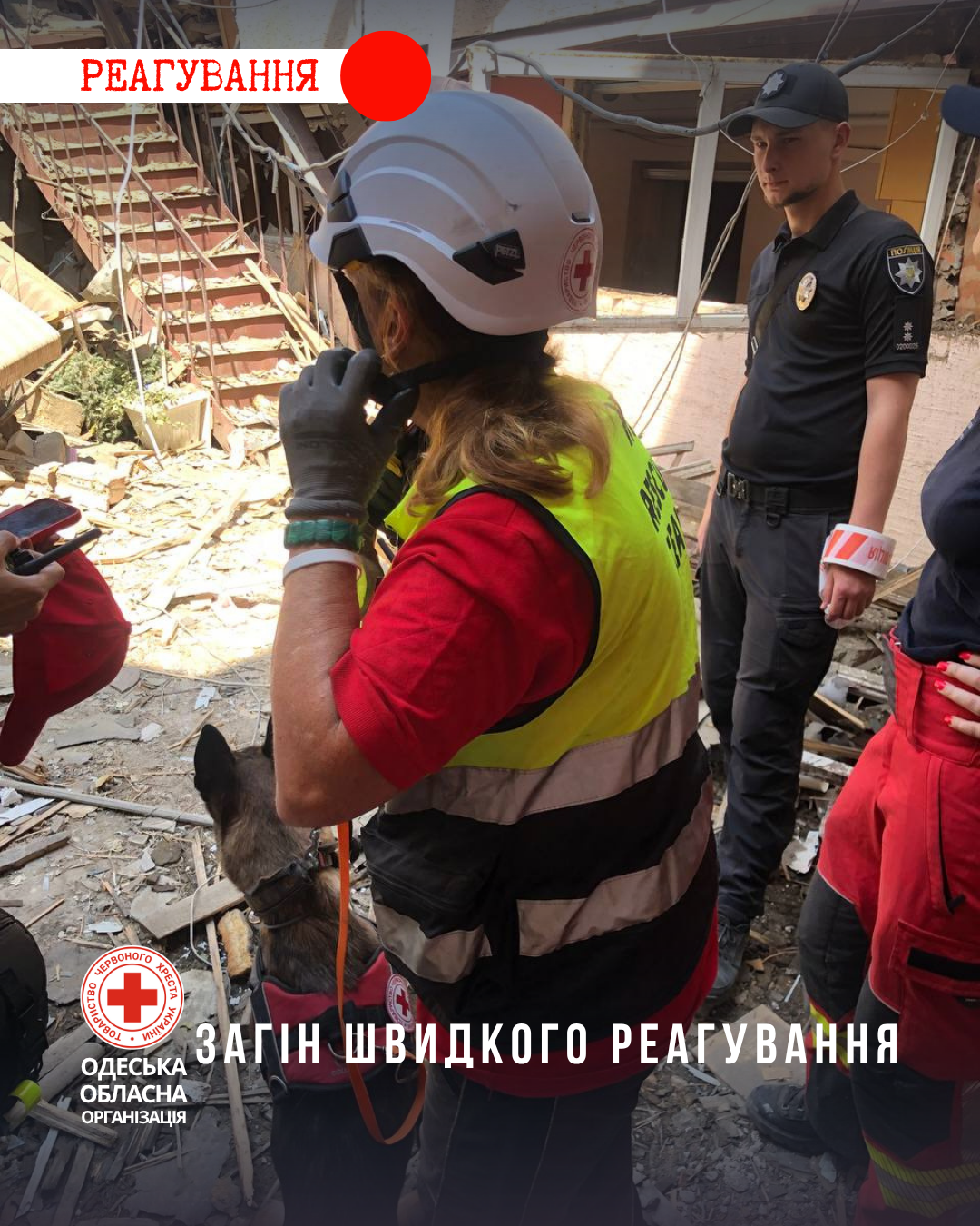 Волонтери Одеського Загону швидкого реагування Українського Червоного Хреста спільно з екстреними службами надавали першу допомогу та першу психологічну допомогу постраждалим, забезпечили питною водою учасників ліквідації наслідків обстрілу та організували спільно з партнерськими організаціями видачу гуманітарної допомоги.
