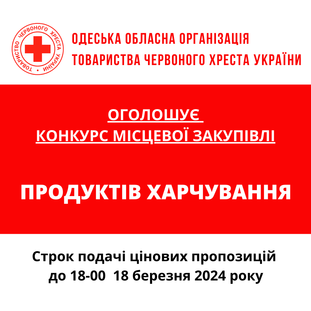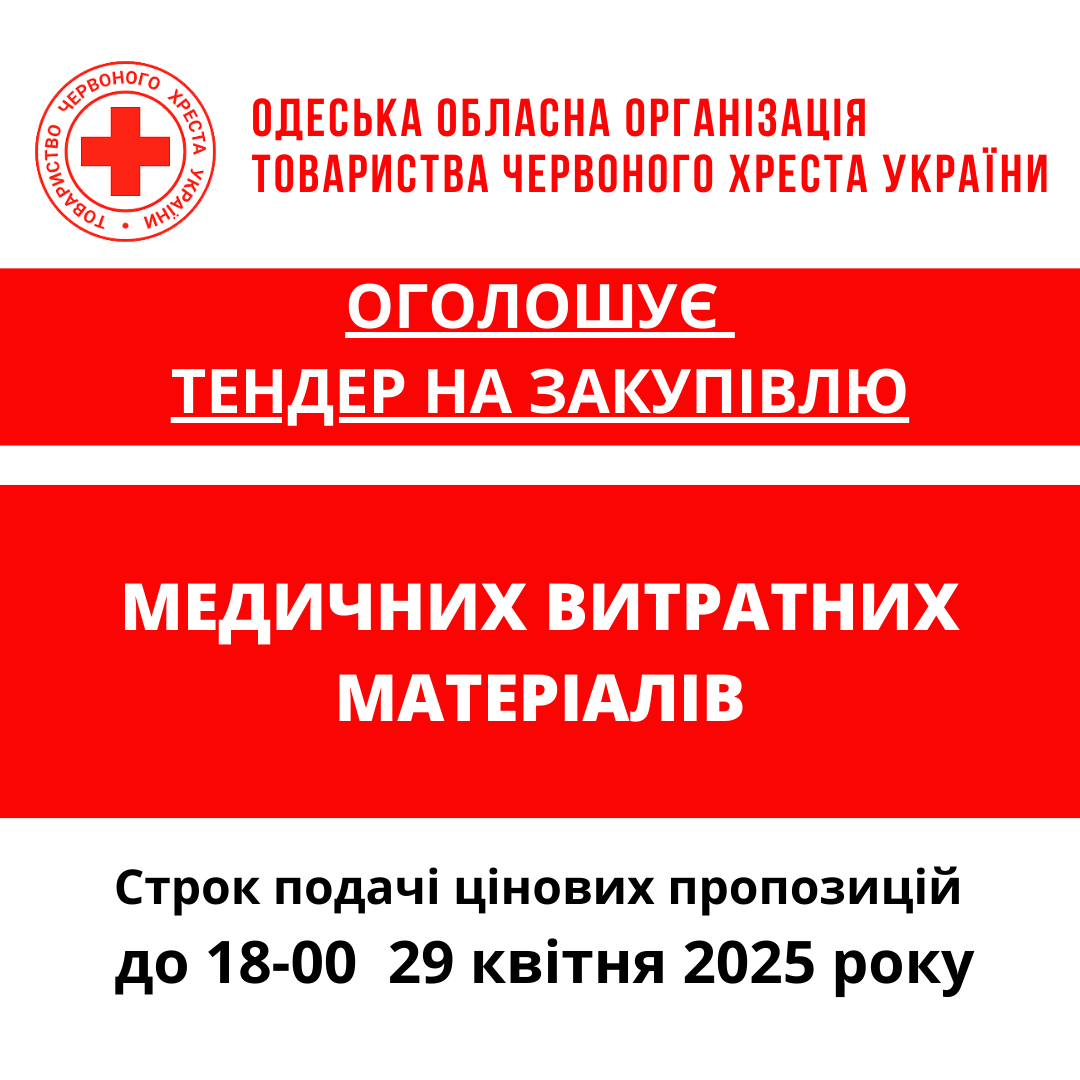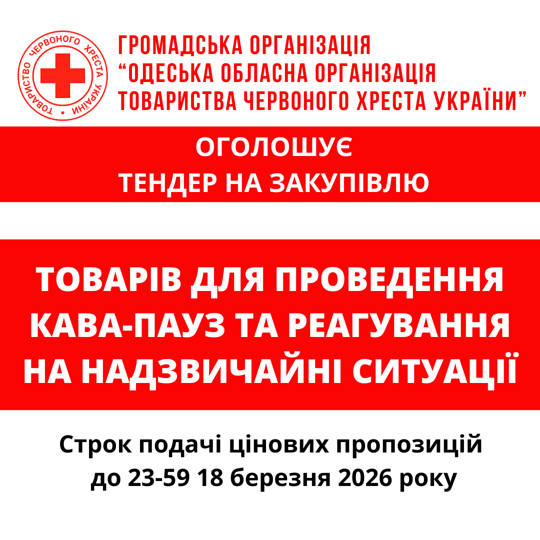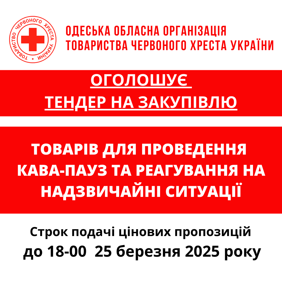 ГО «Одеська обласна організація Товариства Червоного Хреста України» оголошує тендер на товарів для кава-пауз та реагування на надзвичайні ситуації.