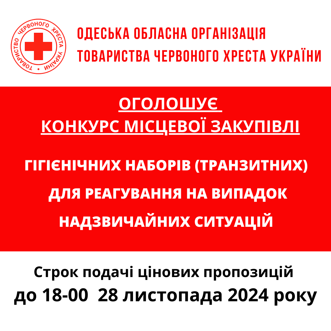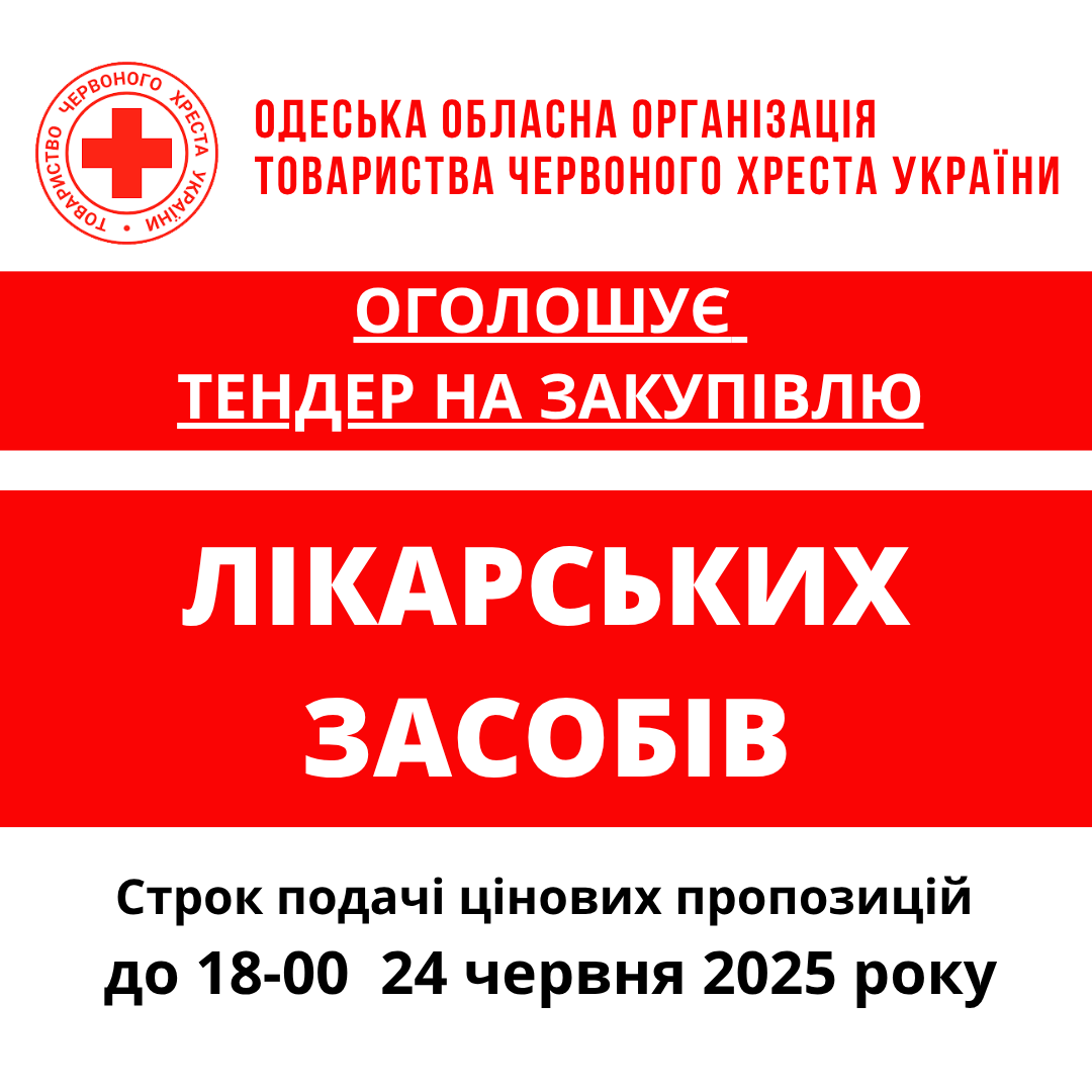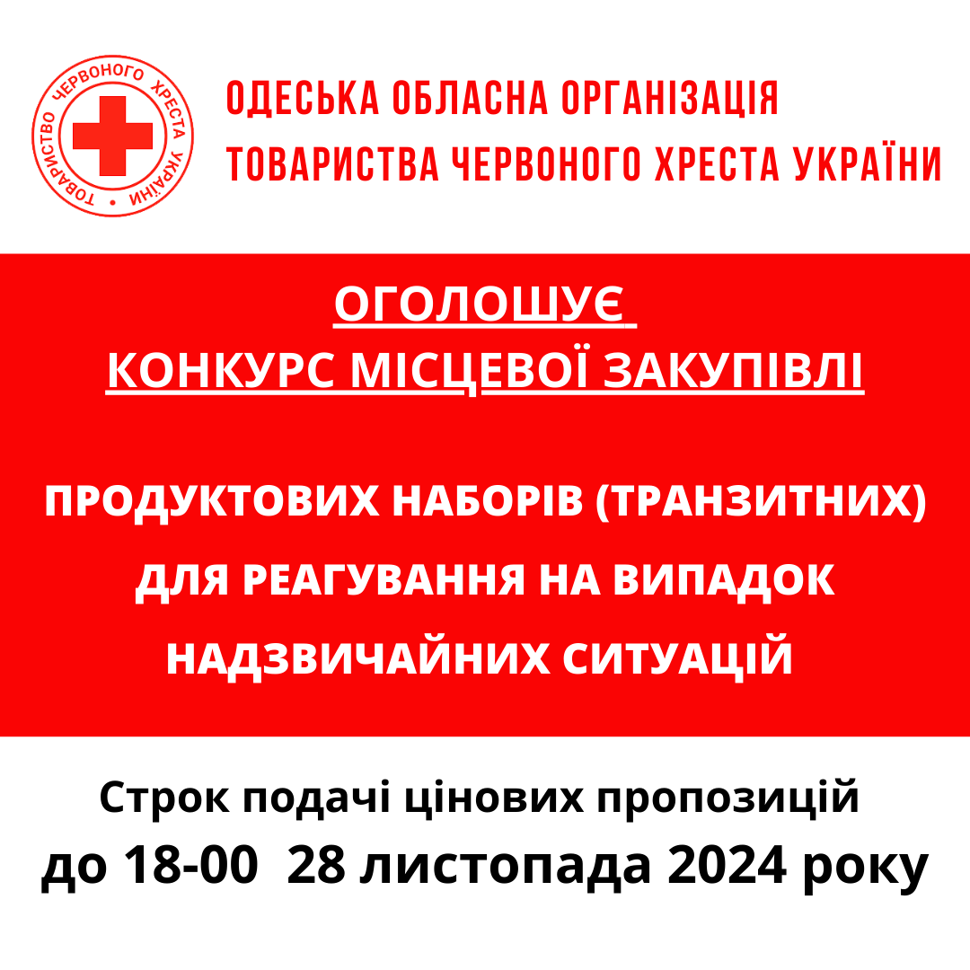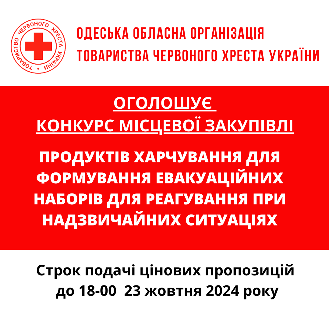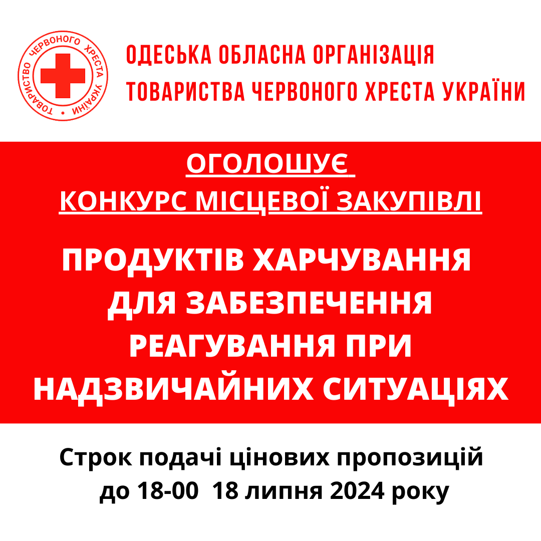 ГО «Одеська обласна організація Товариства Червоного Хреста України» оголошує тендер на товарів для кава-пауз та реагування на надзвичайні ситуації.