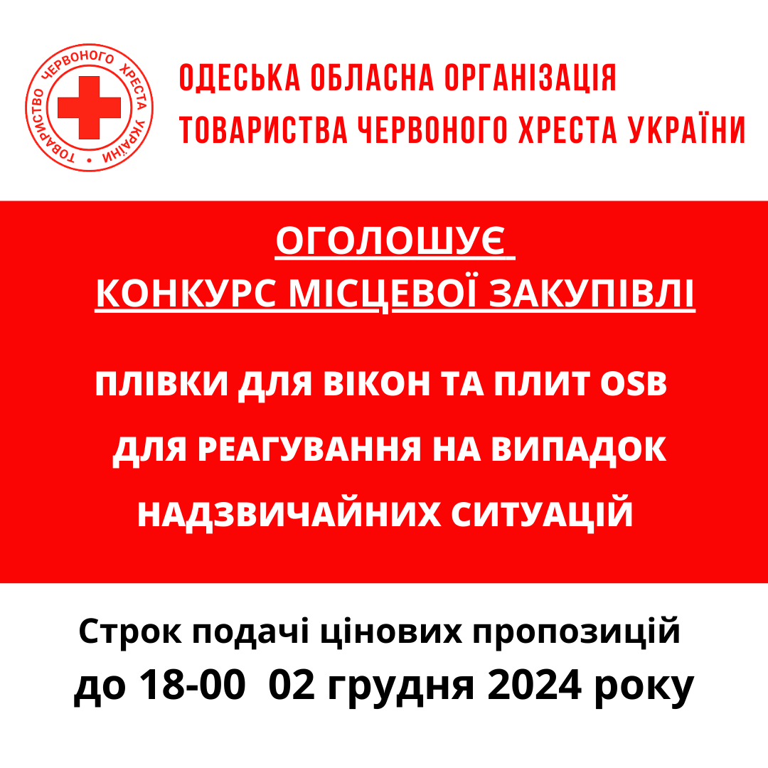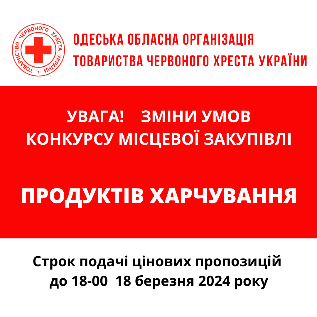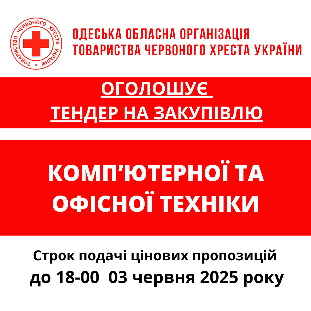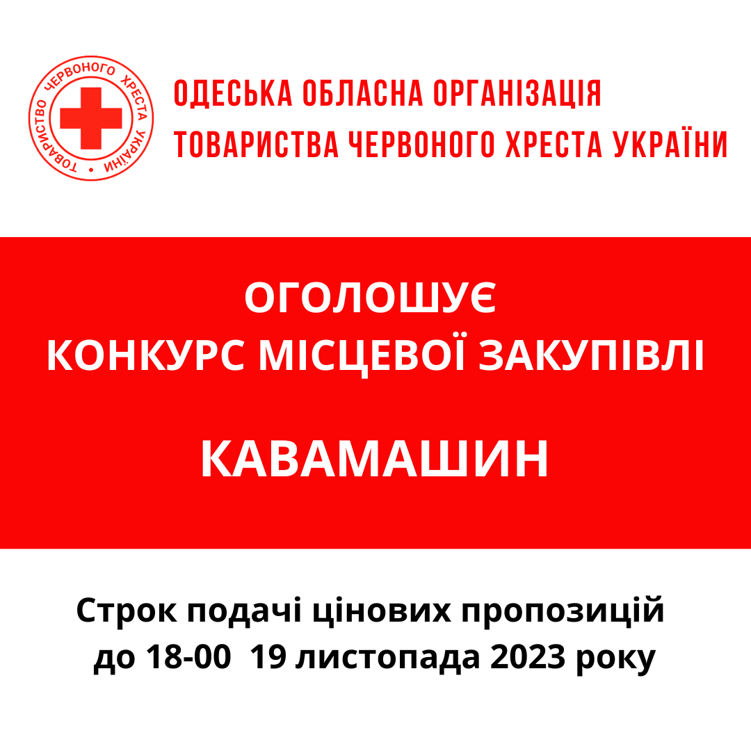 ГО «Одеська обласна організація Товариства Червоного Хреста України» оголошує тендер на товарів для кава-пауз та реагування на надзвичайні ситуації.