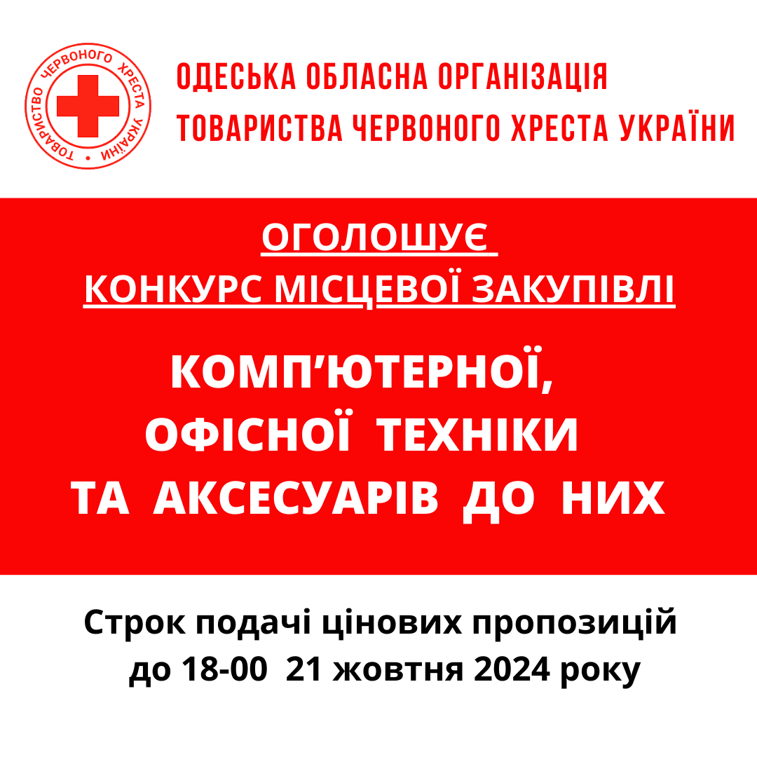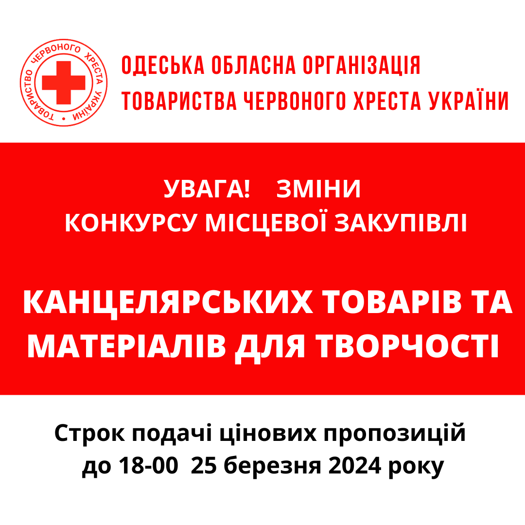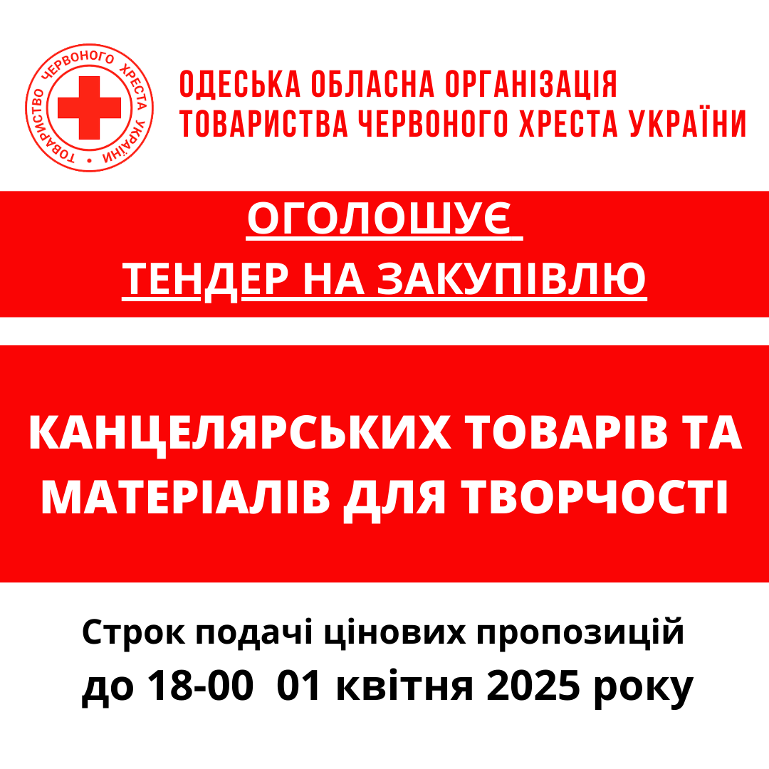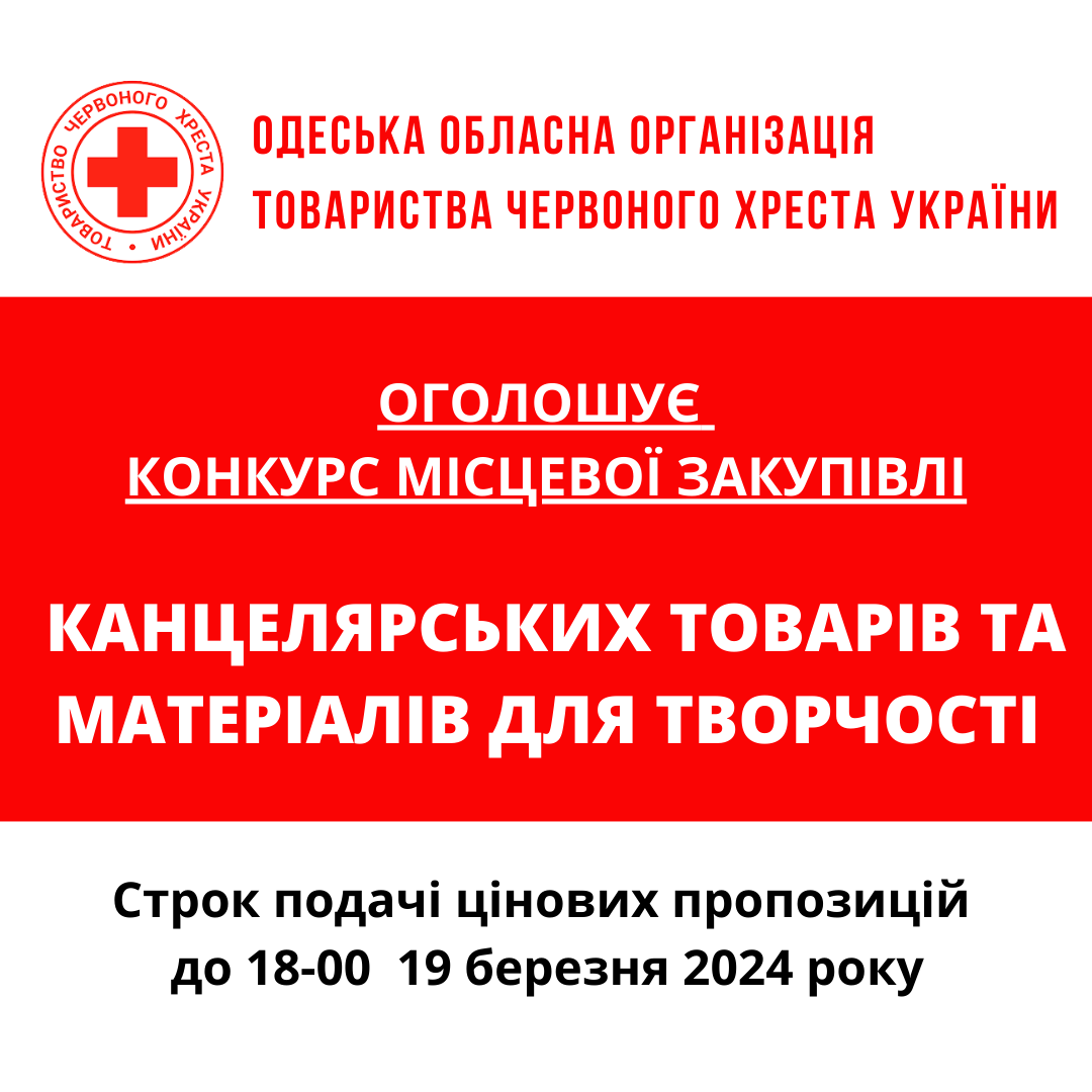 Одеська обласна організація Товариства Червоного Хреста України (далі – «Організатор») оголошує конкурс місцевих закупівель на придбання канцелярських товарів.