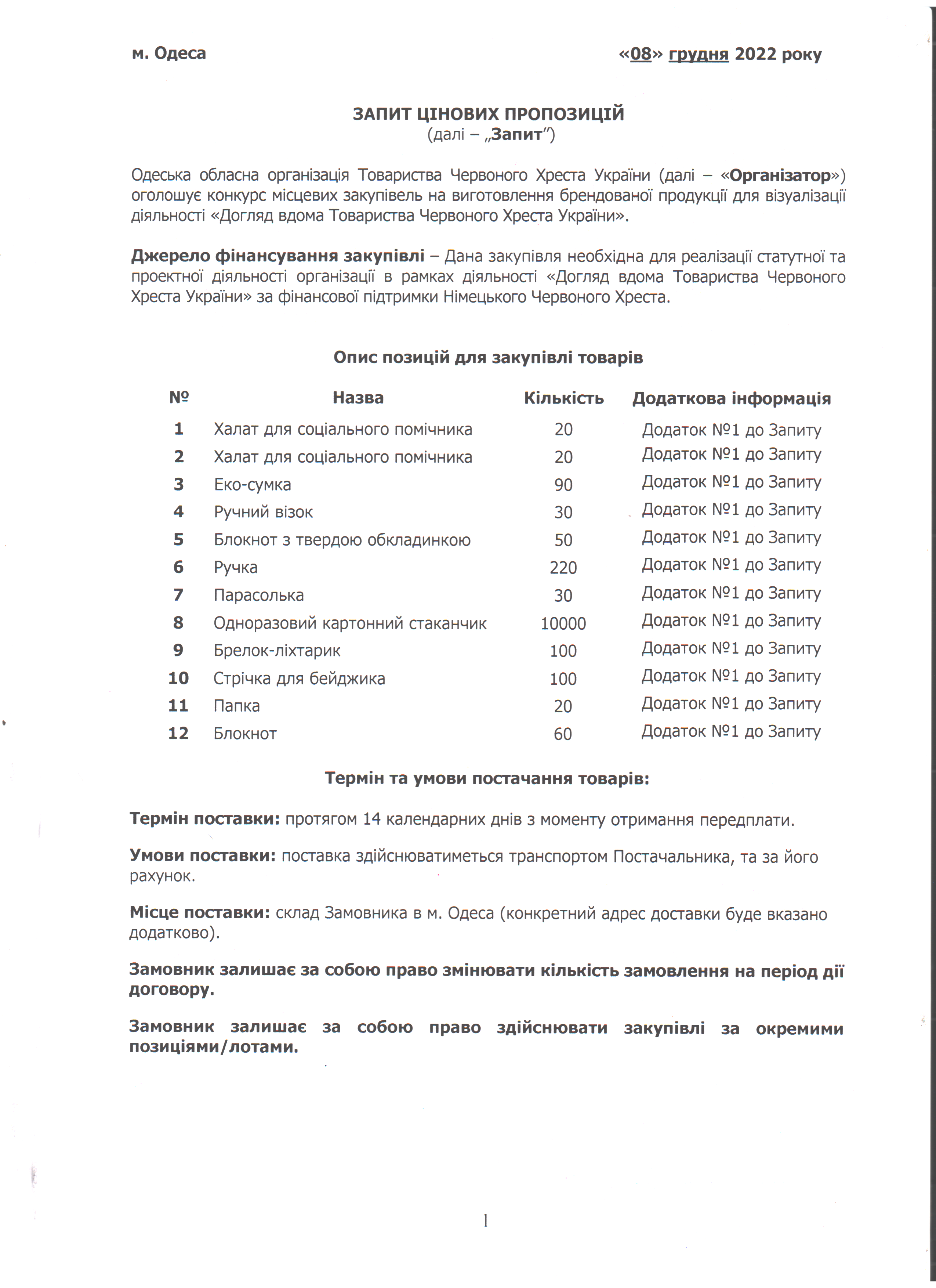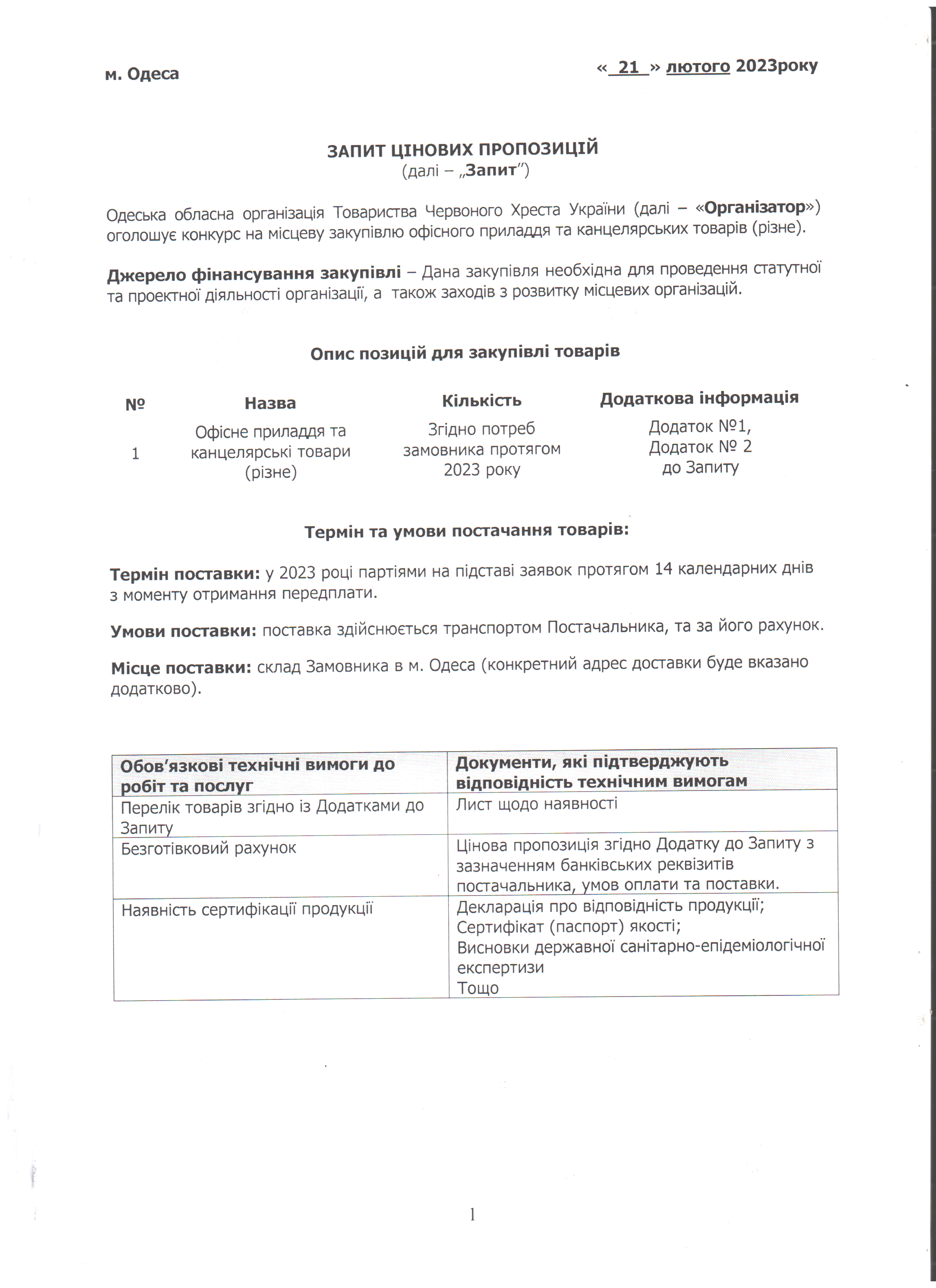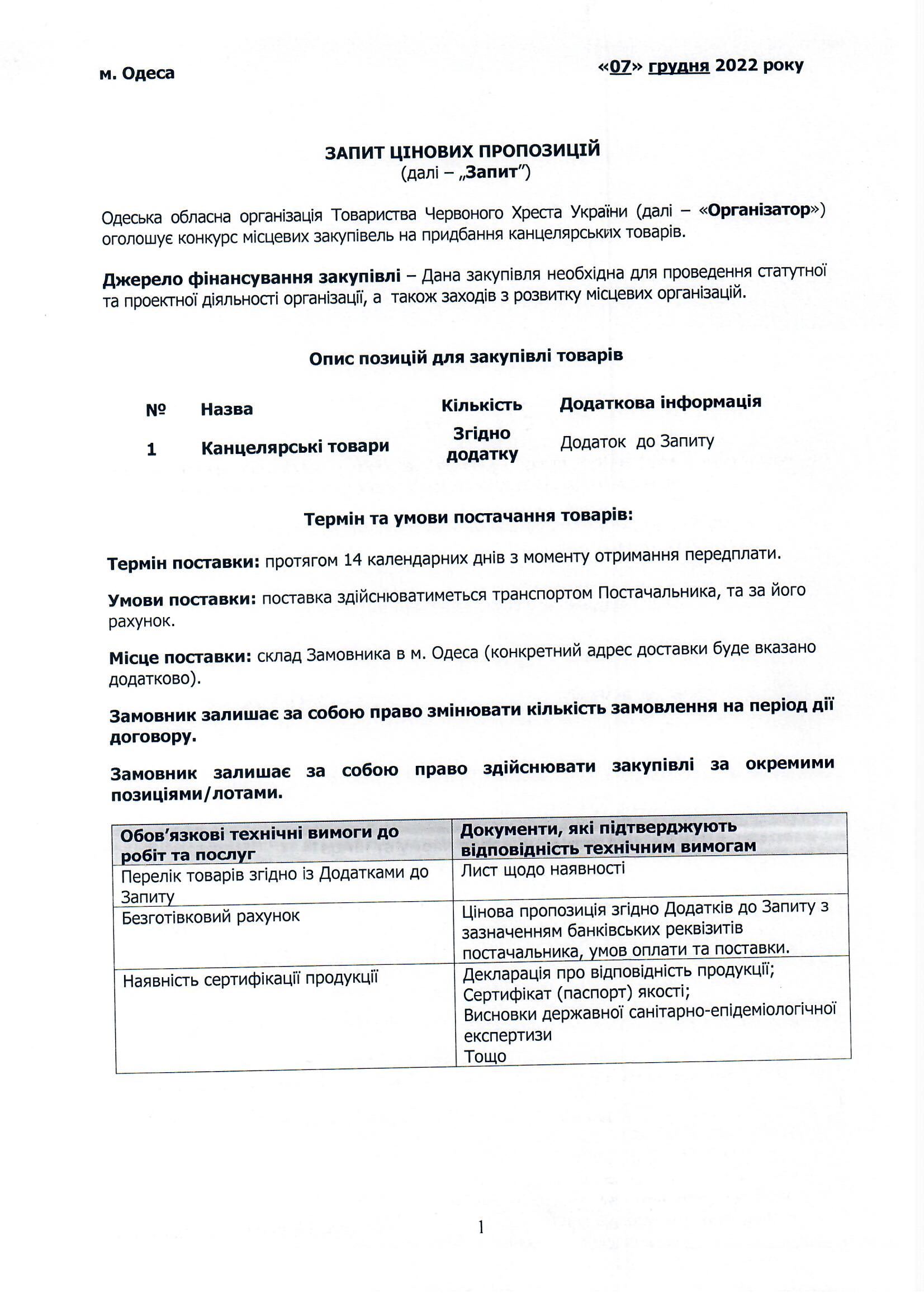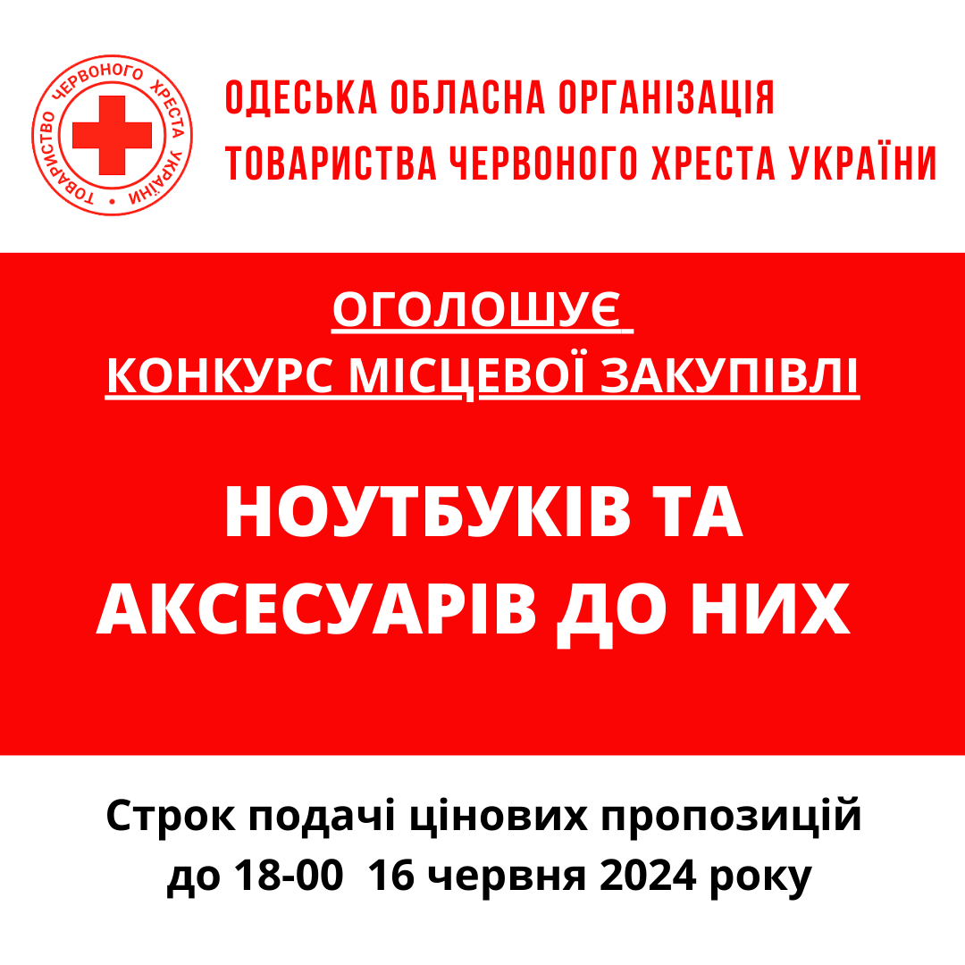 Одеська обласна організація Товариства Червоного Хреста України (далі – «Організатор») оголошує конкурс місцевих закупівель на придбання канцелярських товарів.