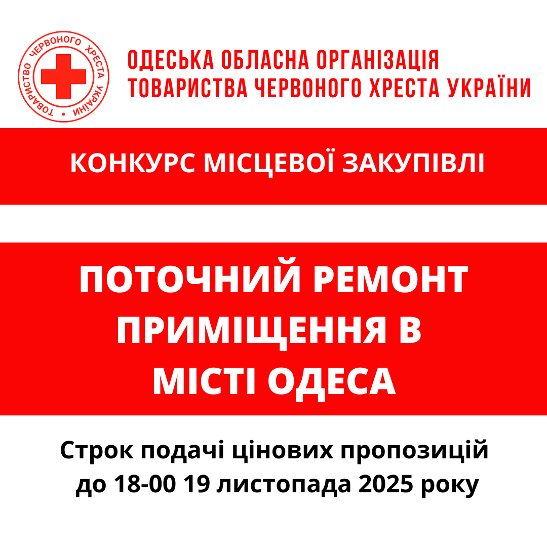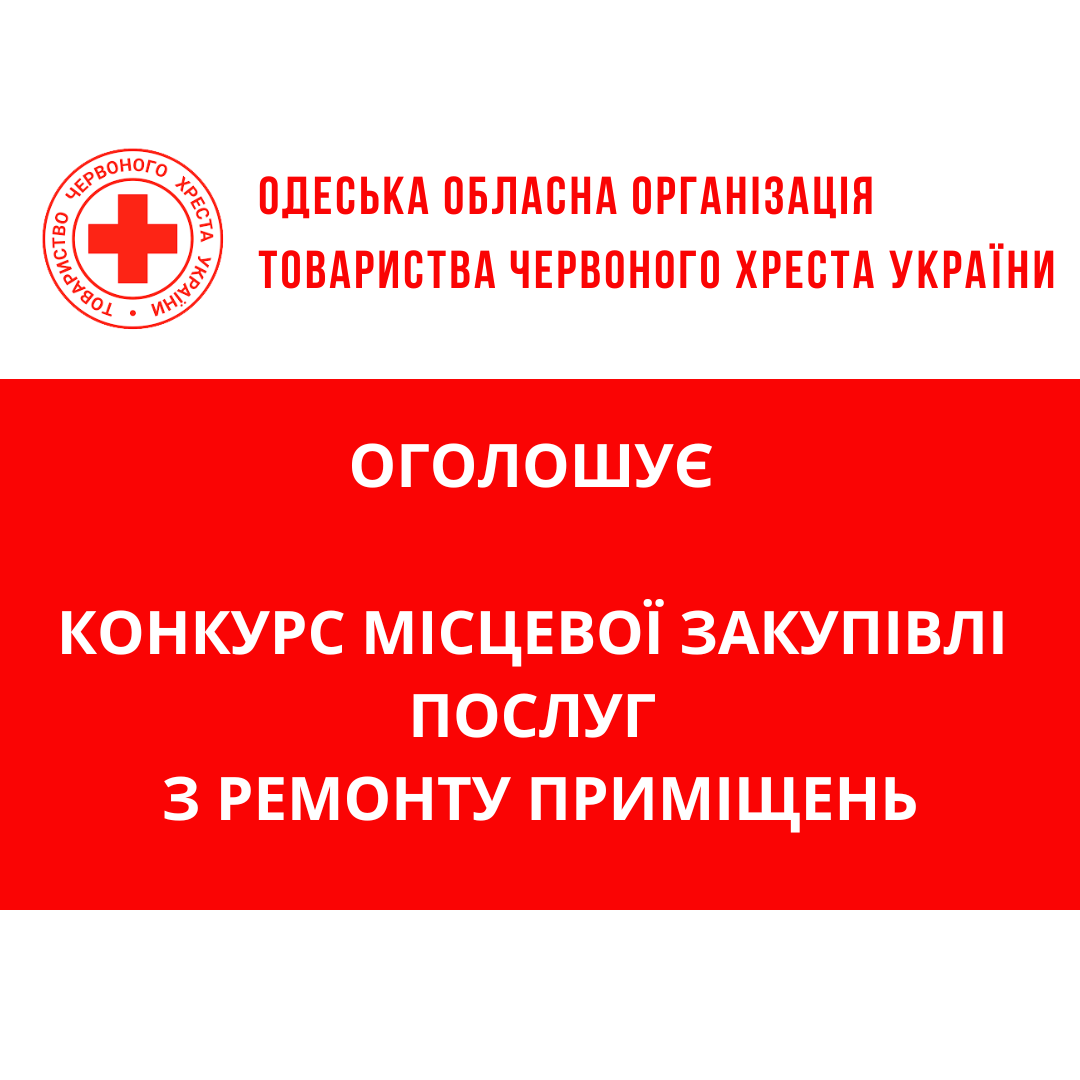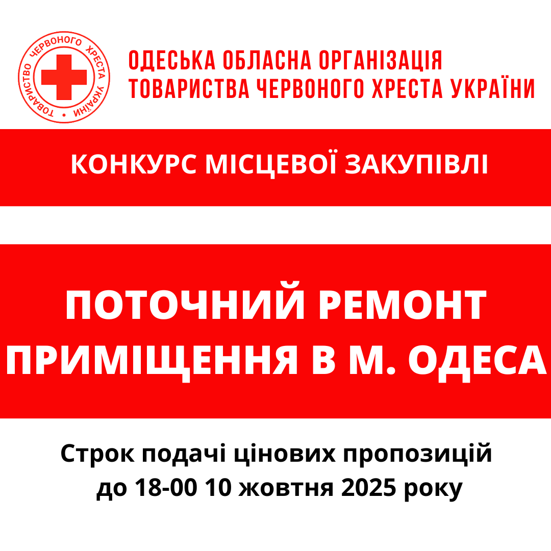 ГО «Одеська обласна організація Товариства Червоного Хреста України» оголошує конкурс місцевої закупівлі робіт з поточного ремонту приміщення у місті Одеса.