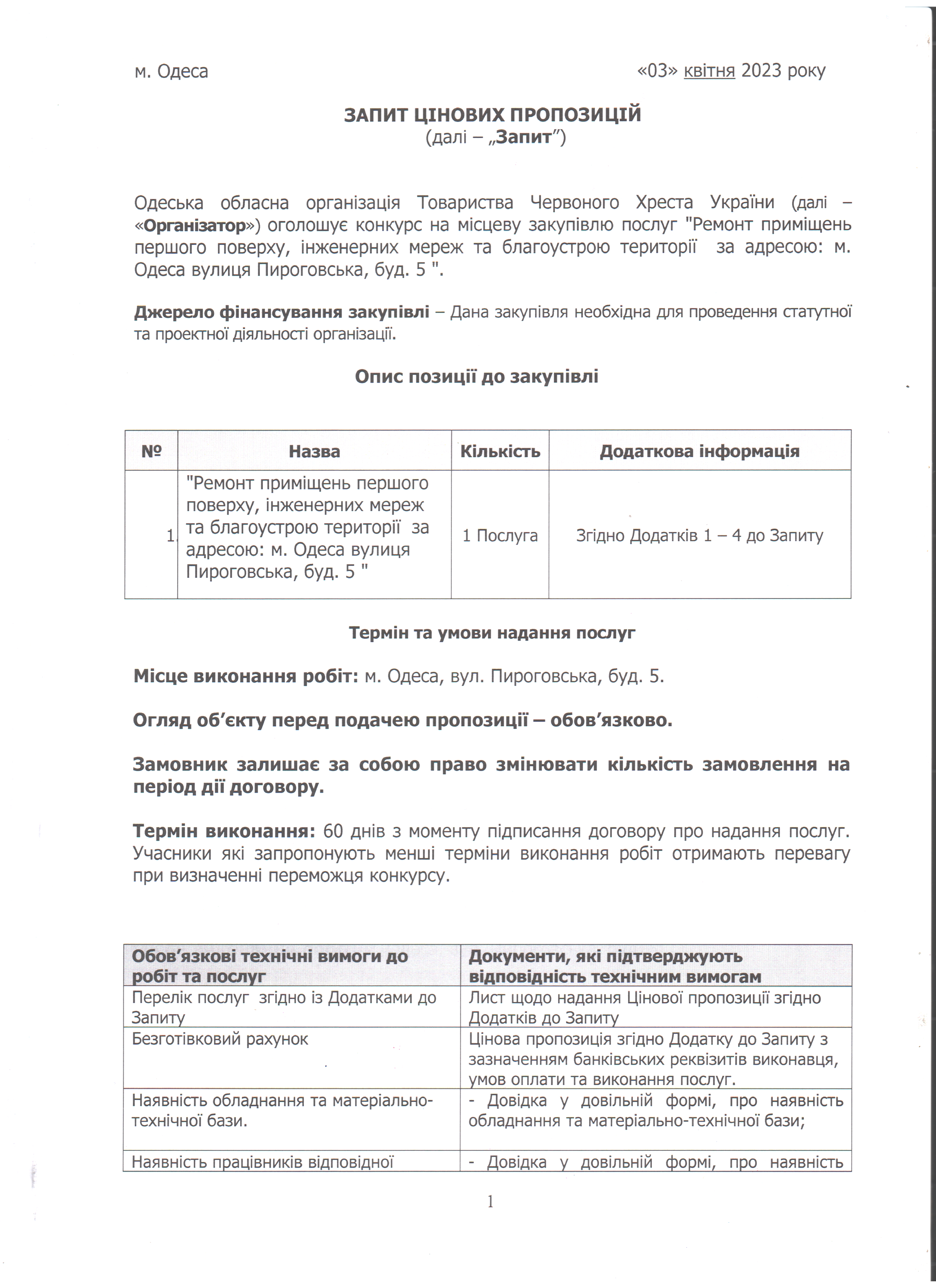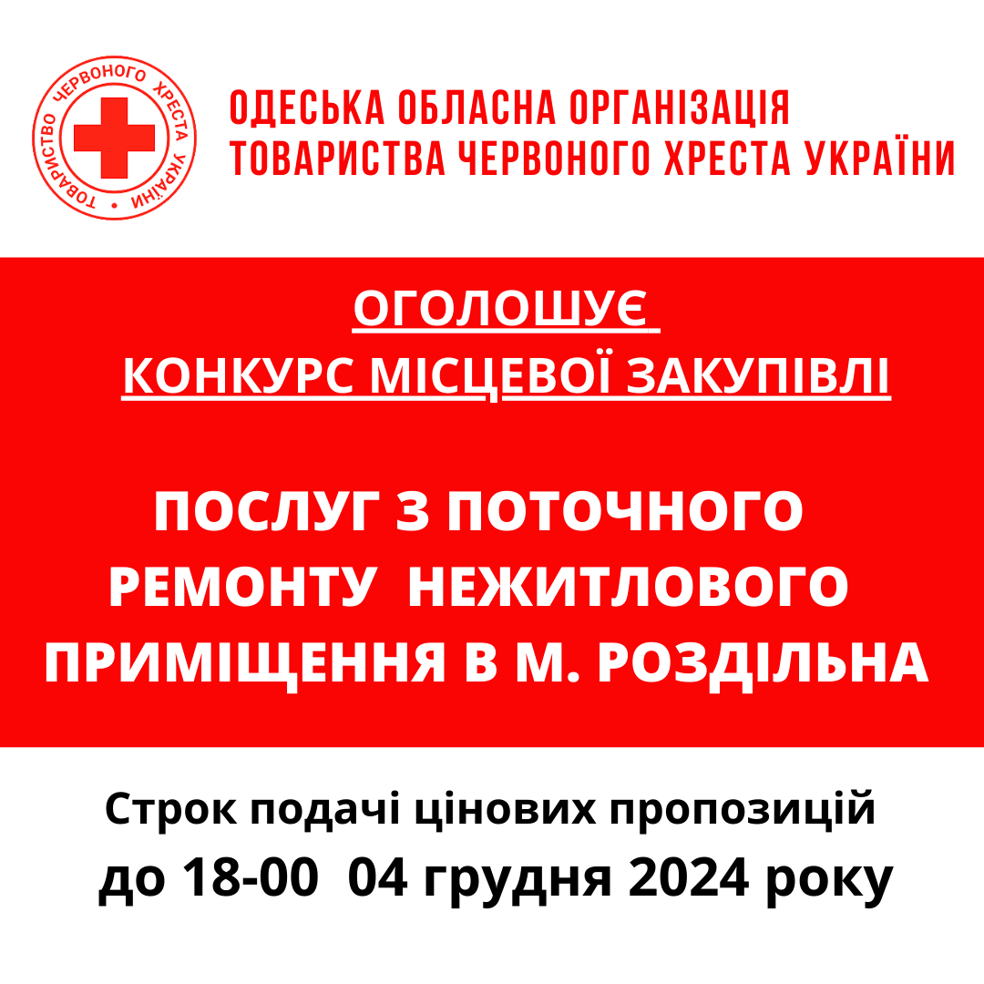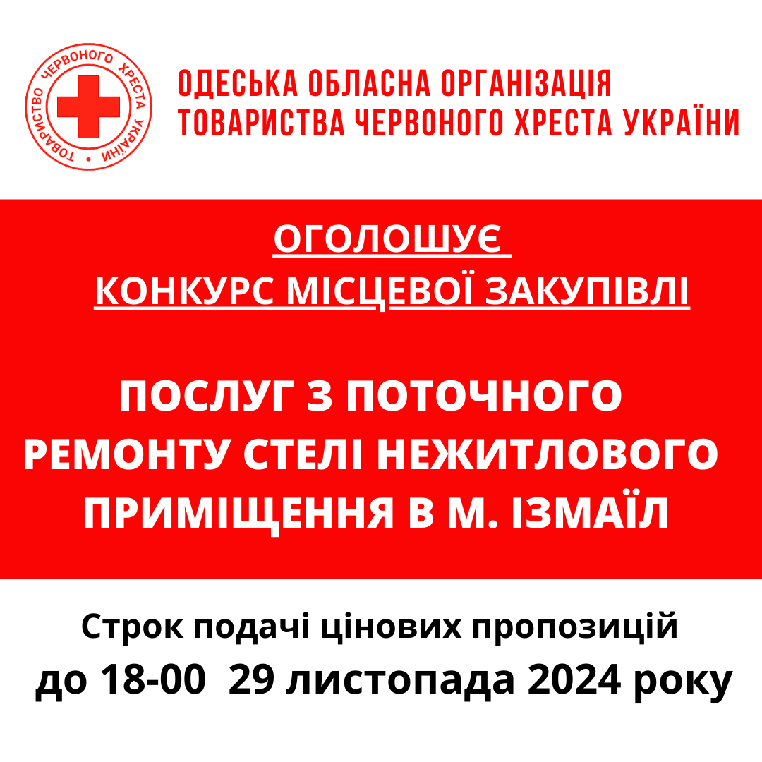 ГО «Одеська обласна організація Товариства Червоного Хреста України» оголошує конкурс місцевої закупівлі робіт з поточного ремонту приміщення у місті Одеса.