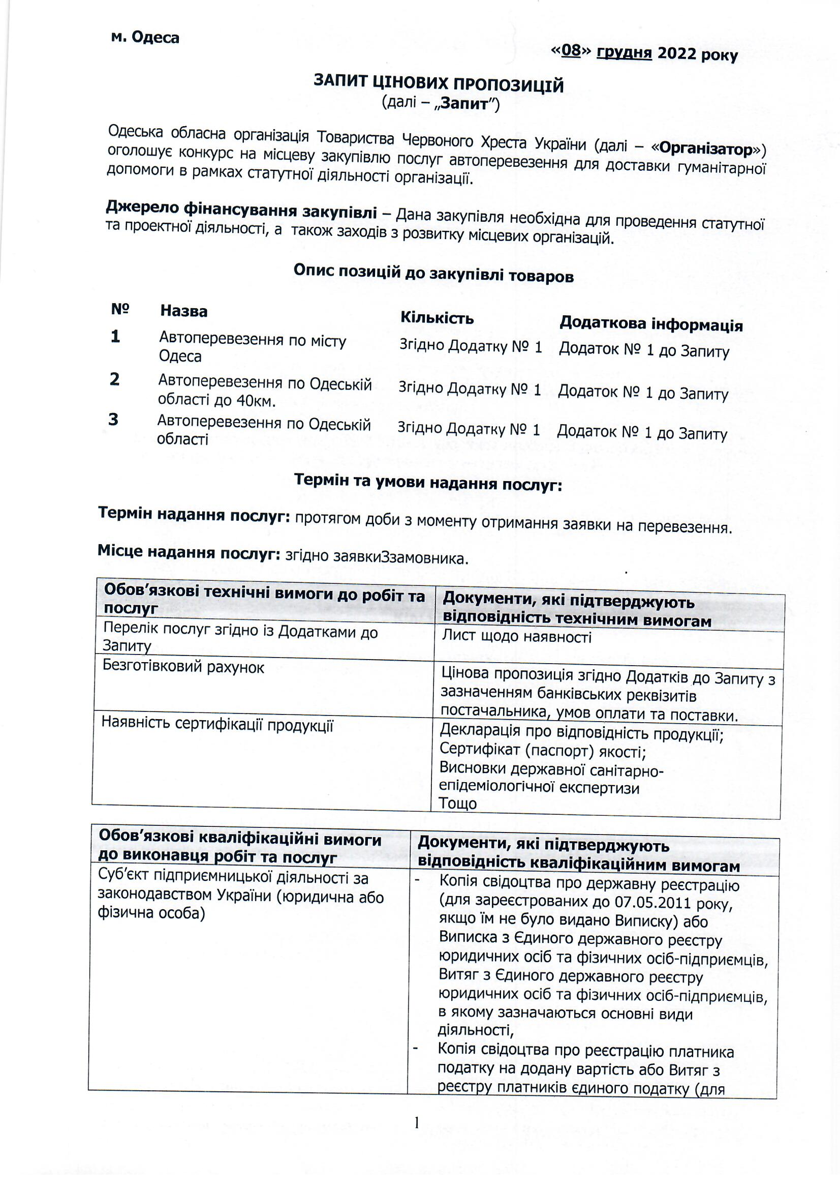 Одеська обласна організація Товариства Червоного Хреста України оголошує конкурс на місцеву закупівлю послуг автоперевезення для доставки гуманітарної допомоги в рамках статутної діяльності організації.