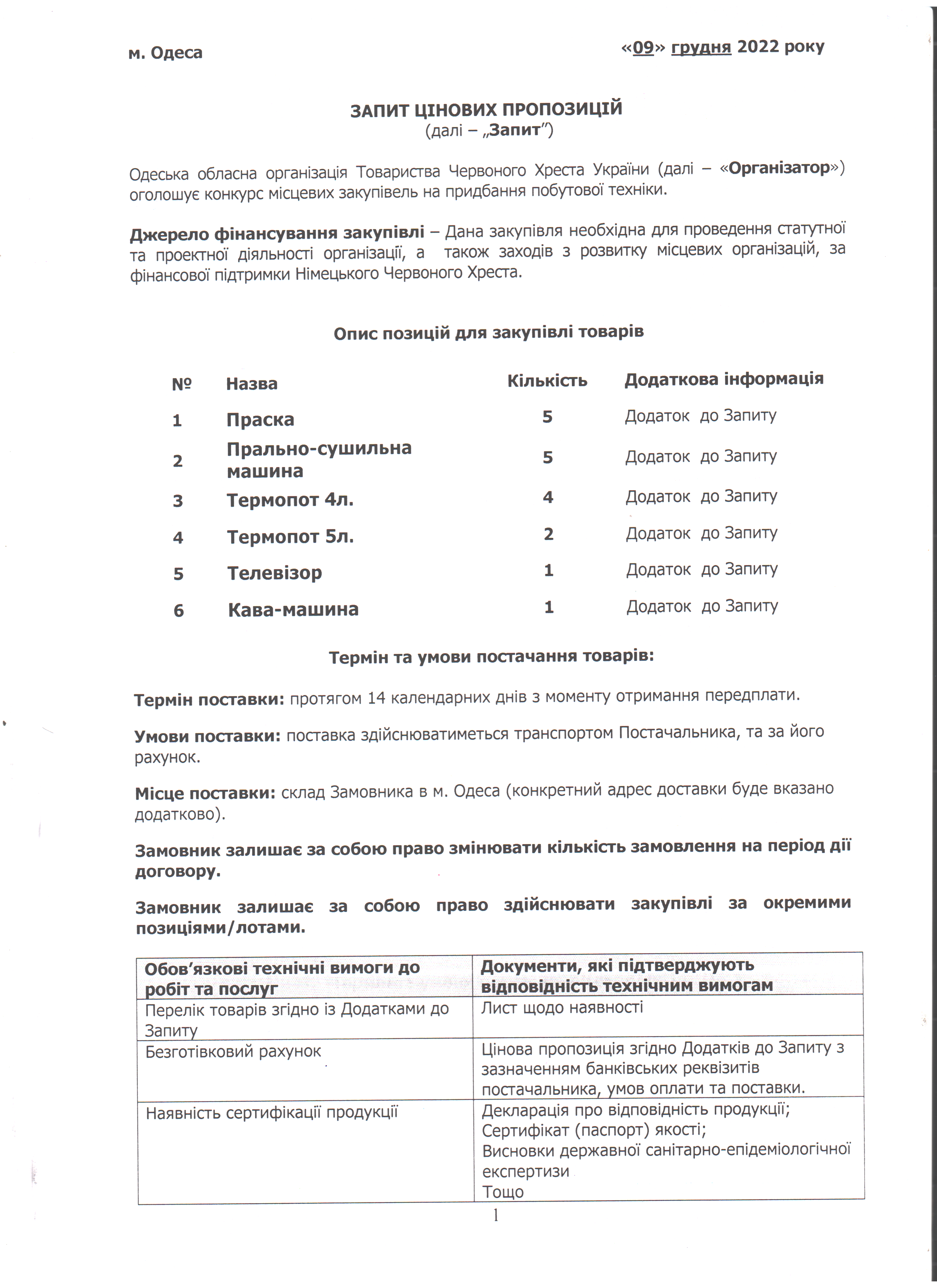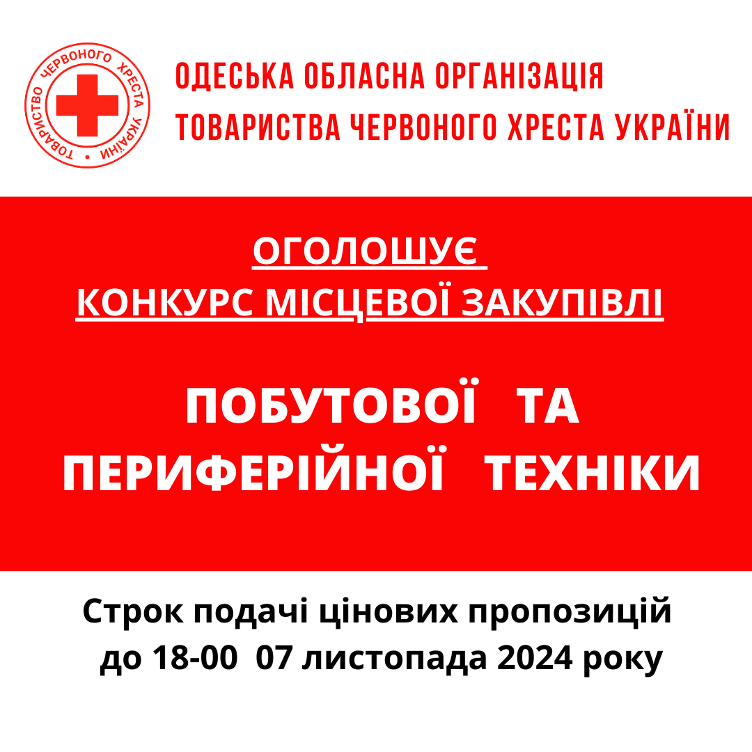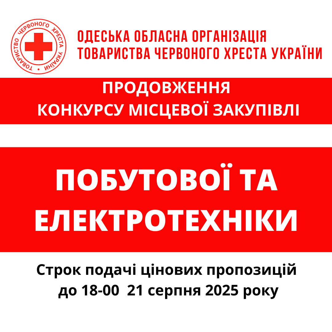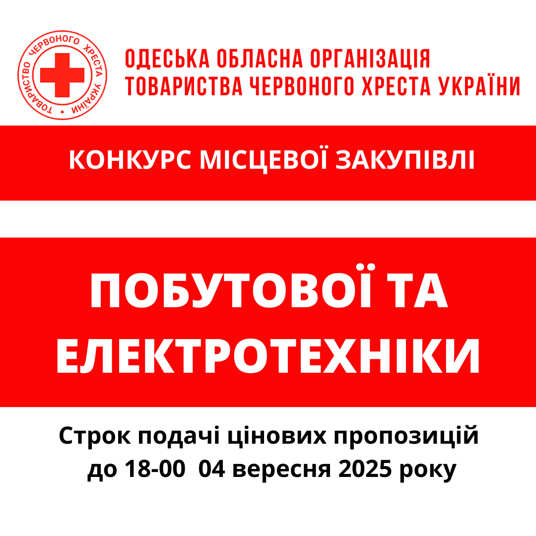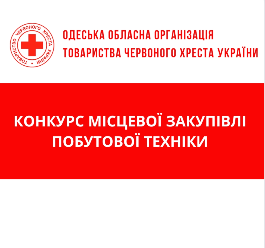 Одеська обласна організація Товариства Червоного Хреста України оголошує конкурс місцевих закупівель на придбання побутової техніки.