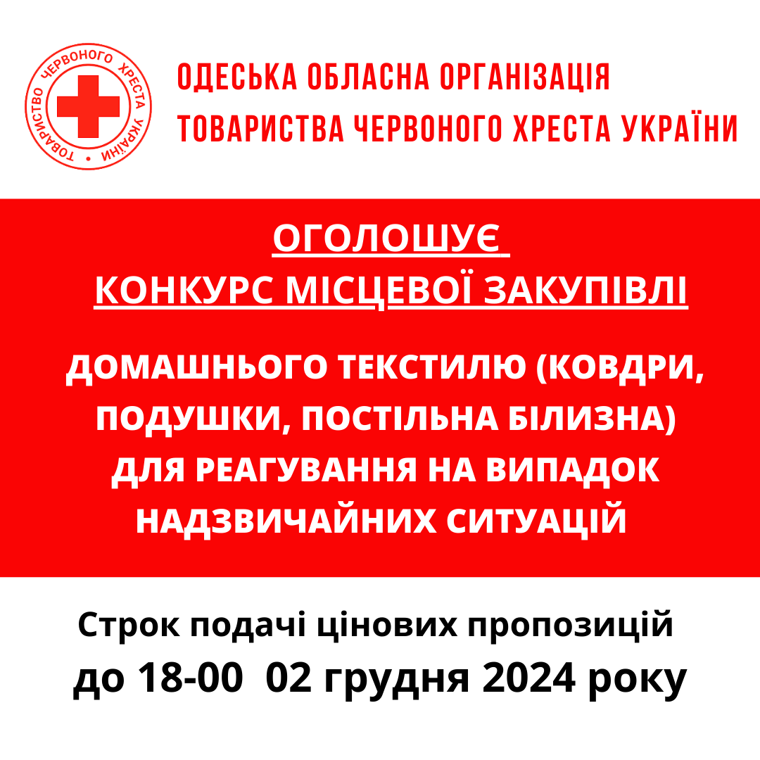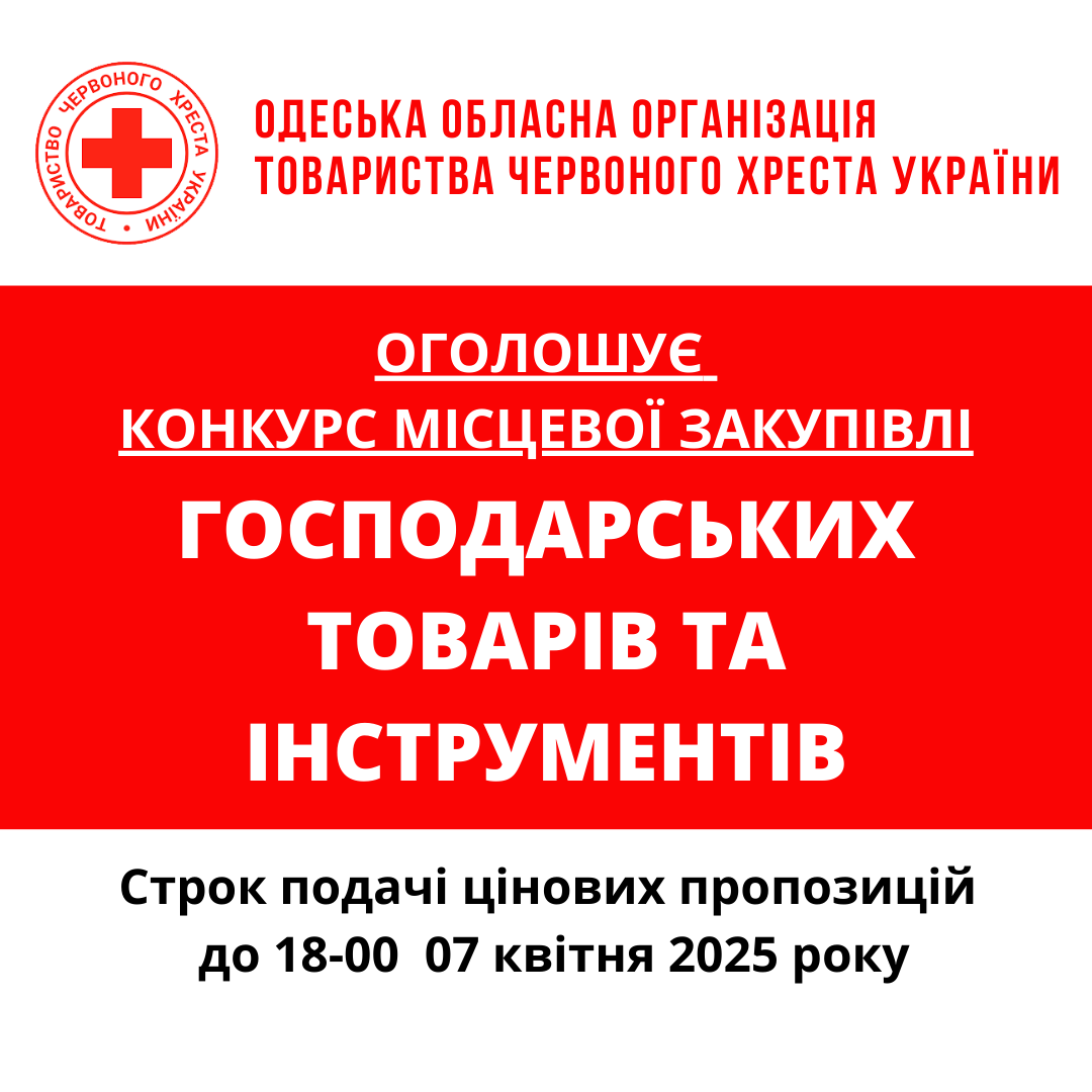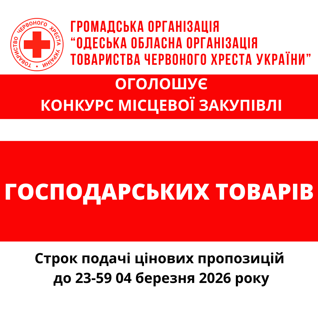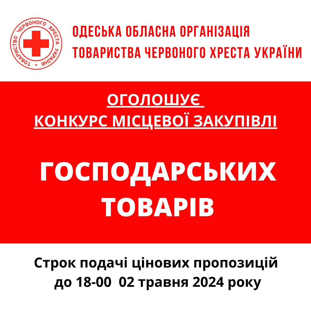 ГО «Одеська обласна організація Товариства Червоного Хреста України» оголошує конкурс місцевої закупівлі господарських товарів.
