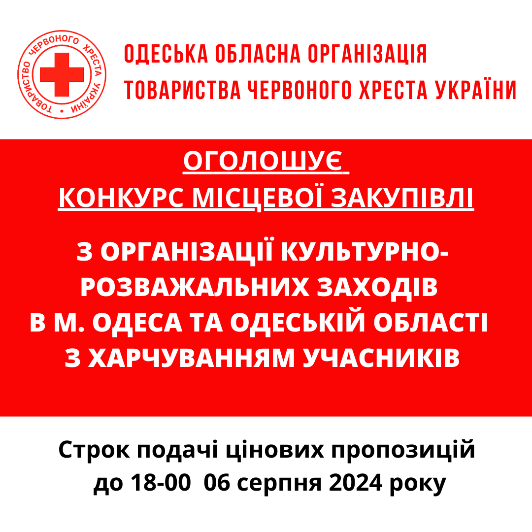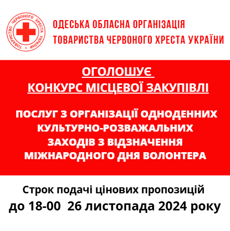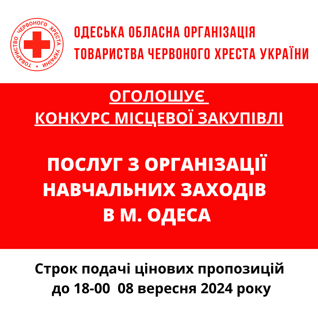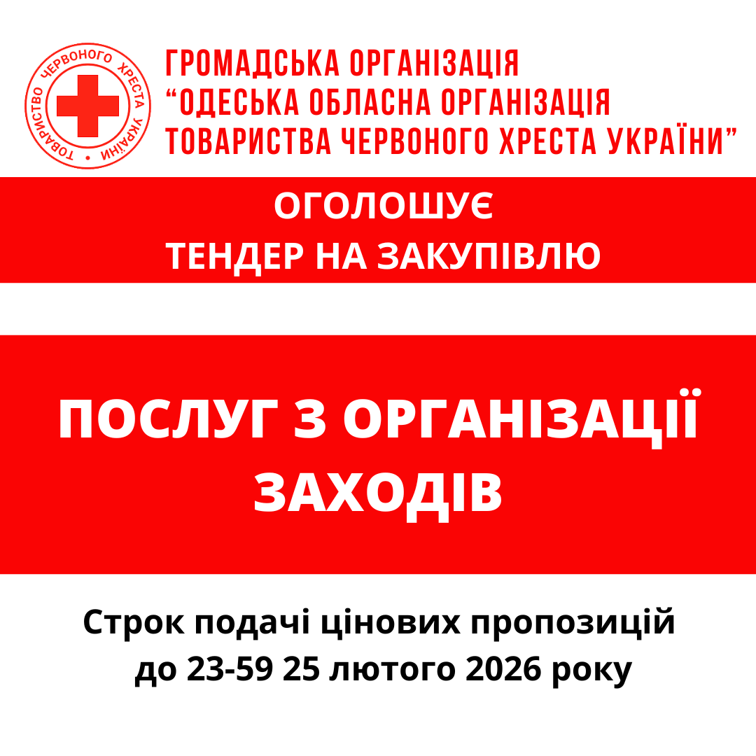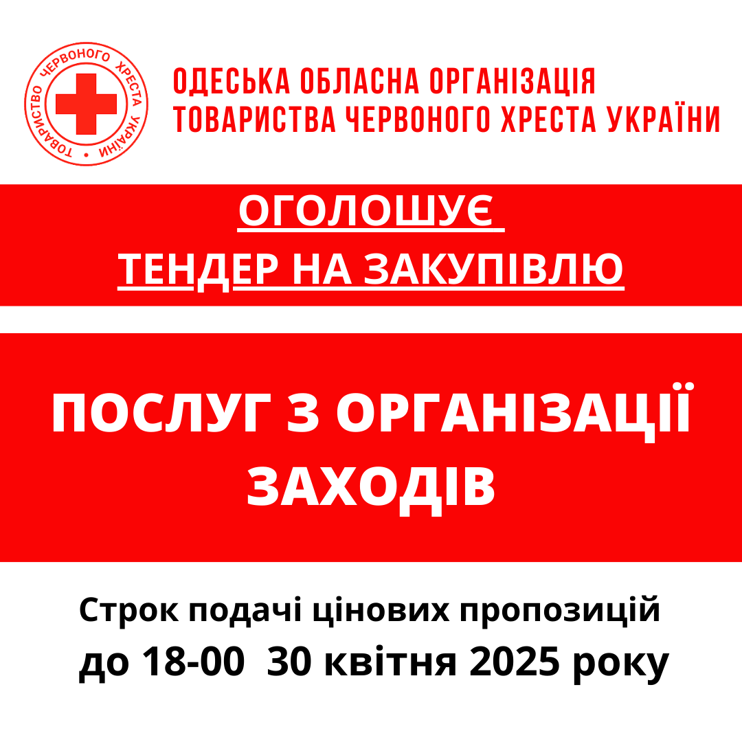 ГО «Одеська обласна організація Товариства Червоного Хреста України» оголошує тендер на закупівлю послуг з організації заходів.