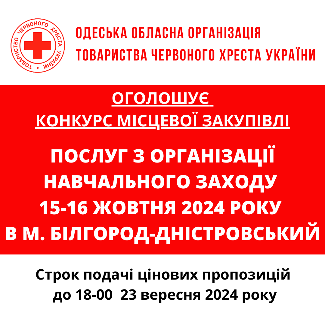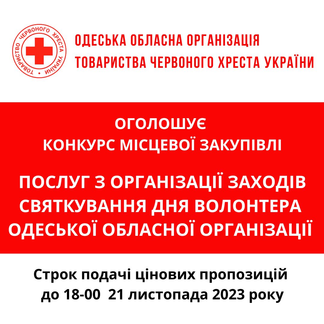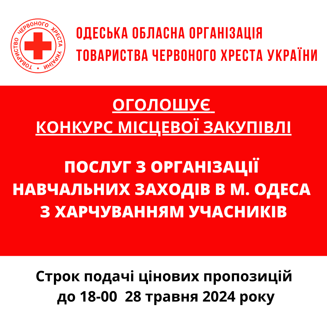 ГО «Одеська обласна організація Товариства Червоного Хреста України» оголошує тендер на закупівлю послуг з організації заходів.