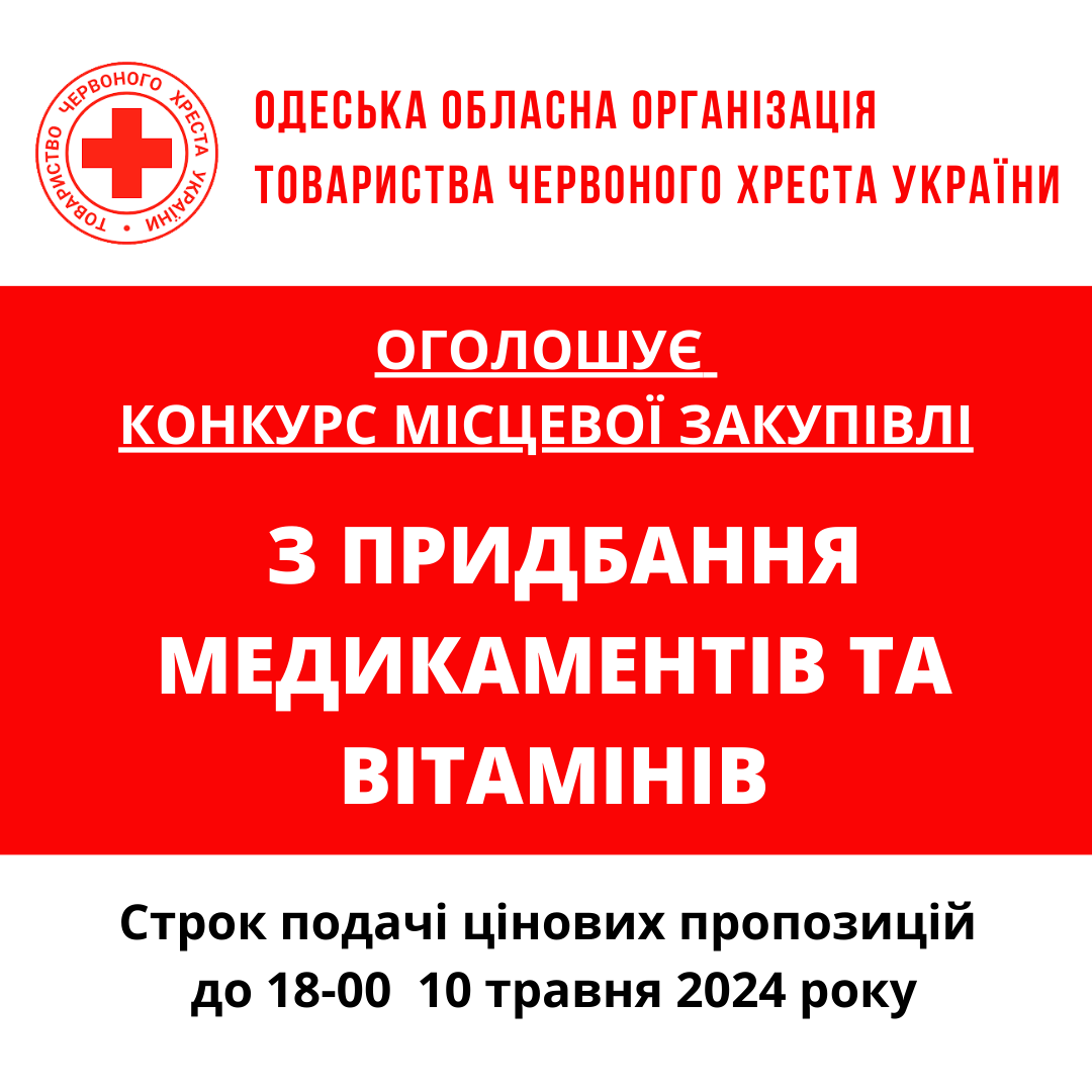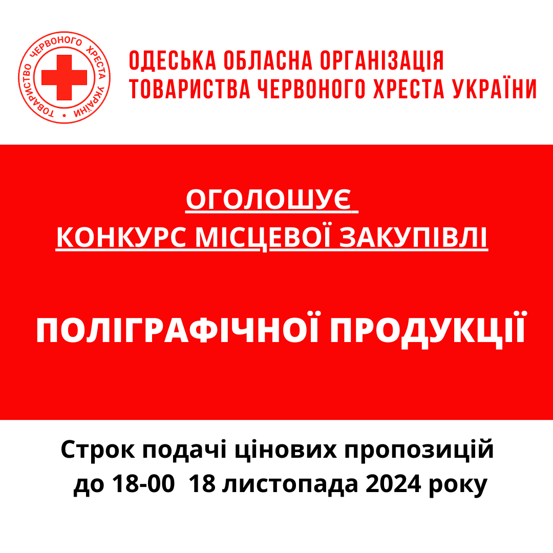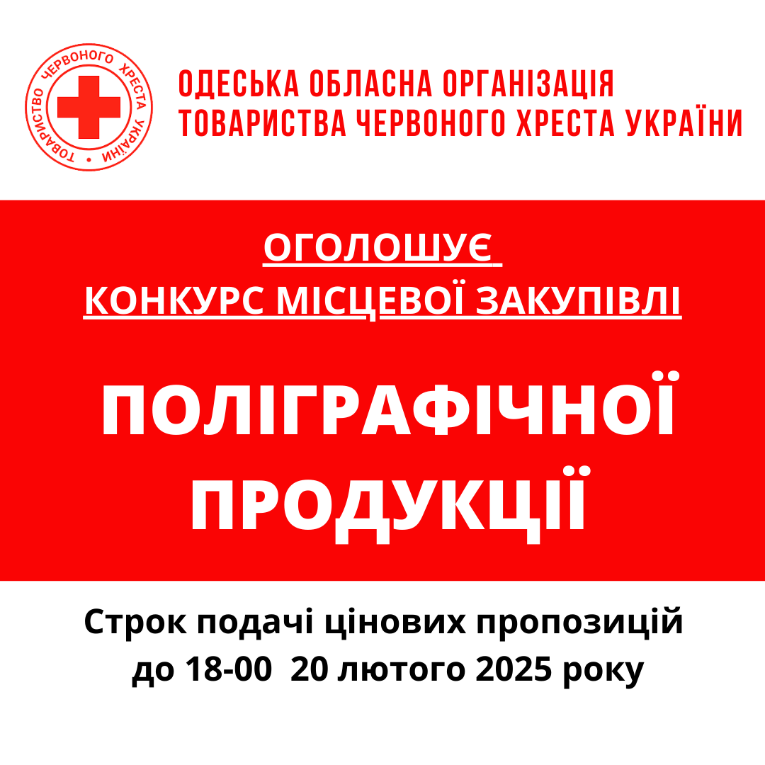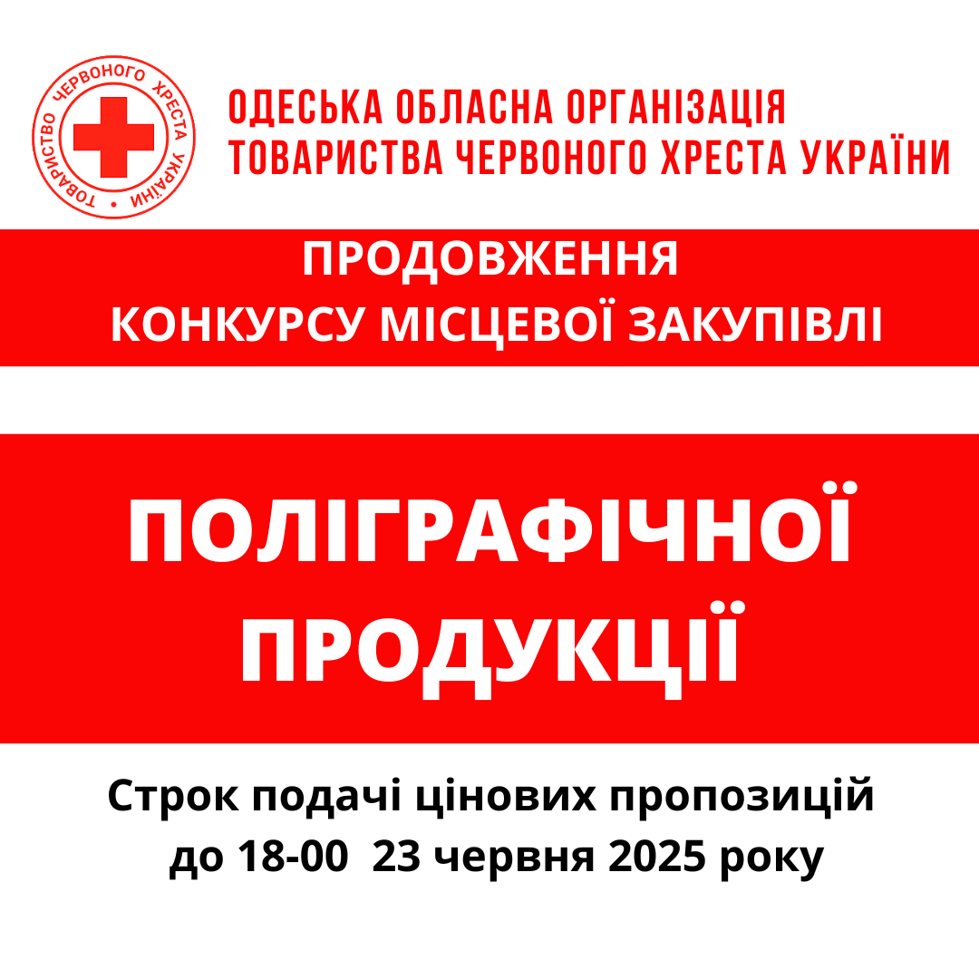 ГО «Одеська обласна організація Товариства Червоного Хреста України» оголошує конкурс місцевої закупівлі поліграфічної продукції.