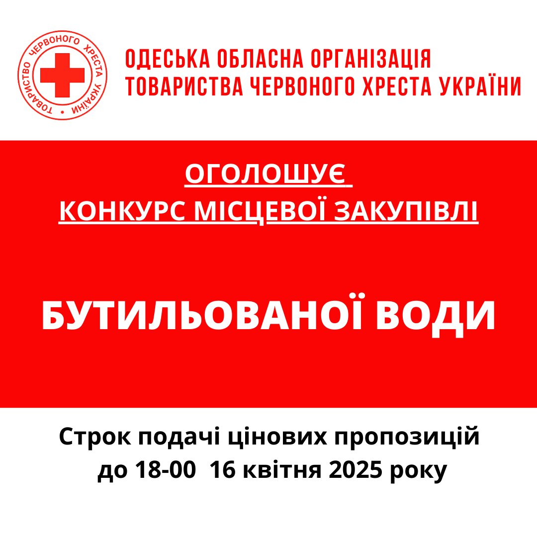ГО «Одеська обласна організація Товариства Червоного Хреста України» оголошує конкурс місцевої закупівлі бутильованої води.