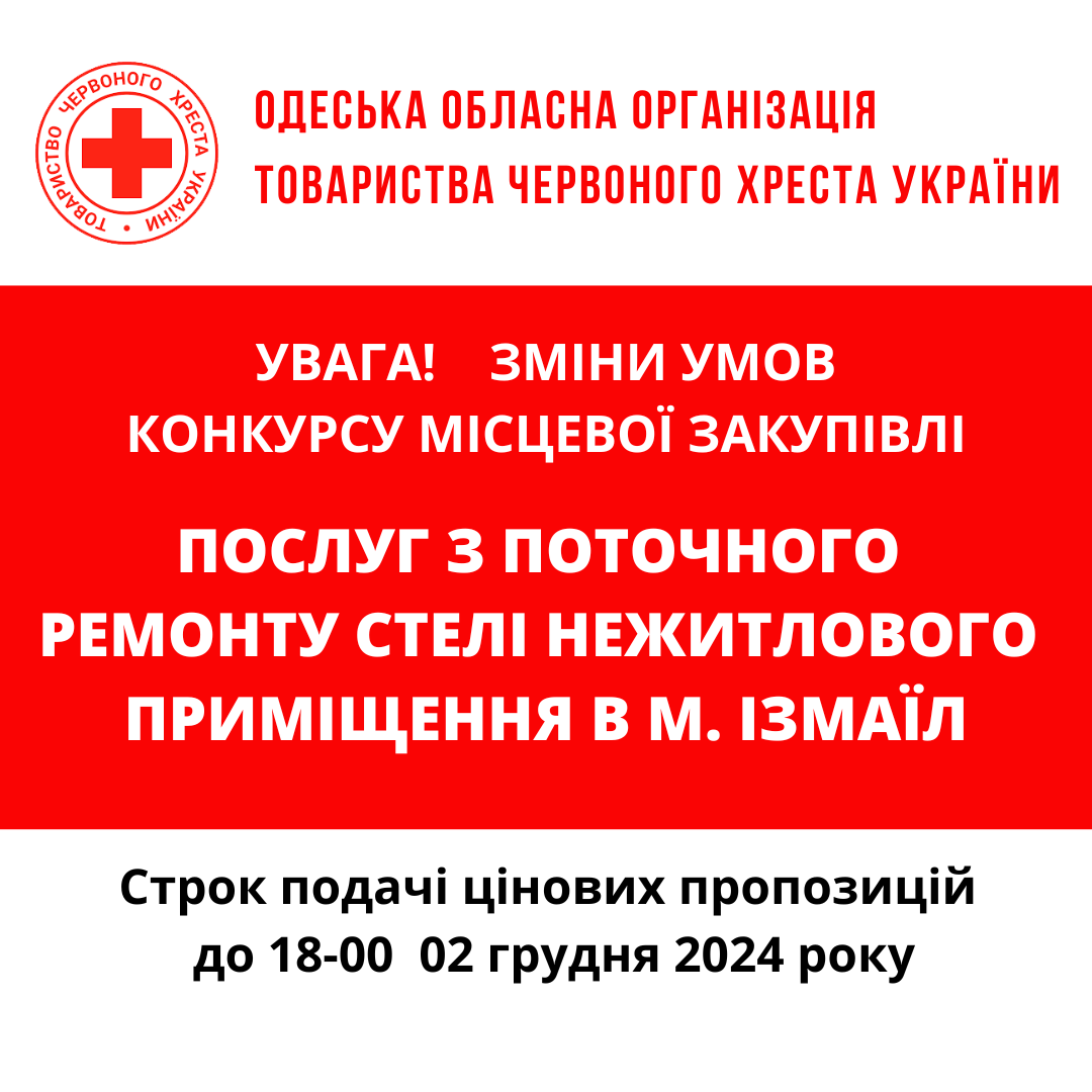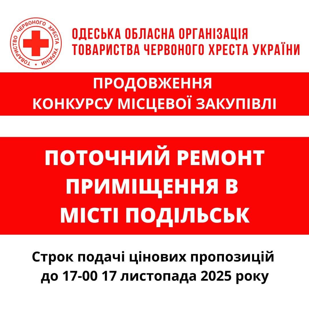 ГО «Одеська обласна організація Товариства Червоного Хреста України» оголошує подовження конкурсу місцевої закупівлі робіт з поточного ремонту у місті Подільськ.