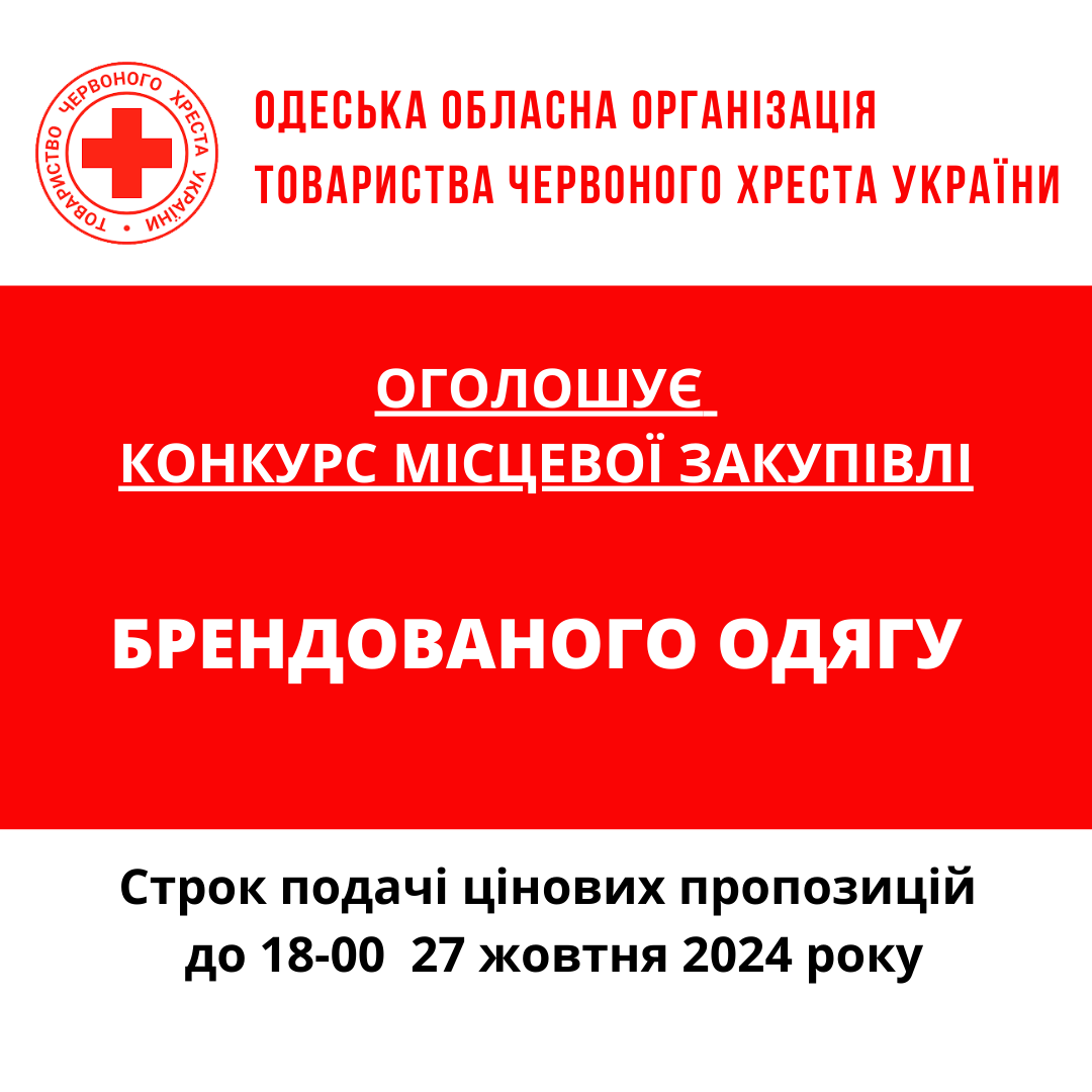 Одеська обласна організація Товариства Червоного Хреста України оголошує конкурс місцевих закупівель на виготовлення брендованої продукції для візуалізації діяльності «Догляд вдома Товариства Червоного Хреста України».