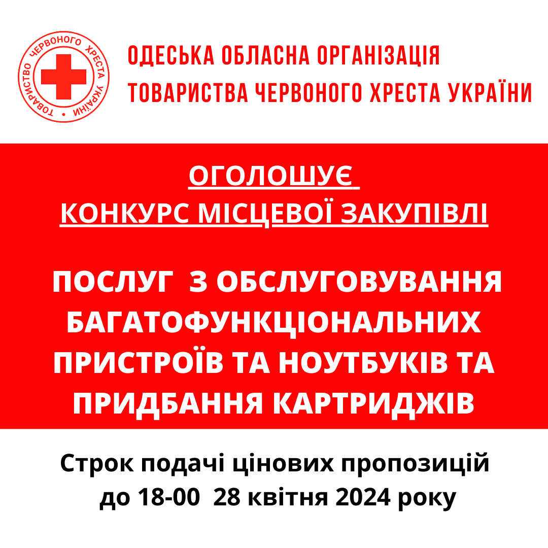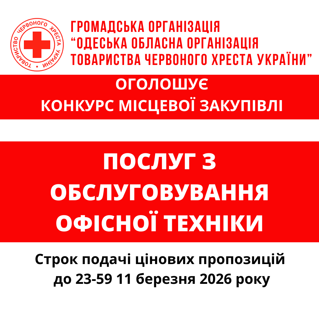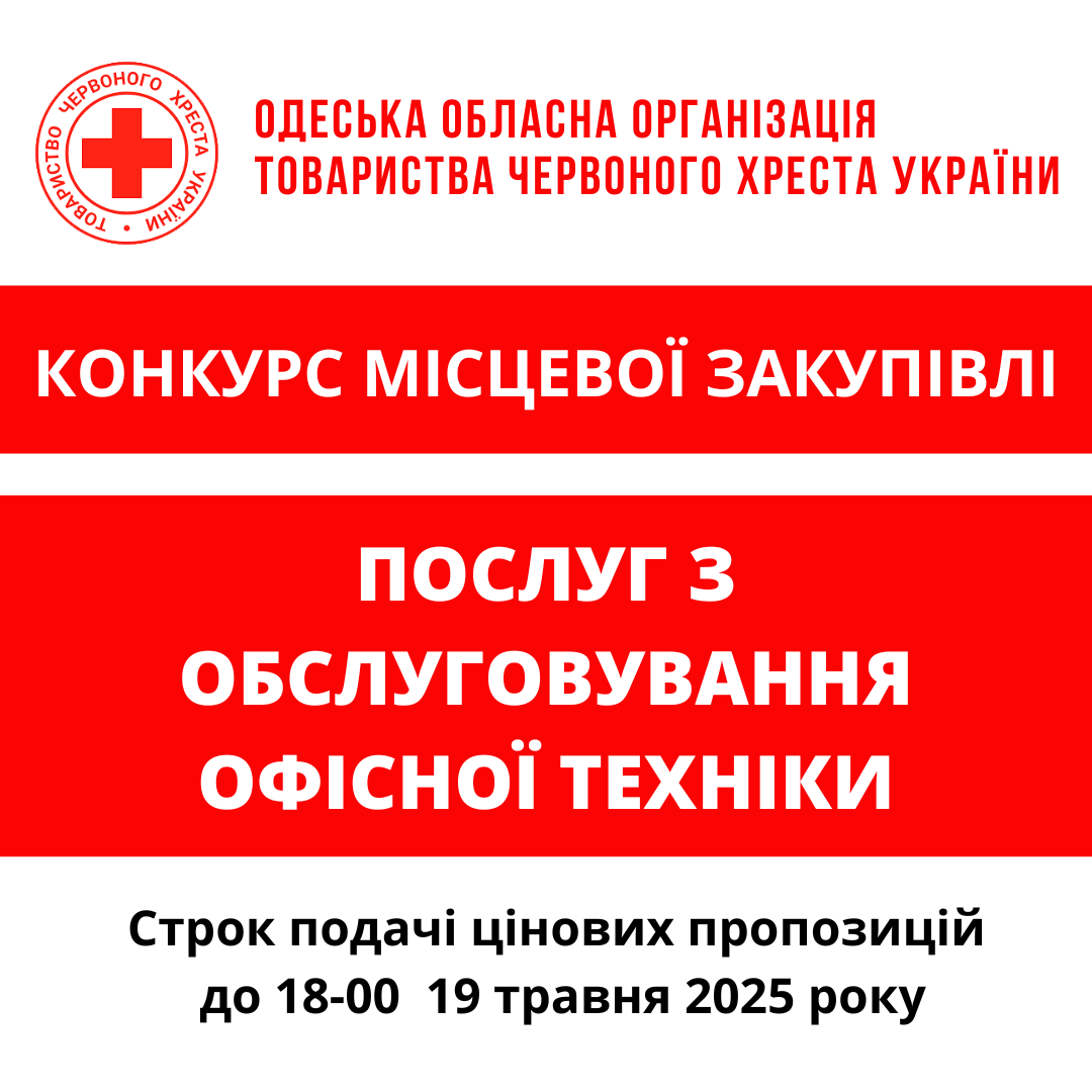 ГО «Одеська обласна організація Товариства Червоного Хреста України» оголошує конкурс місцевої закупівлі послуг з обслуговування офісної техніки.