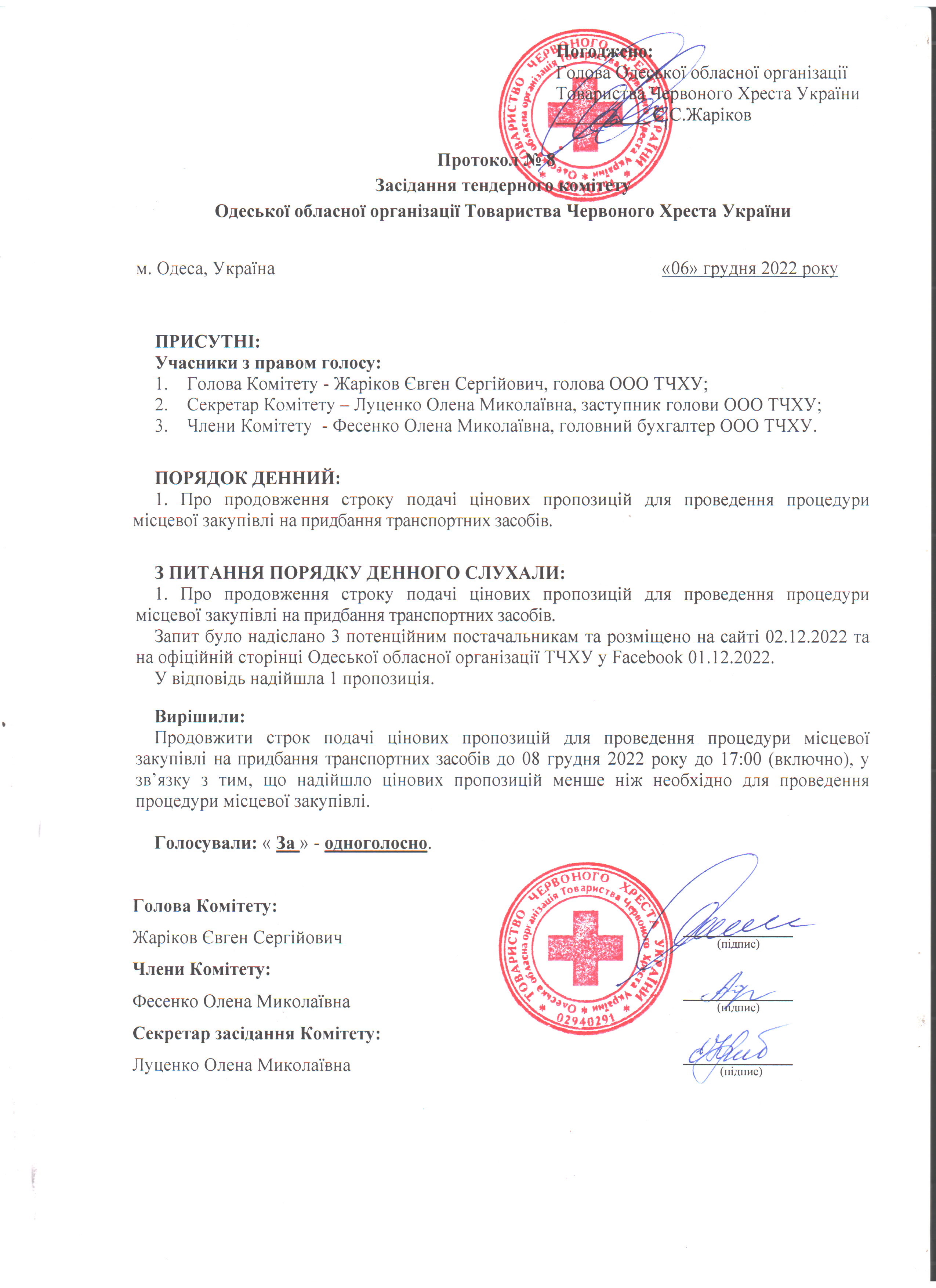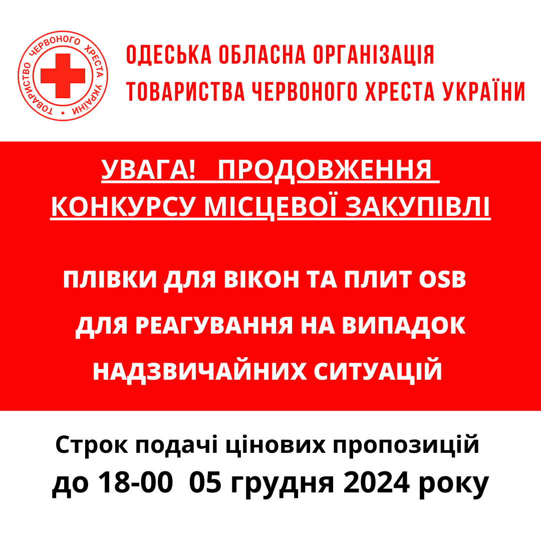 Одеська обласна організація Товариства Червоного Хреста України повідомляє, про продовження строку подачі цінових пропозицій для проведення процедури місцевої закупівлі на придбання транспортних засобів