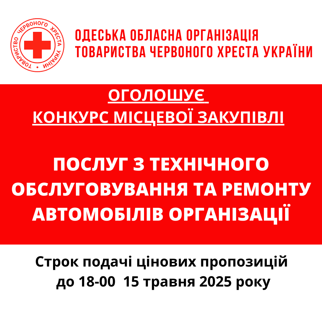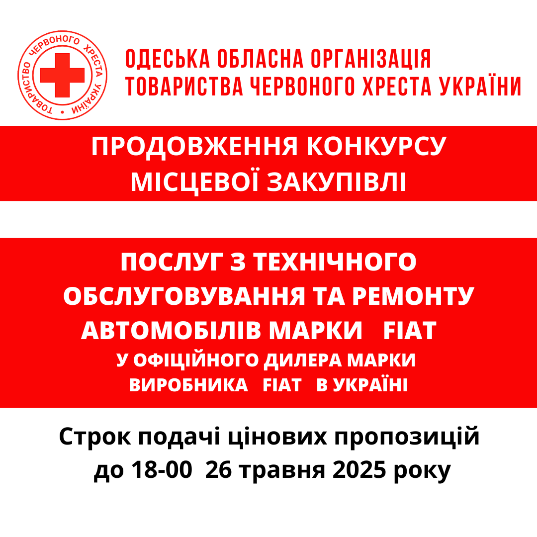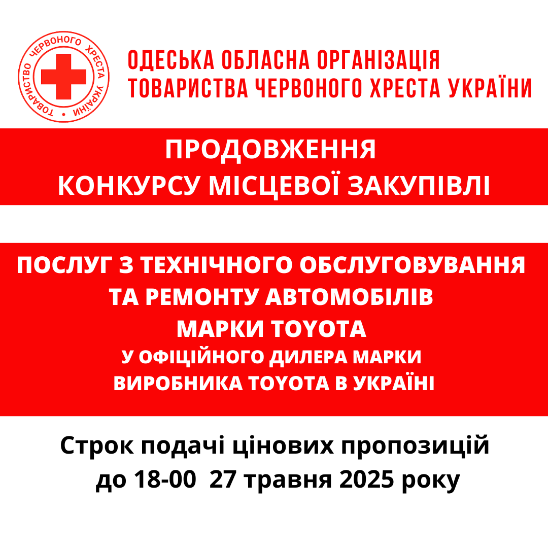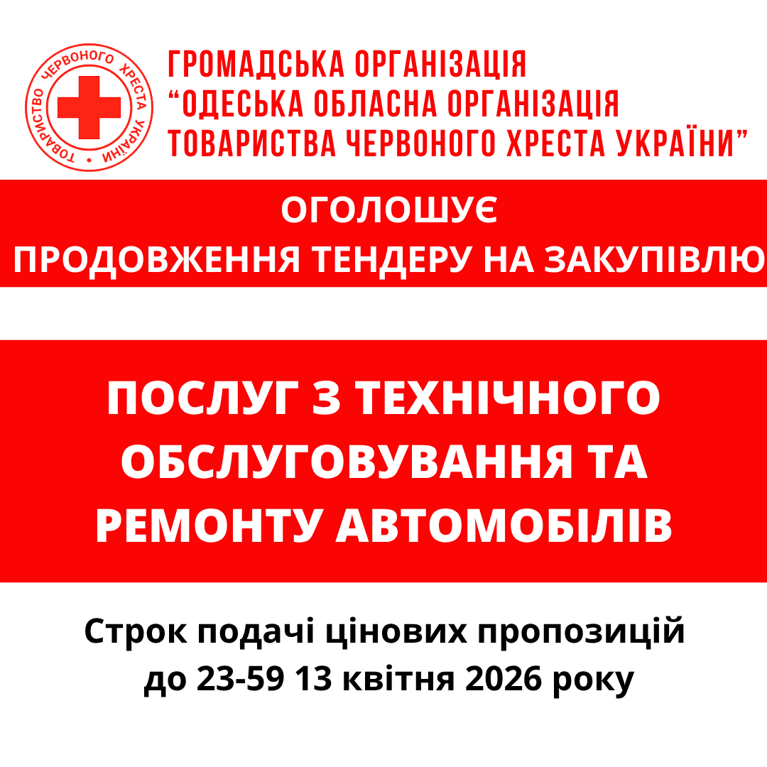 ГО «Одеська обласна організація Товариства Червоного Хреста України» оголошує продовження тендеру на закупівлю послуг з технічного обслуговування та ремонту автомобілів.