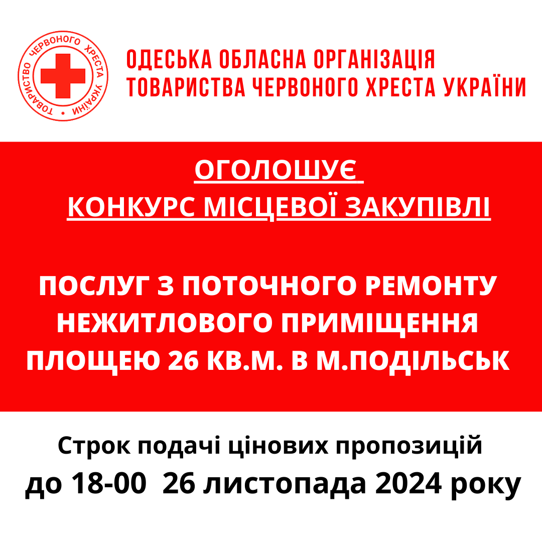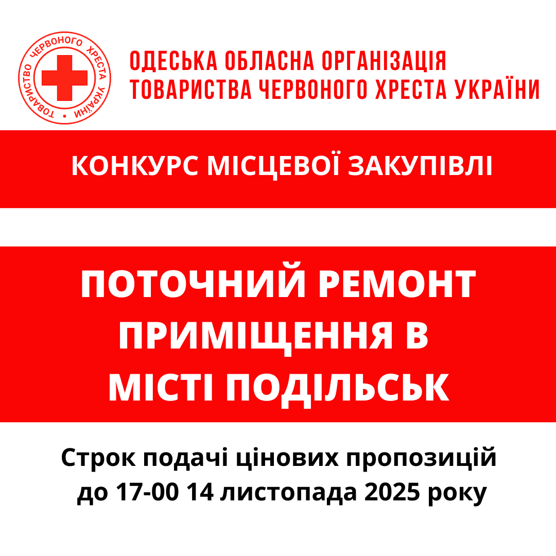 ГО «Одеська обласна організація Товариства Червоного Хреста України» оголошує конкурс місцевої закупівлі робіт з поточного ремонту приміщення у місті Подільськ.