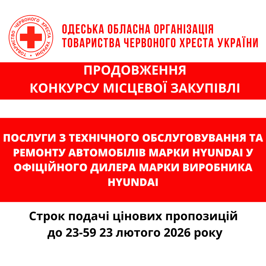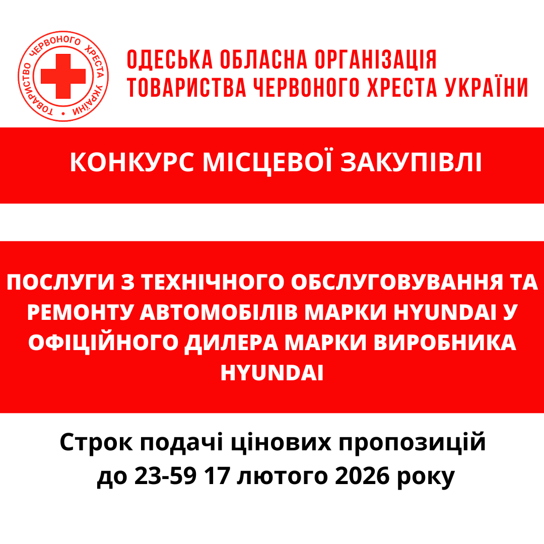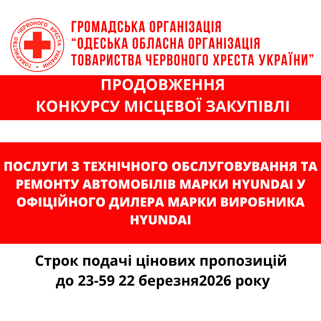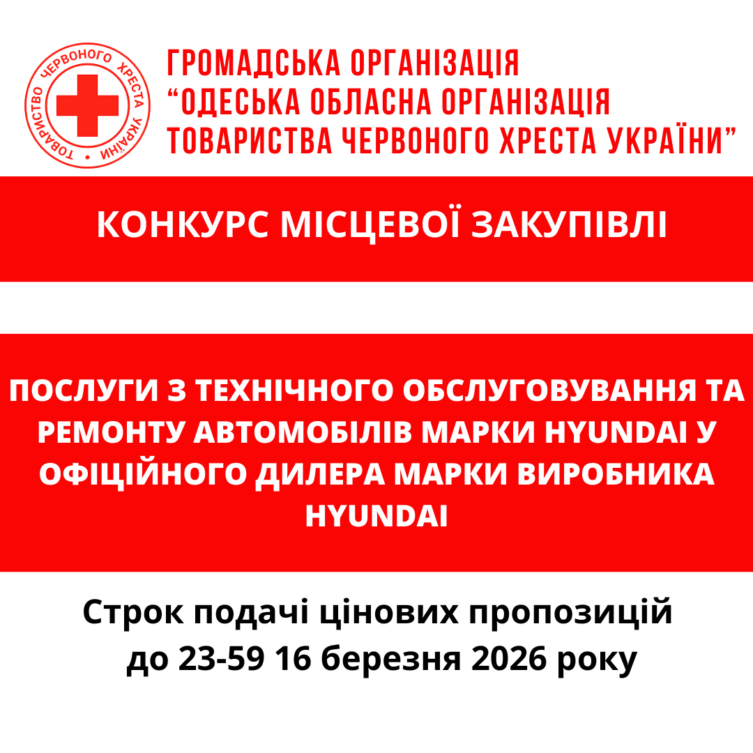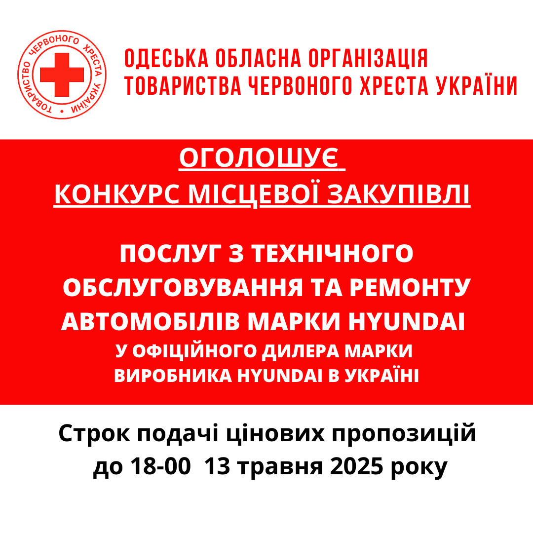 ГО «Одеська обласна організація Товариства Червоного Хреста України» оголошує конкурс місцевої закупівлі послуг з технічного обслуговування та ремонту автомобілів марки Hyundai у офіційного дилера марки виробника Hyundai.