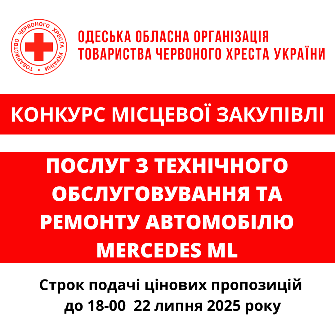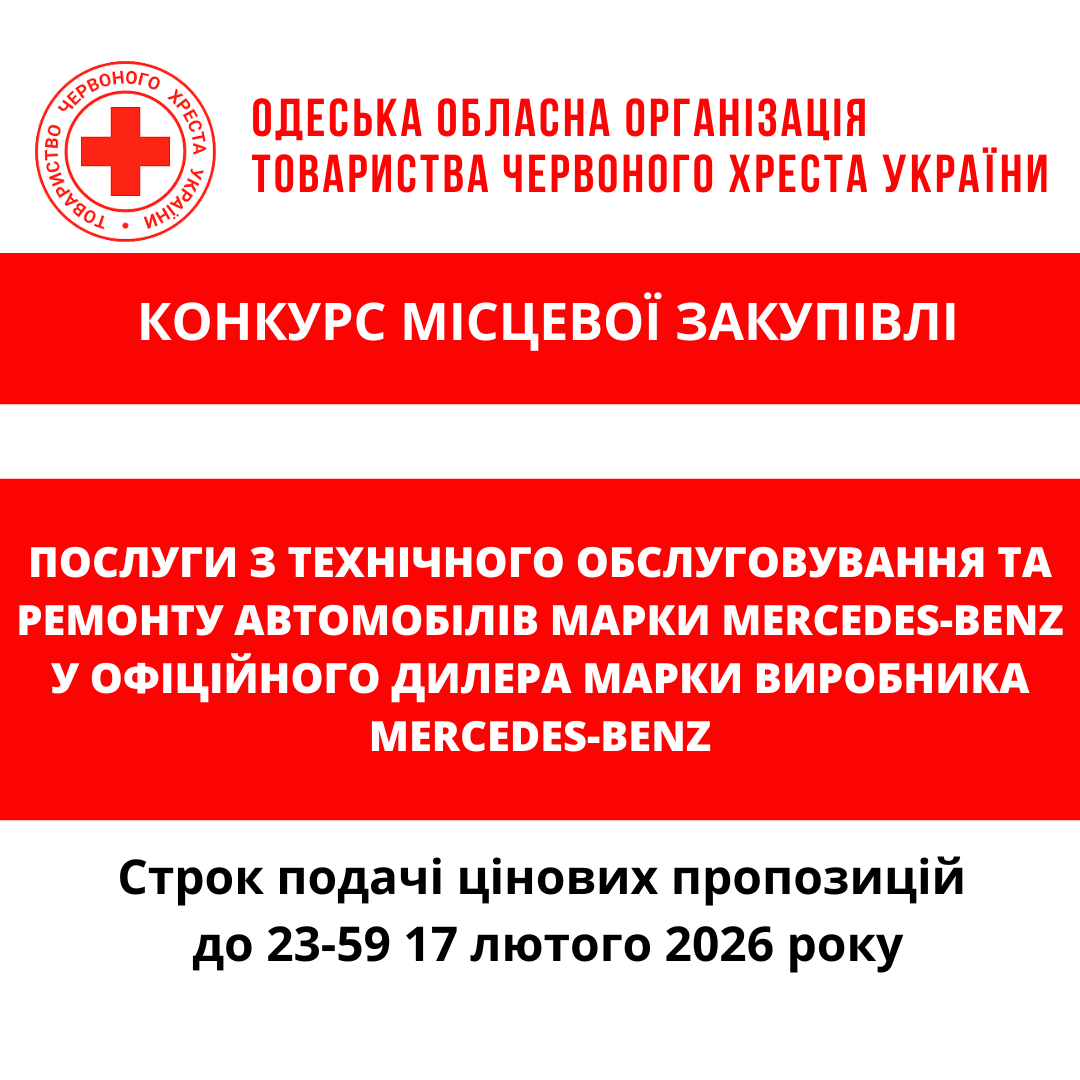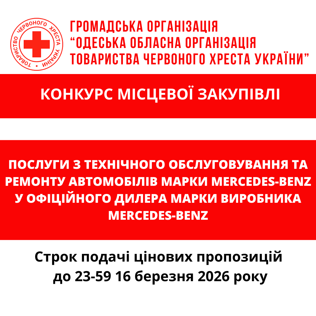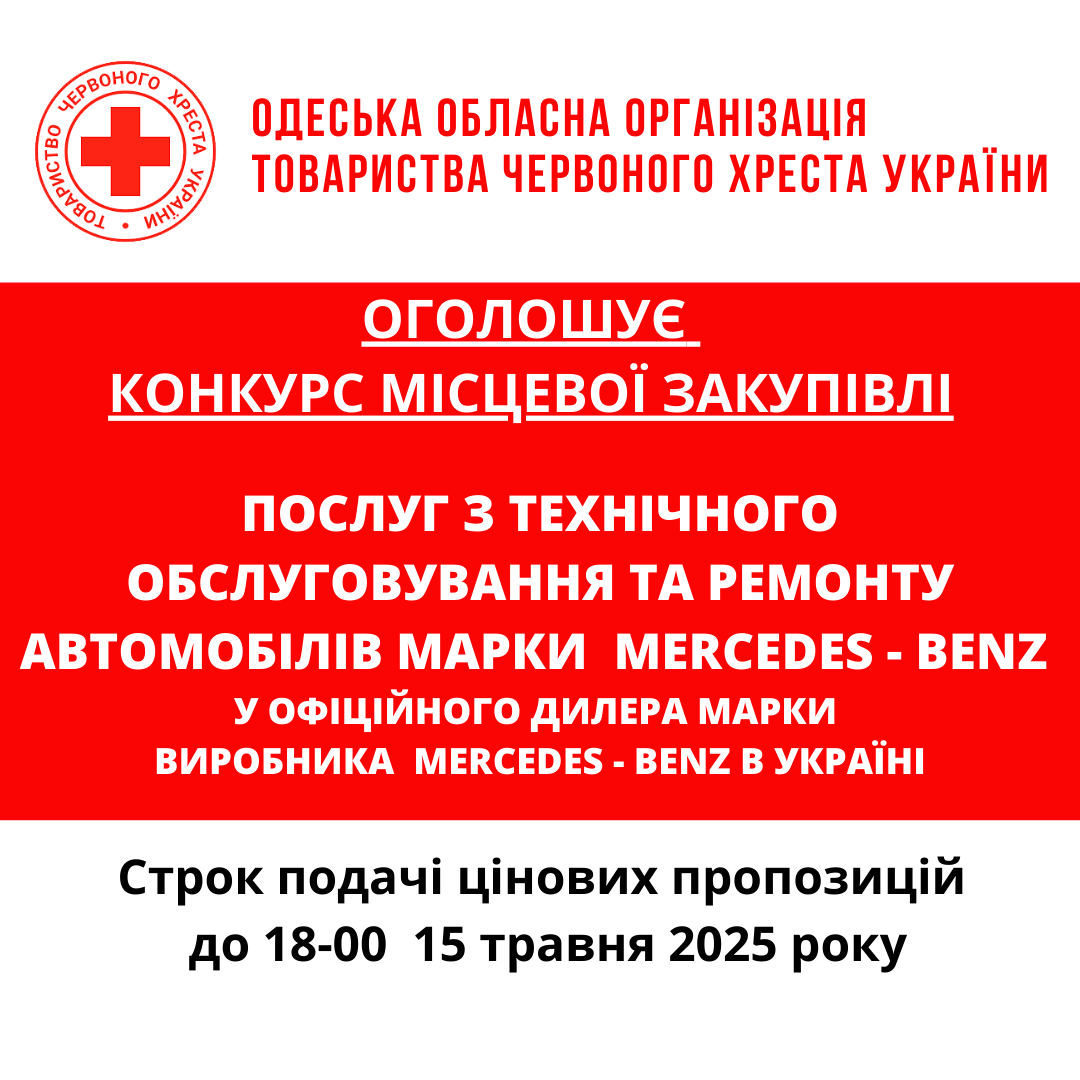 ГО «Одеська обласна організація Товариства Червоного Хреста України» оголошує конкурс місцевої закупівлі послуг з технічного обслуговування та ремонту автомобілів марки Mercedes-Benz у офіційного дилера марки виробника Mercedes-Benz.