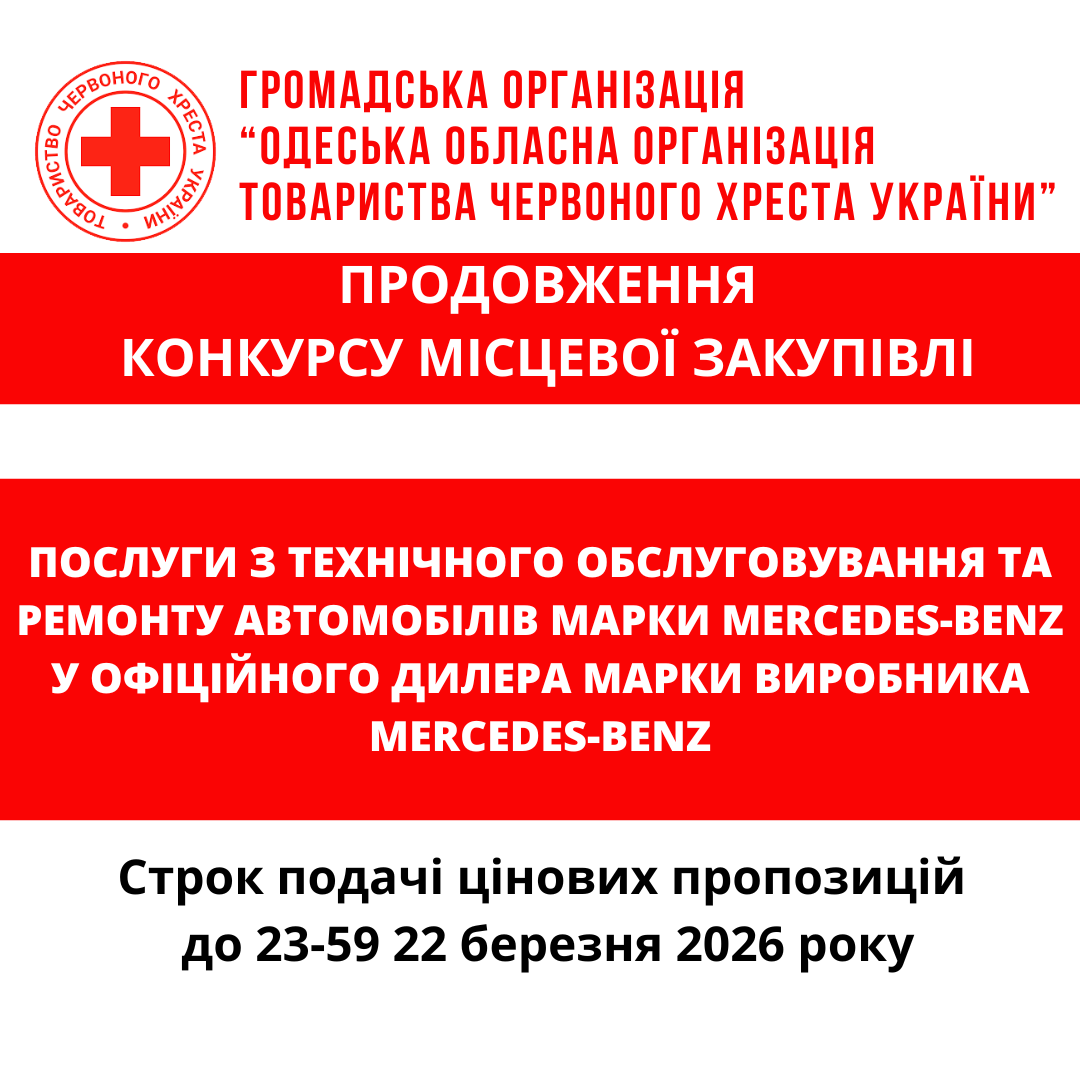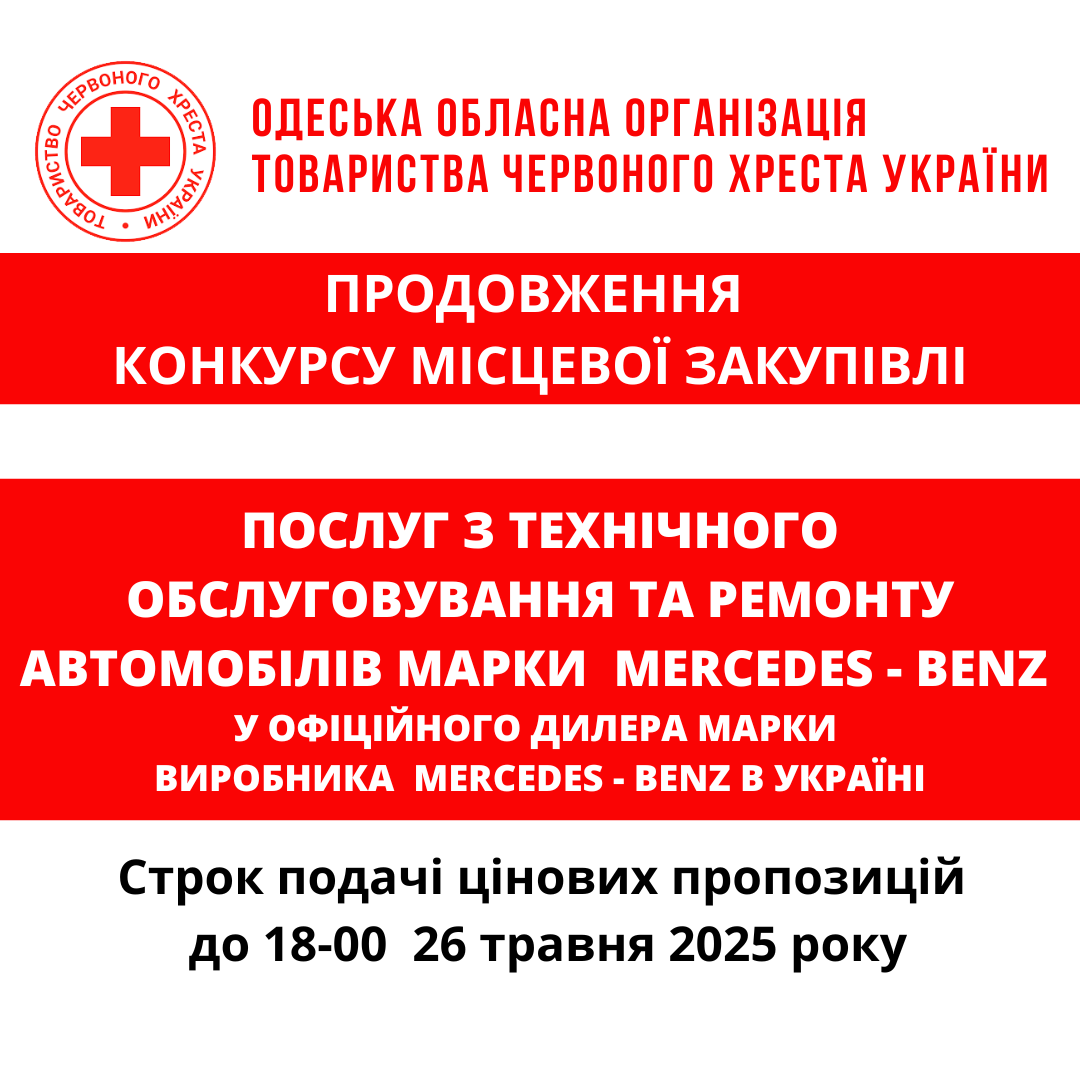 ГО «Одеська обласна організація Товариства Червоного Хреста України» оголошує ПРОДОВЖЕННЯ конкурсу місцевої закупівлі послуг з ТО та ремонту автомобілів марки Mercedes-Benz у офіційного дилера марки виробника Mercedes-Benz.