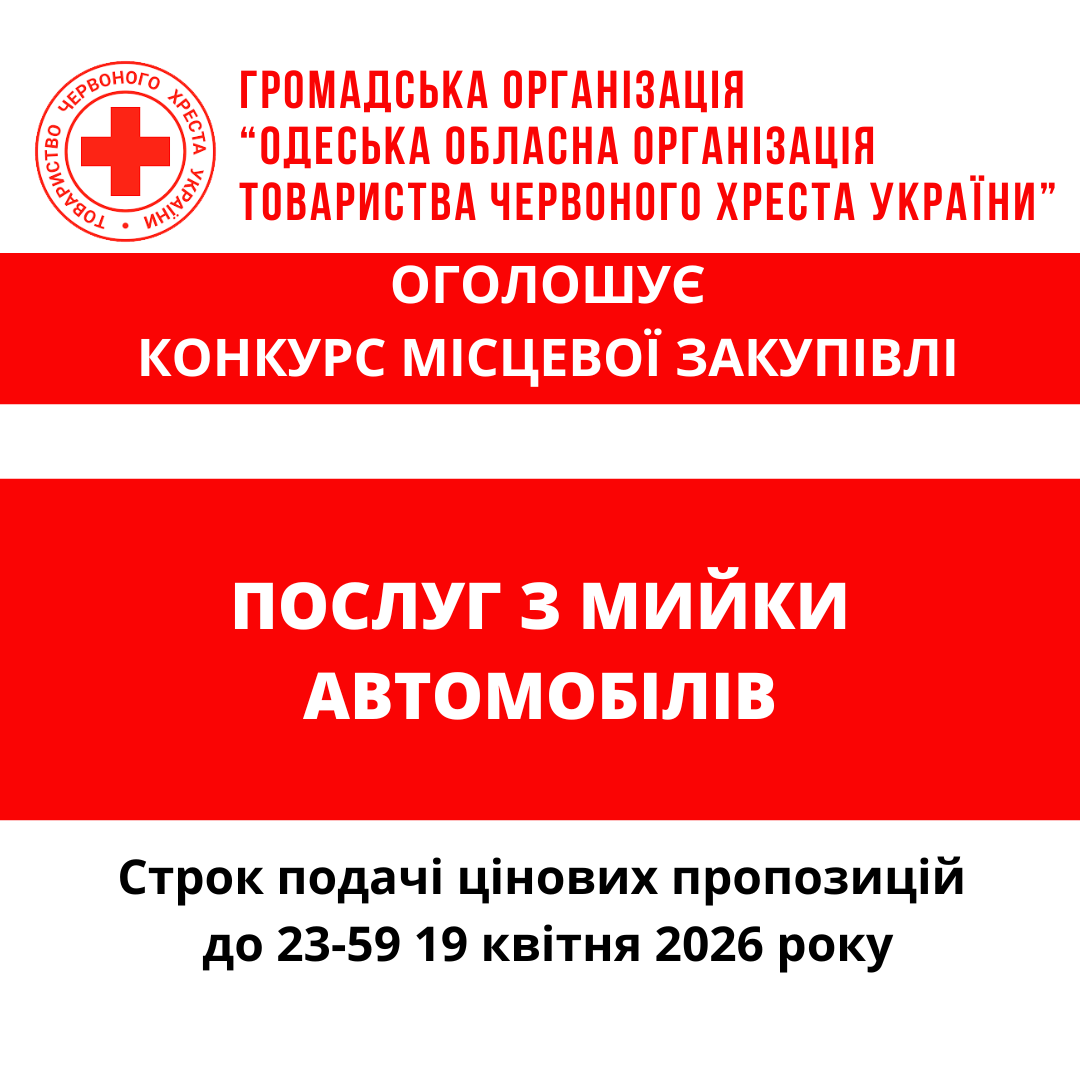 ГО «Одеська обласна організація Товариства Червоного Хреста України» оголошує конкурс місцевої закупівлі послуг з мийки автомобілів.