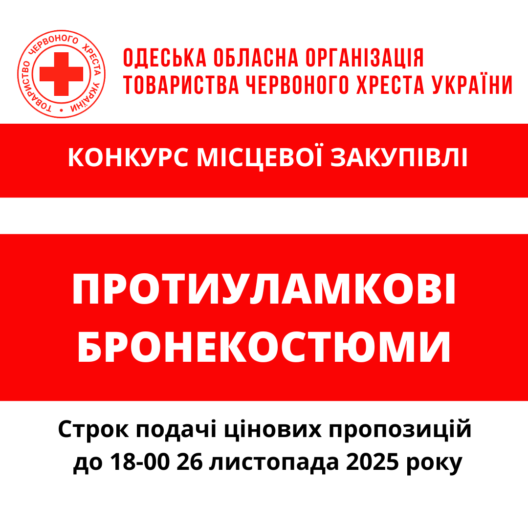 ГО «Одеська обласна організація Товариства Червоного Хреста України» оголошує конкурс на місцеву закупівлю протиуламкових бронекостюмів.