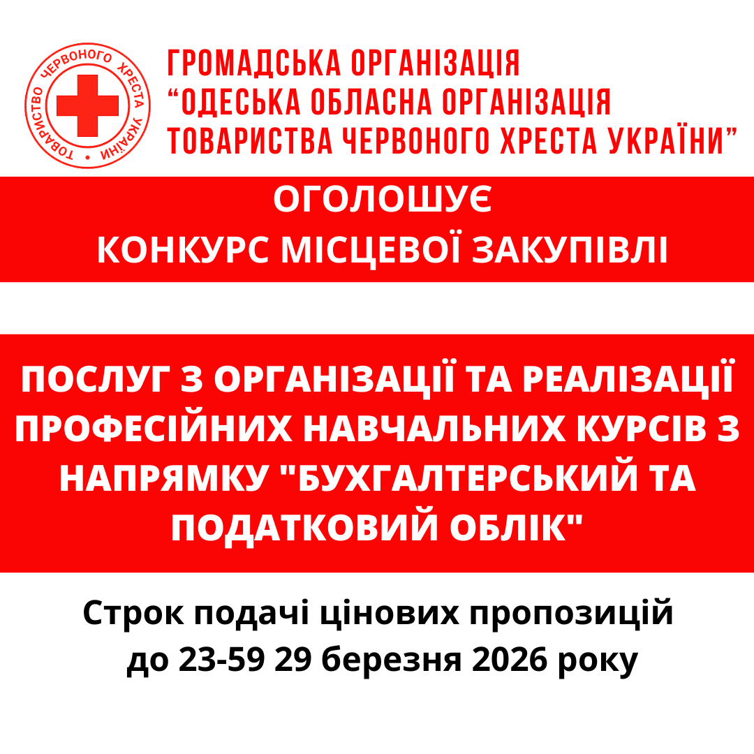 ГО «Одеська обласна організація Товариства Червоного Хреста України» оголошує конкурс місцевої закупівлі послуг з організації та реалізації професійних навчальних курсів з напрямку "Бухгалтерський та податковий облік".
