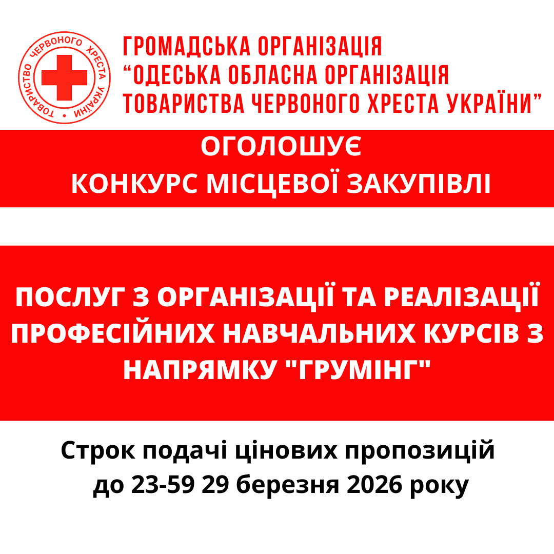 ГО «Одеська обласна організація Товариства Червоного Хреста України» оголошує конкурс місцевої закупівлі послуг з організації та реалізації професійних навчальних курсів з напрямку "Грумінг".
