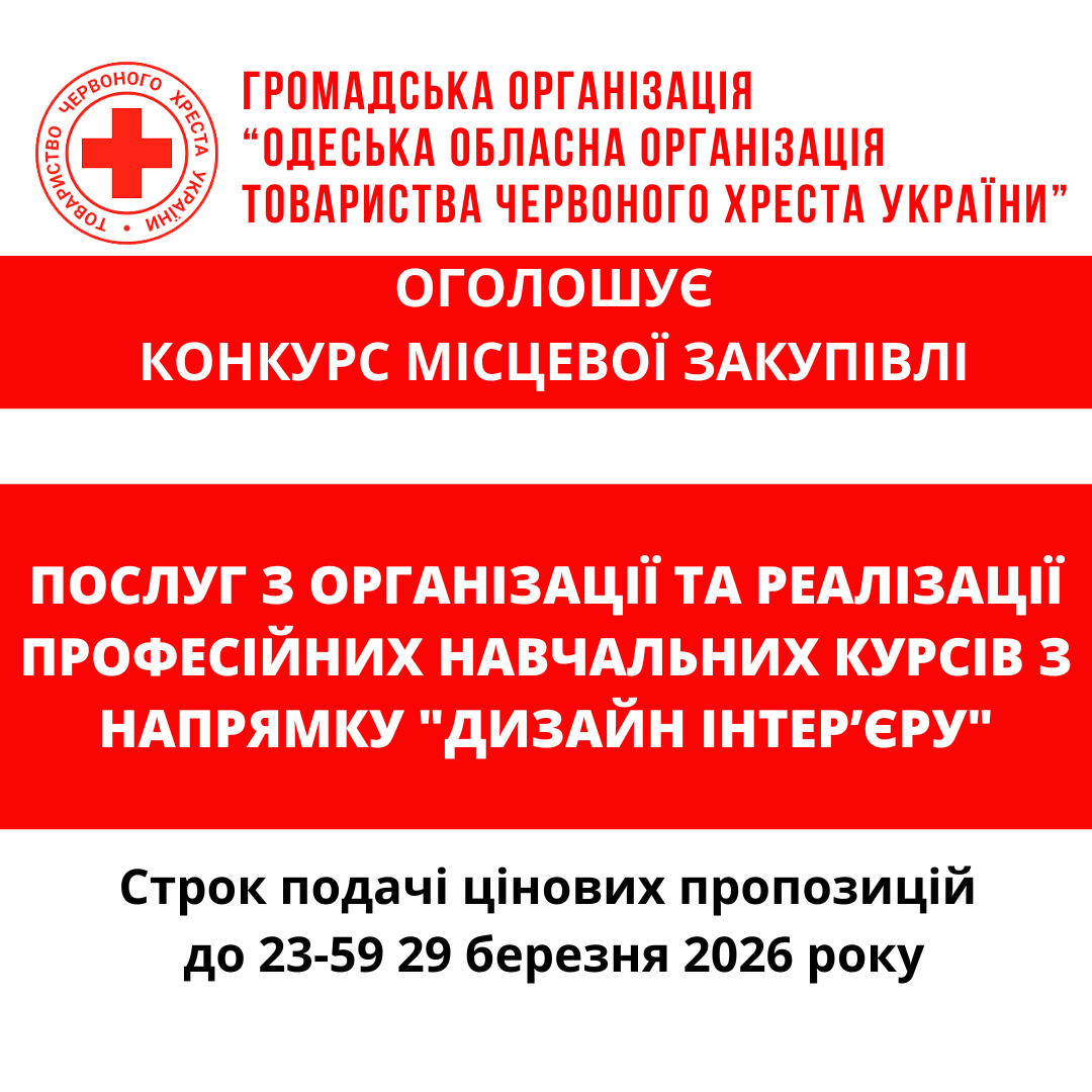 ГО «Одеська обласна організація Товариства Червоного Хреста України» оголошує конкурс місцевої закупівлі послуг з організації та реалізації професійних навчальних курсів з напрямку “Дизайн інтер’єру ".