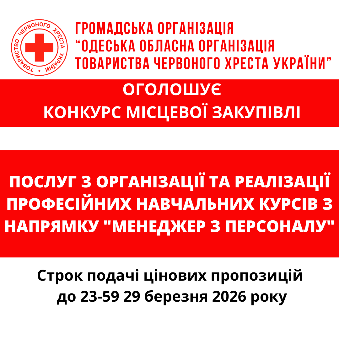 ГО «Одеська обласна організація Товариства Червоного Хреста України» оголошує конкурс місцевої закупівлі послуг з організації та реалізації професійних навчальних курсів "Менеджер з персоналу".
