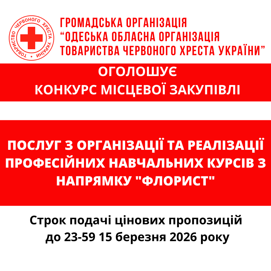 ГО «Одеська обласна організація Товариства Червоного Хреста України» оголошує конкурс місцевої закупівлі послуг з організації та реалізації професійних навчальних курсів з напрямку "Флорист".