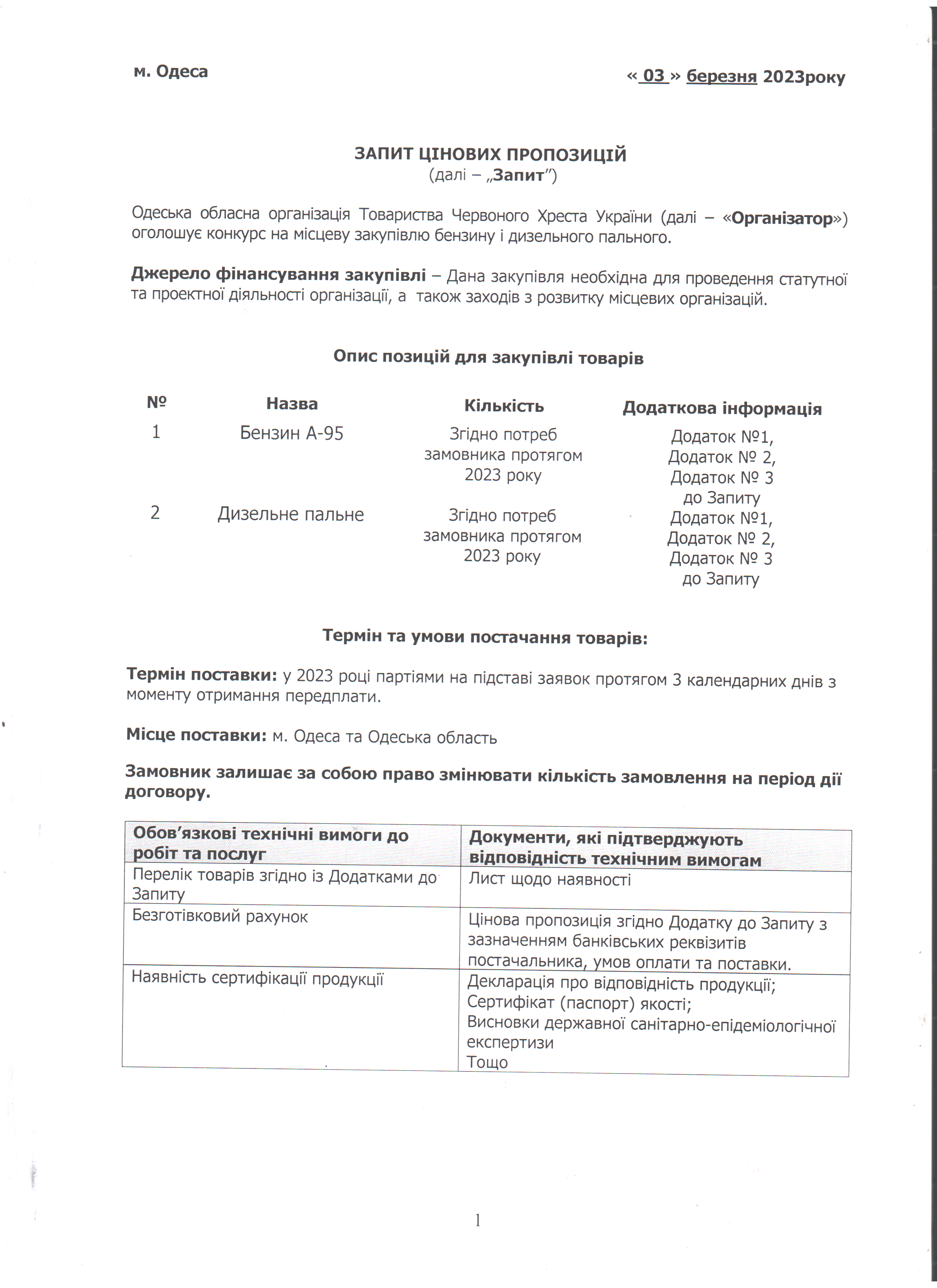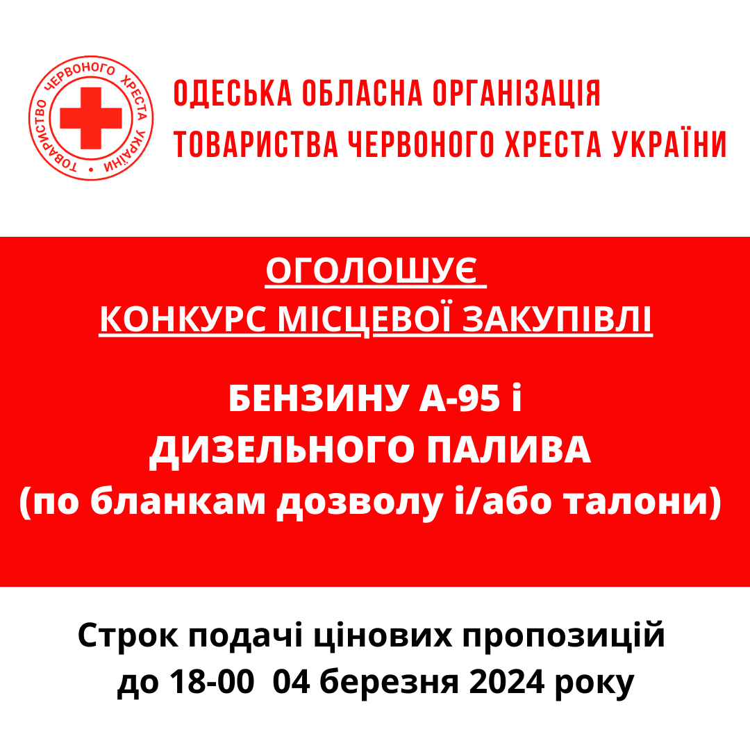 Одеська обласна організація Товариства Червоного Хреста України оголошує конкурс на придбання бензину і дизельного пального.