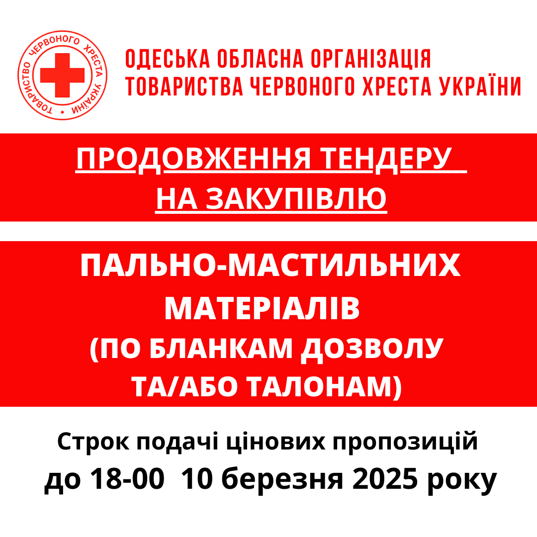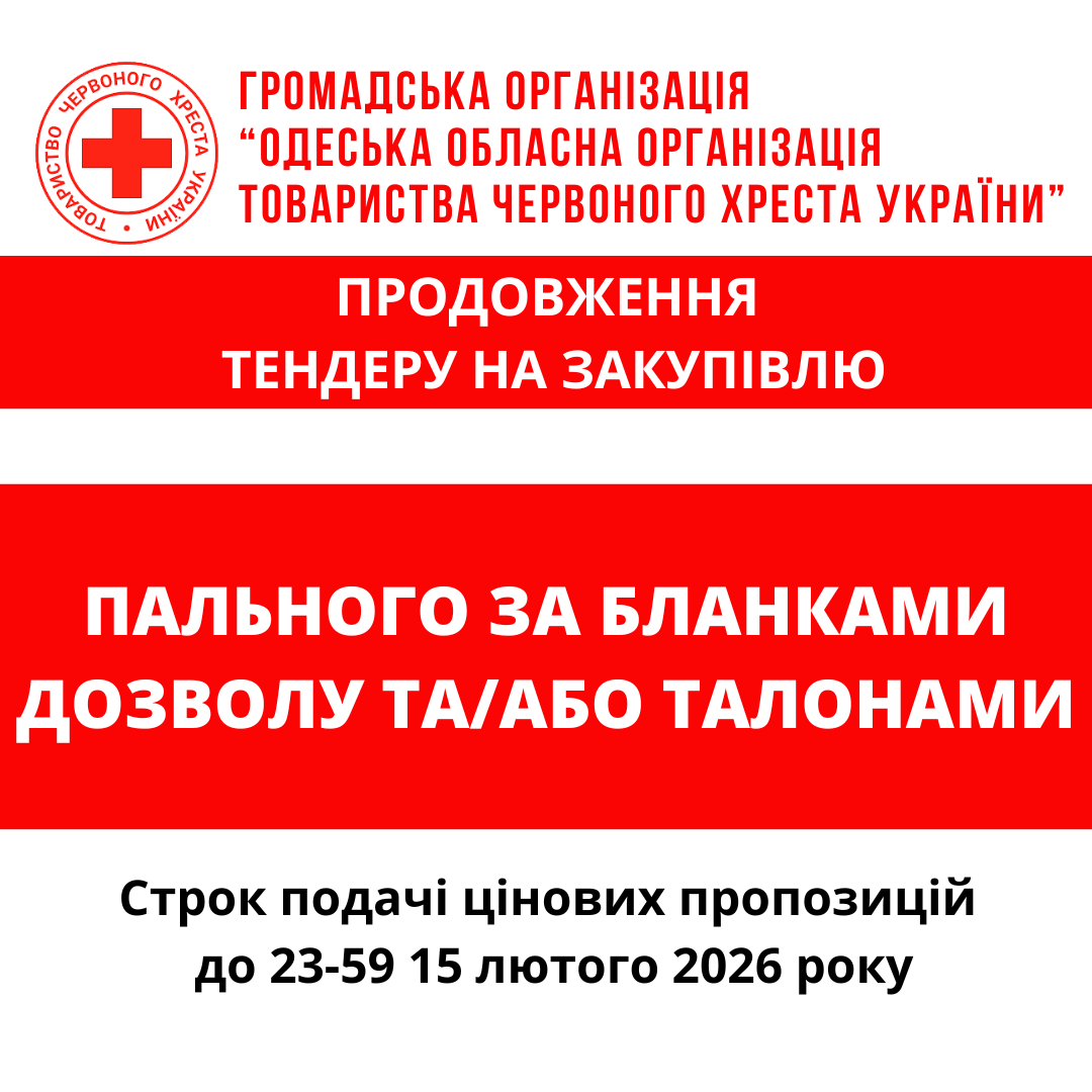 ГО «Одеська обласна організація Товариства Червоного Хреста України» оголошує продовження тендеру на закупівлю пального за бланками дозволу та/або талонами.