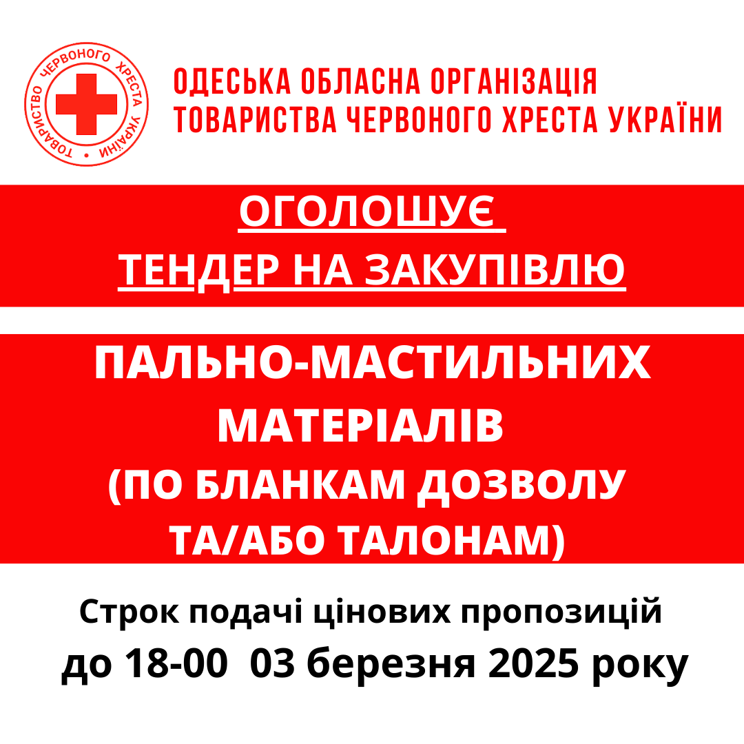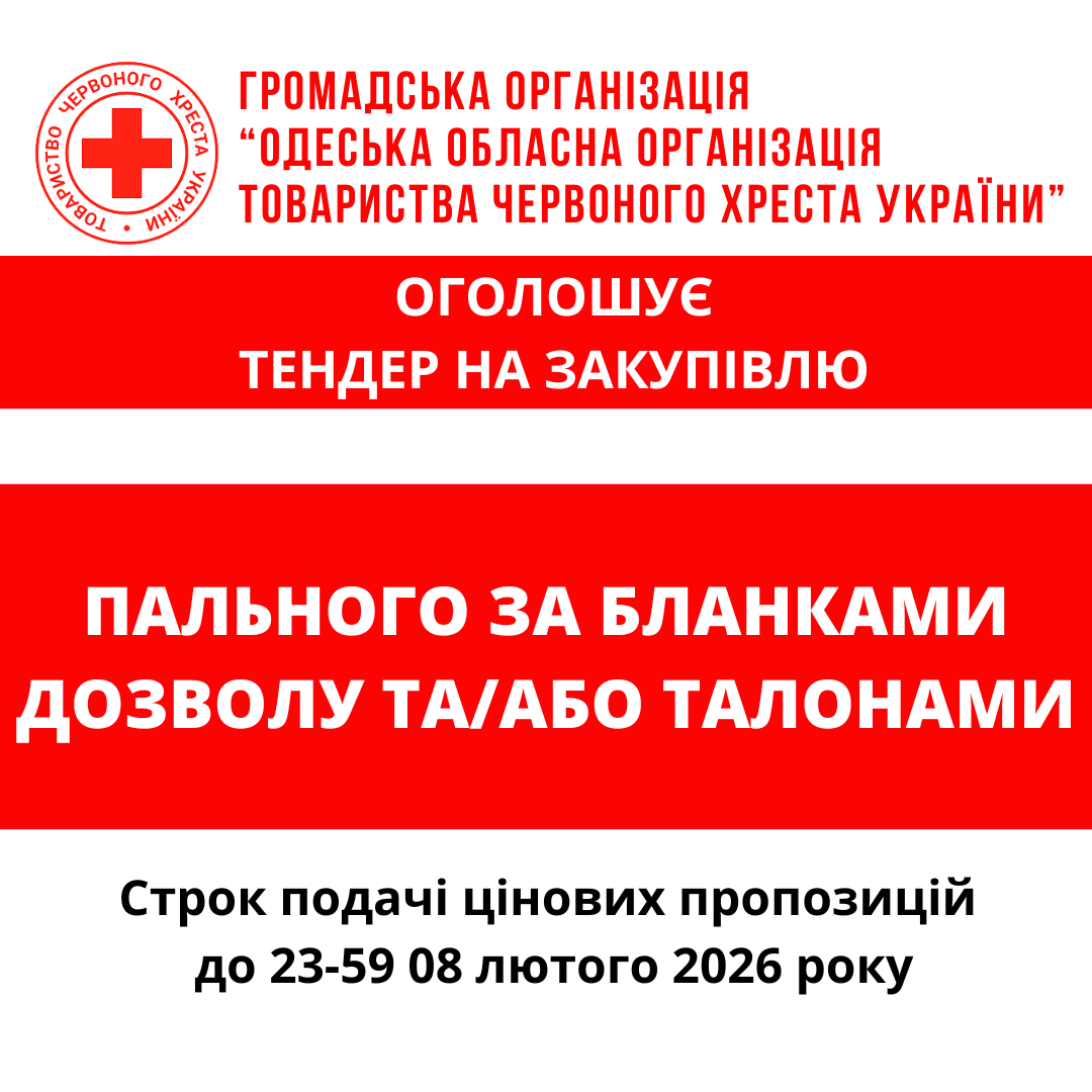 ГО «Одеська обласна організація Товариства Червоного Хреста України» оголошує тендер на закупівлю пального за бланками дозволу та/або талонами.