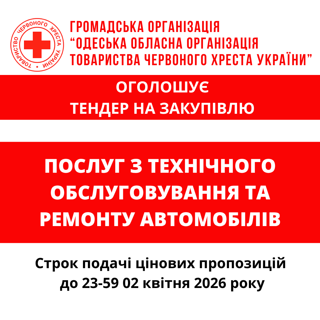 ГО «Одеська обласна організація Товариства Червоного Хреста України» оголошує тендер на закупівлю послуг з технічного обслуговування та ремонту автомобілів.