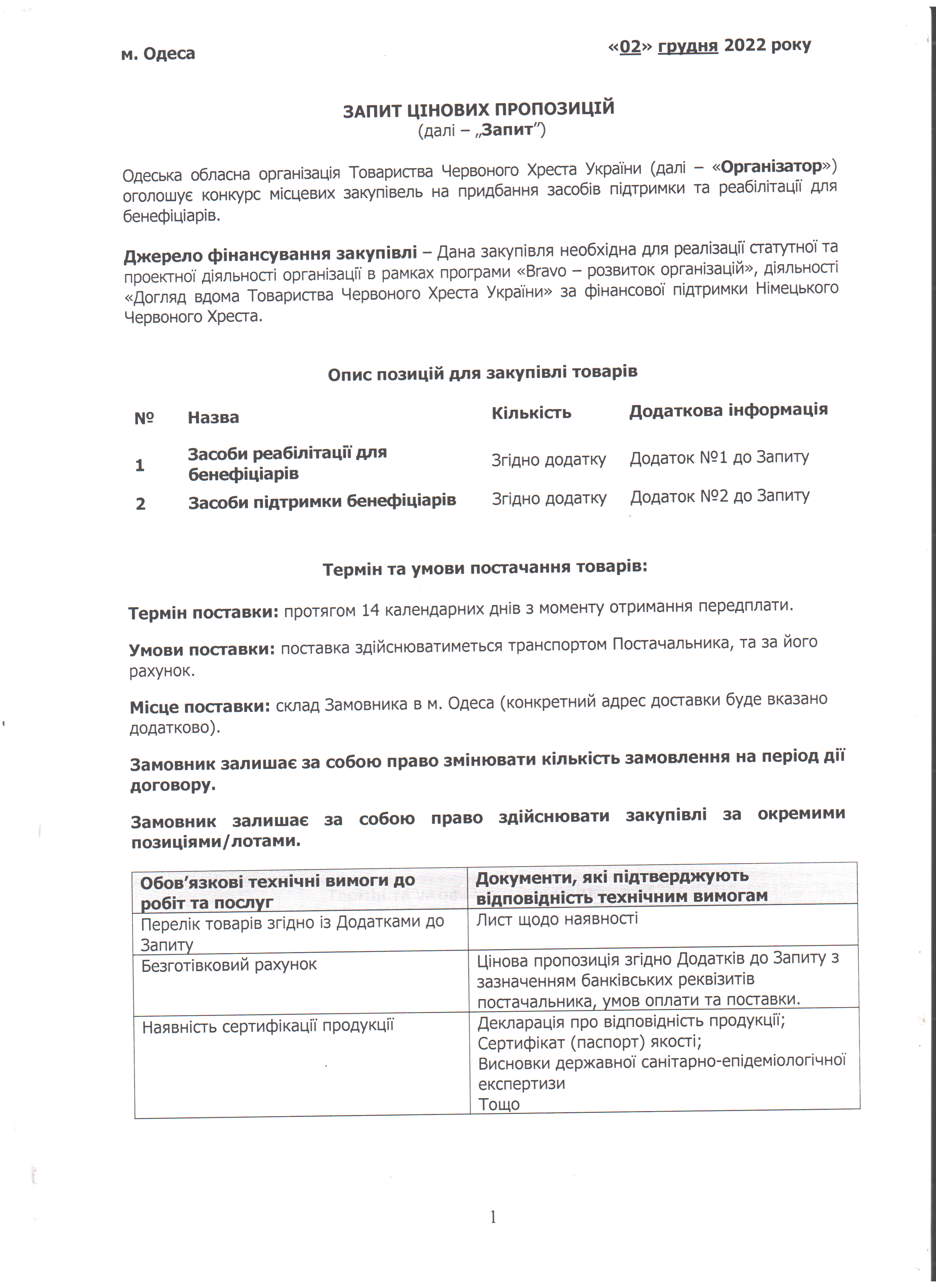 Одеська обласна організація Товариства Червоного Хреста України оголошує конкурс на місцеву закупівлю на придбання засобів підтримки та реабілітації для бенефіціарів.