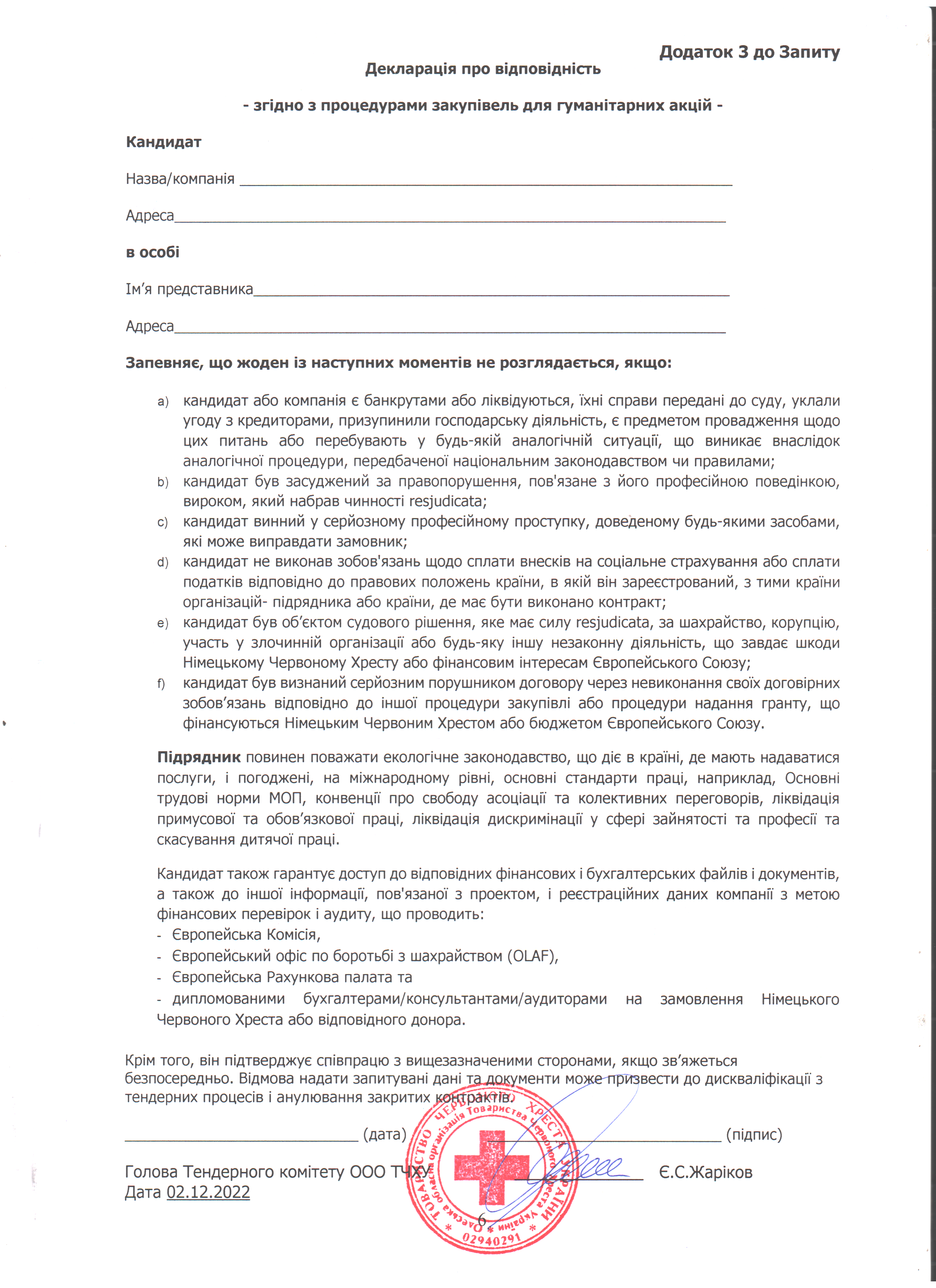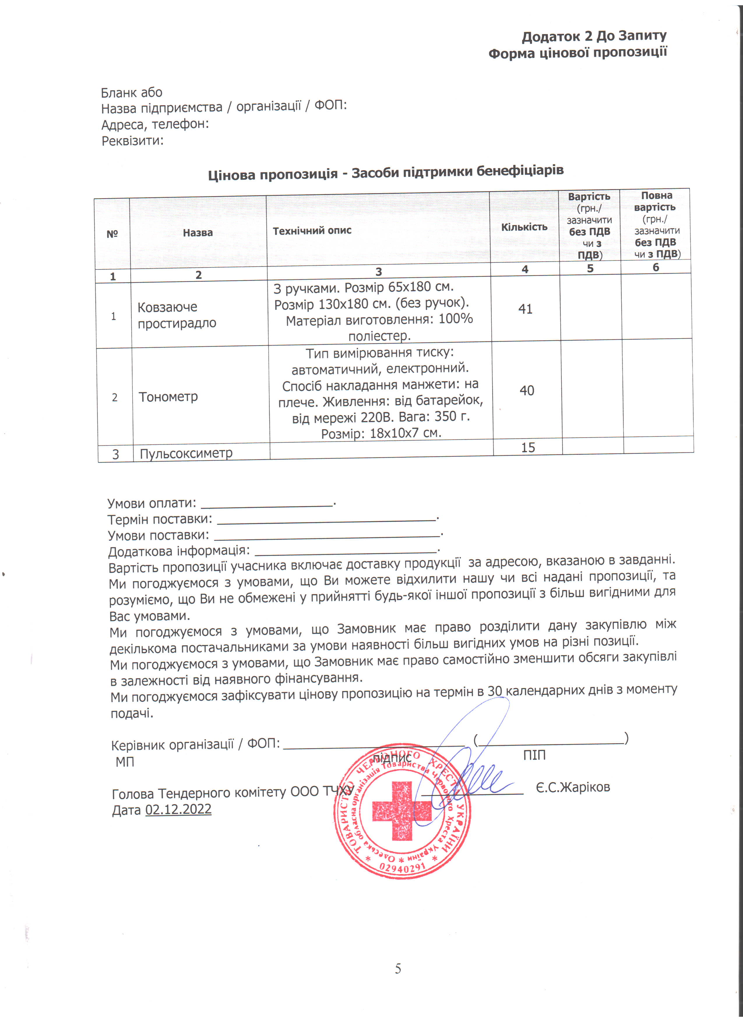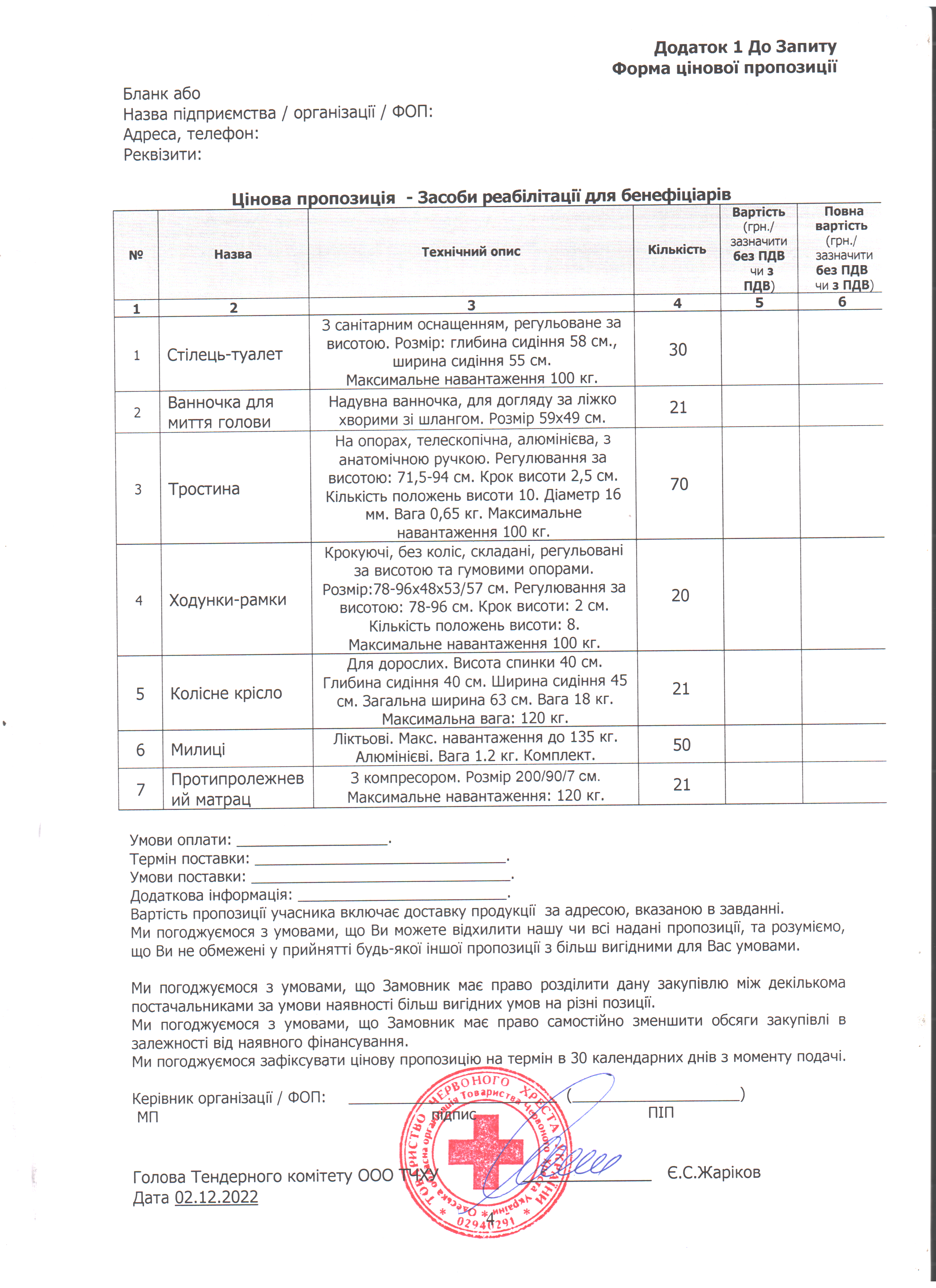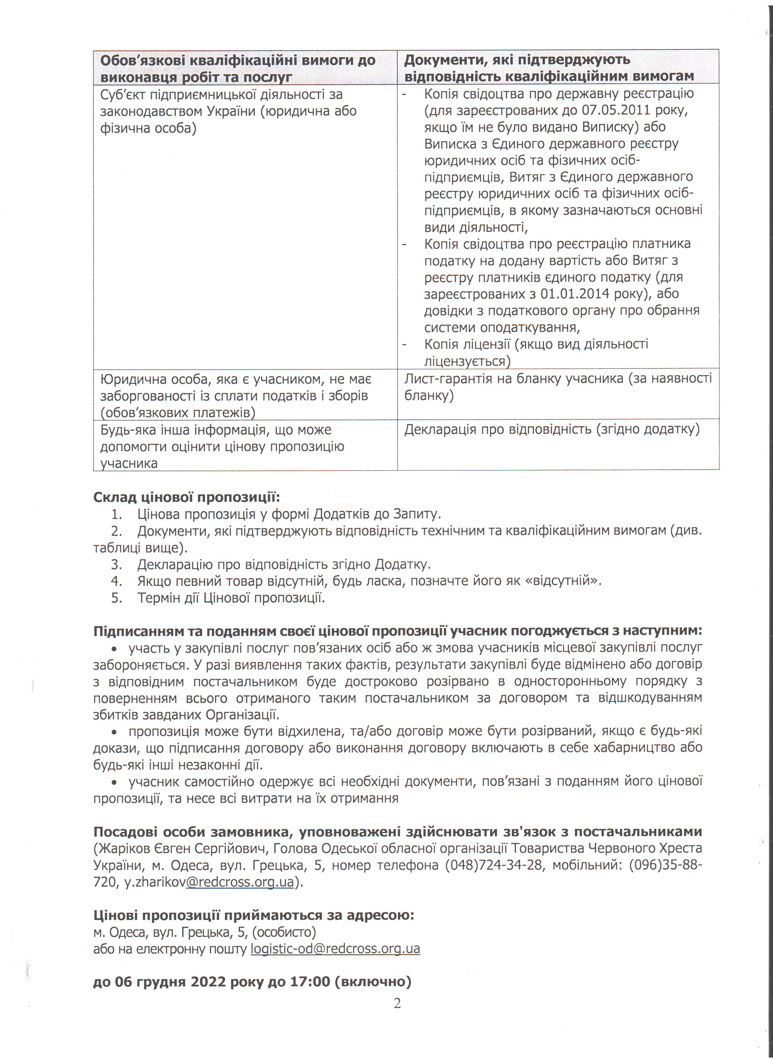 Просимо направляти ваші цінові пропозиції за адресою: м. Одеса, вул. Грецька, 5, (особисто) або на електронну пошту logistic-od@redcross.org.ua