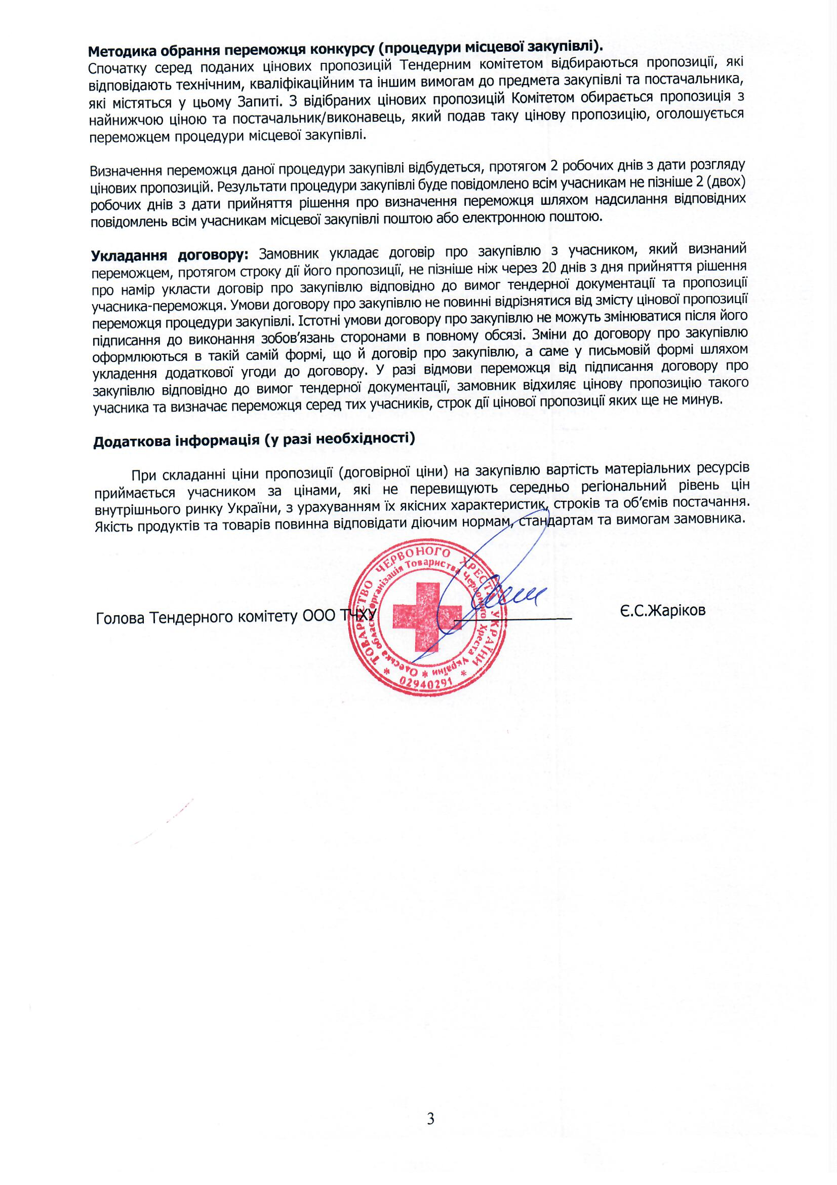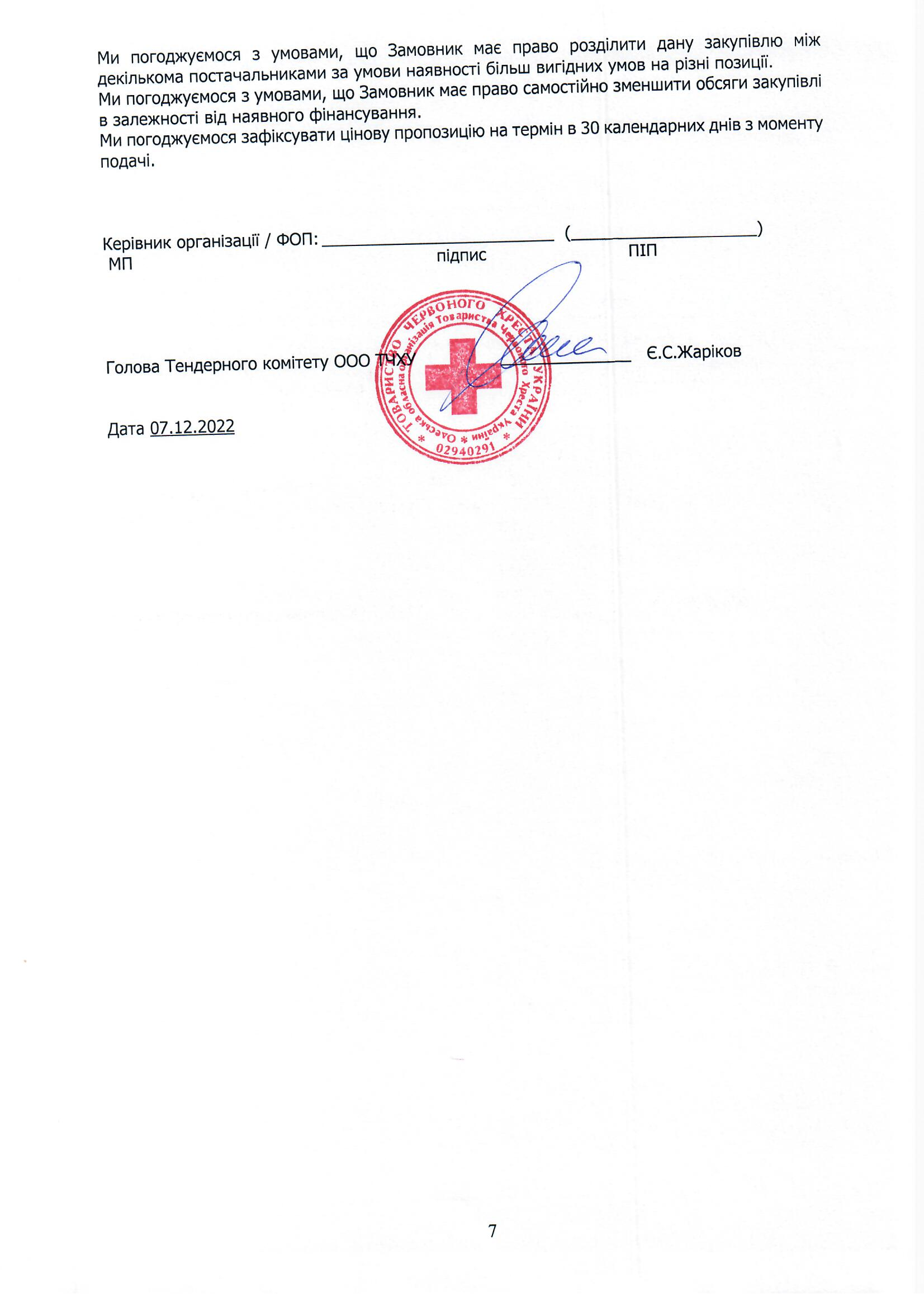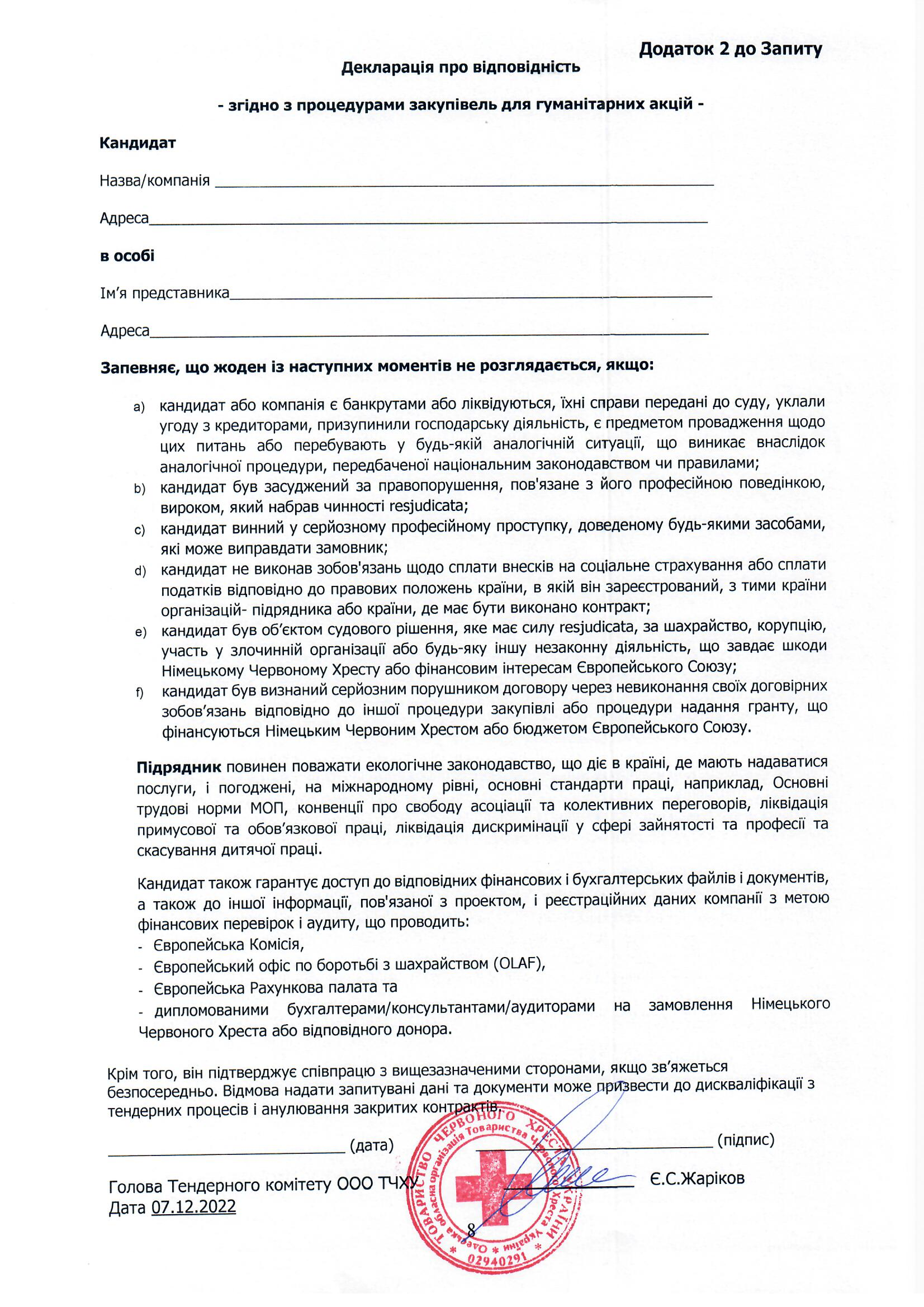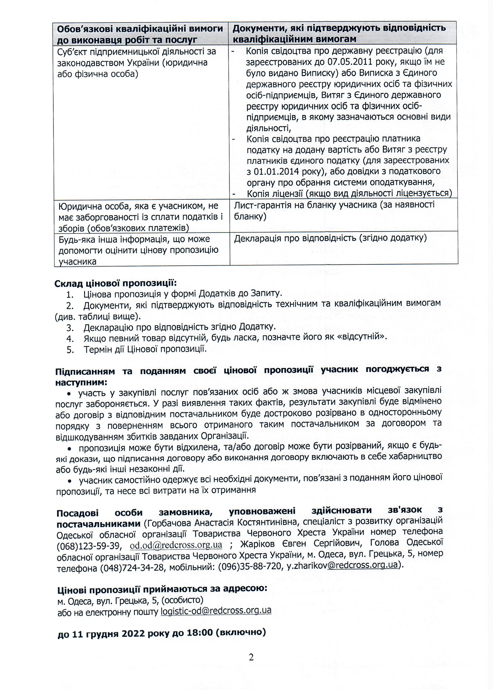Просимо направляти ваші цінові пропозиції за адресою: м. Одеса, вул. Грецька, 5, (особисто) або на електронну пошту logistic-od@redcross.org.ua