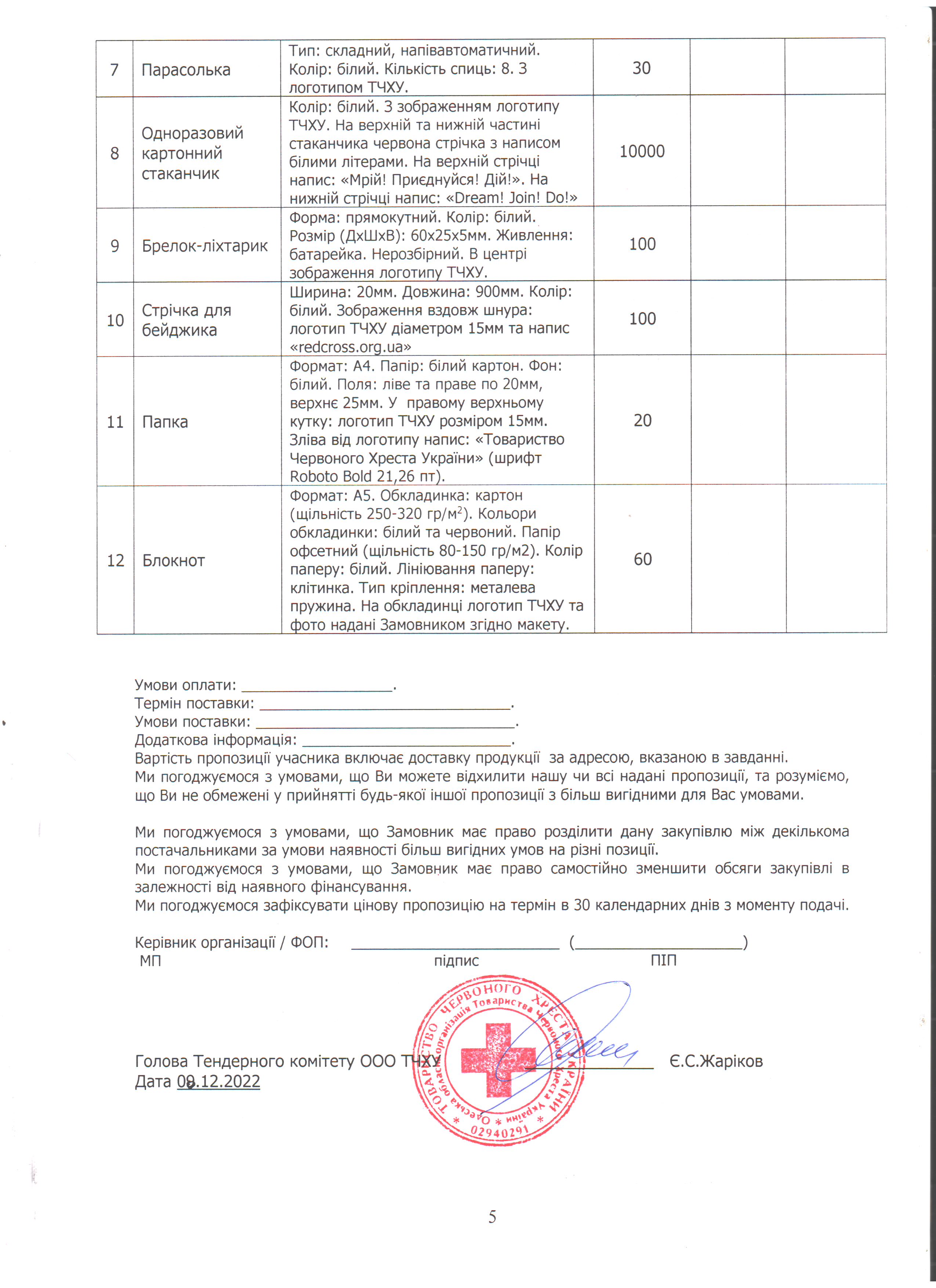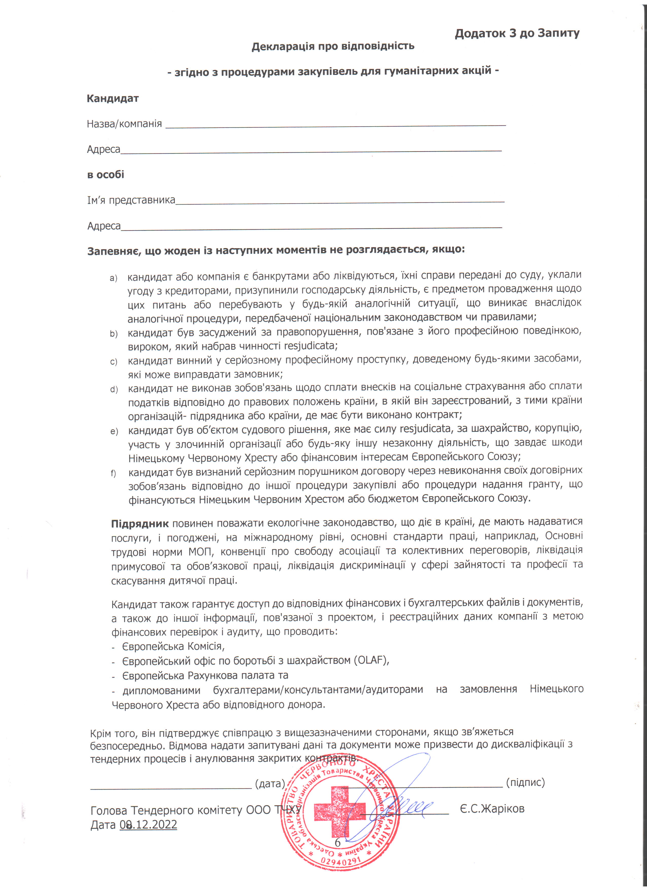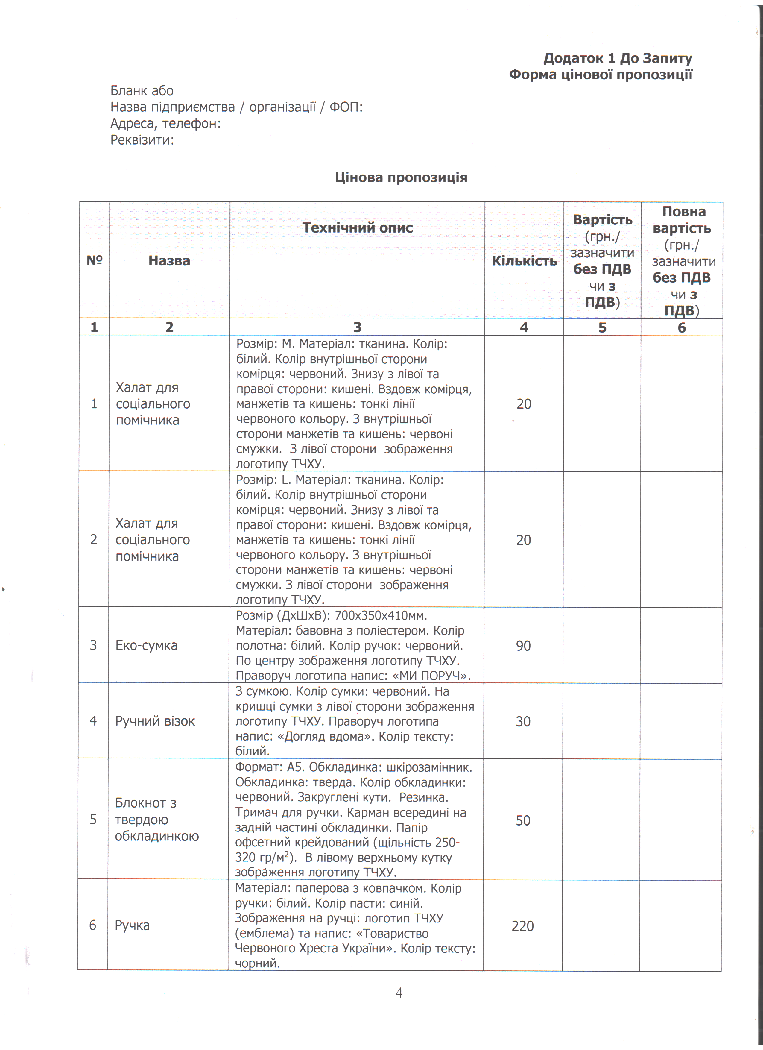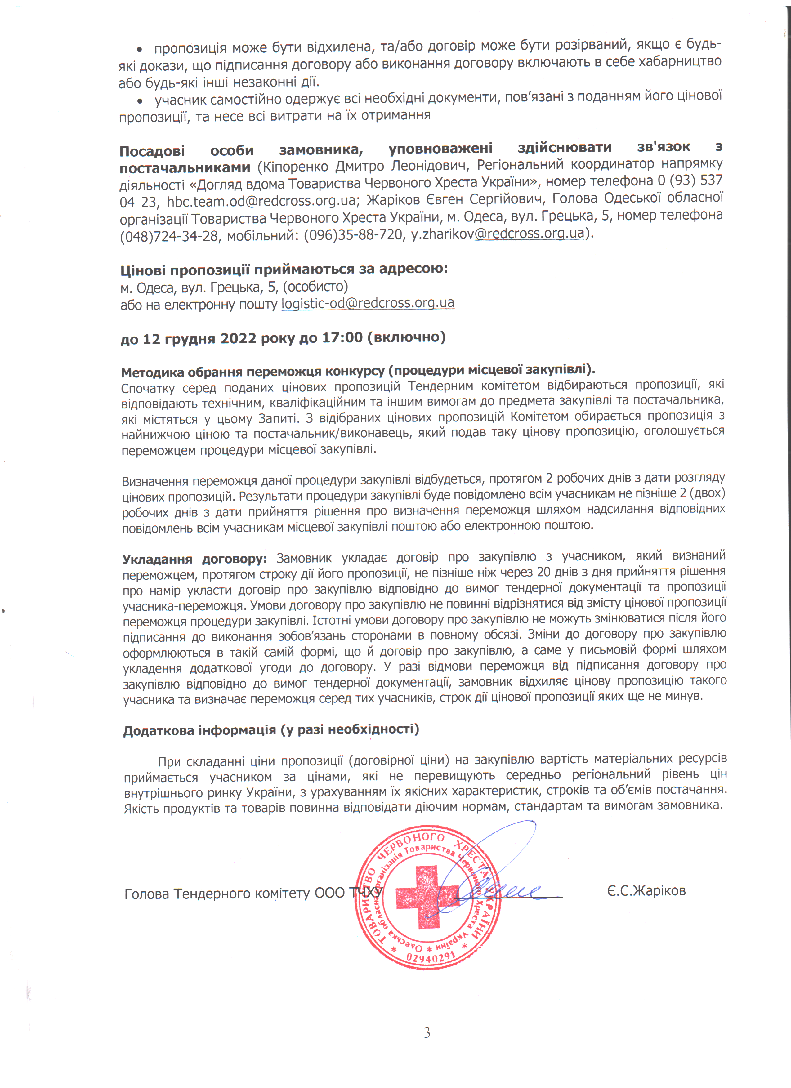 Просимо направляти ваші цінові пропозиції за адресою: м. Одеса, вул. Грецька, 5, (особисто) або на електронну пошту logistic-od@redcross.org.ua