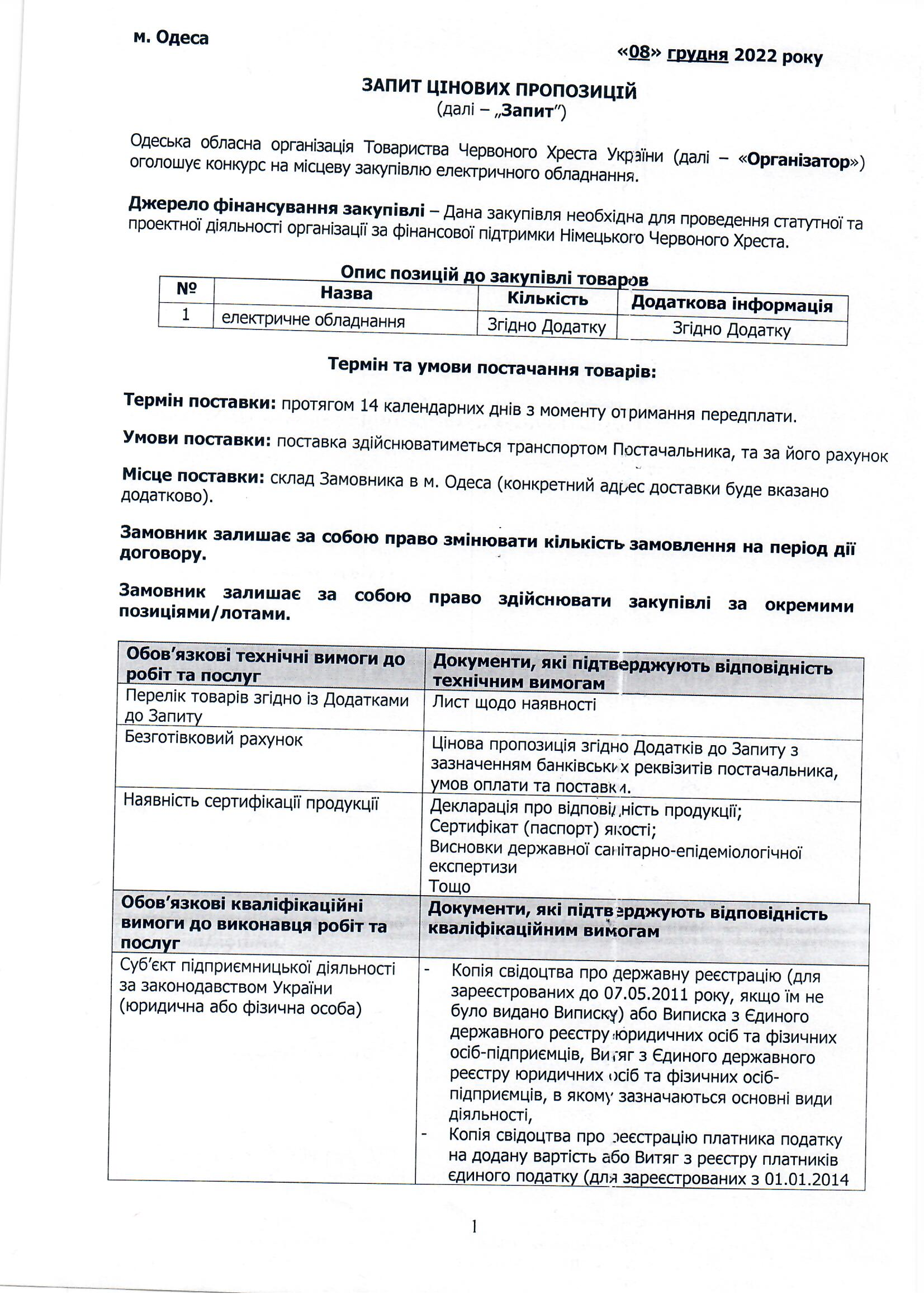 Одеська обласна організація Товариства Червоного Хреста України оголошує конкурс на місцеву закупівлю електричного обладнання.