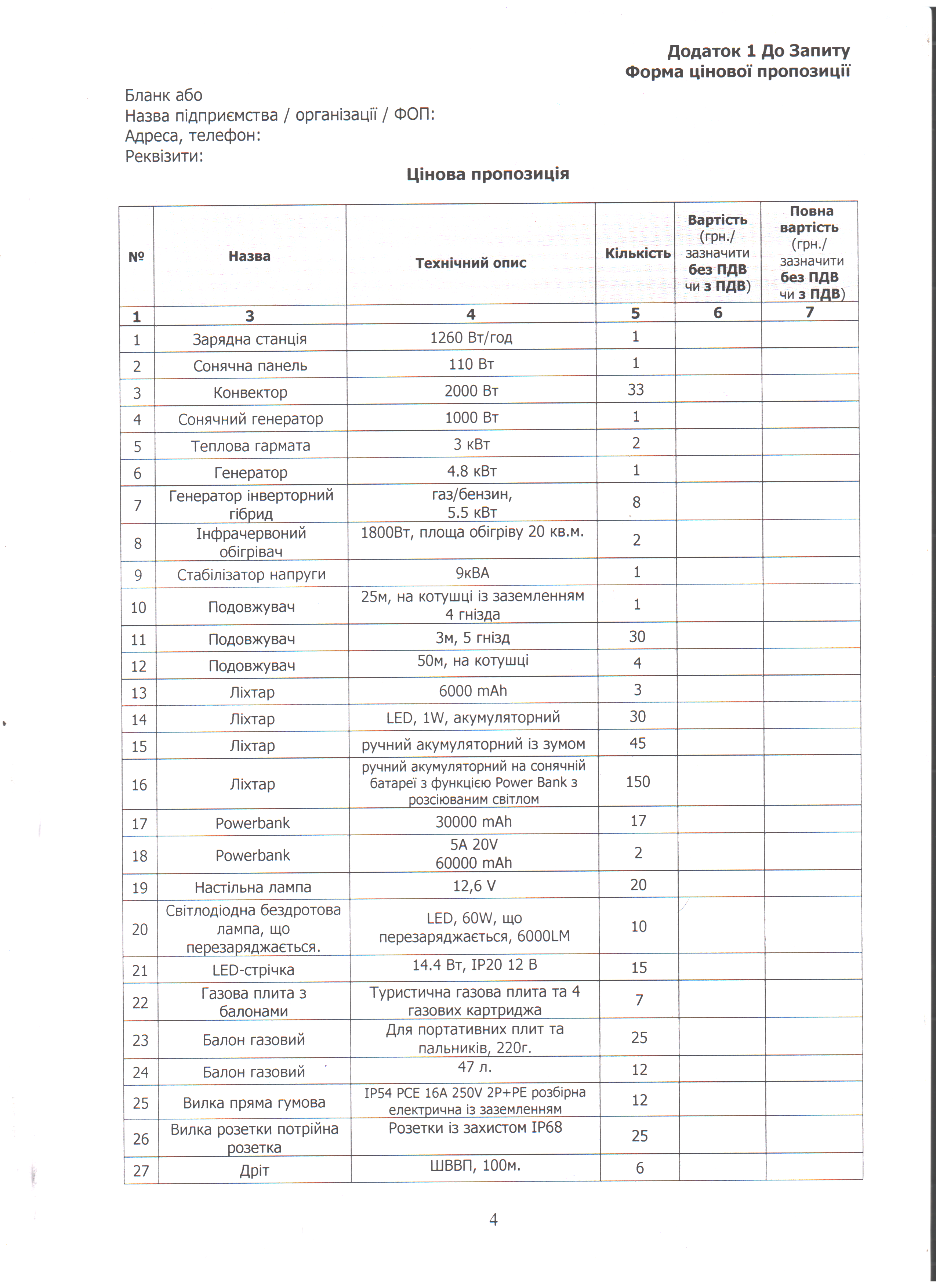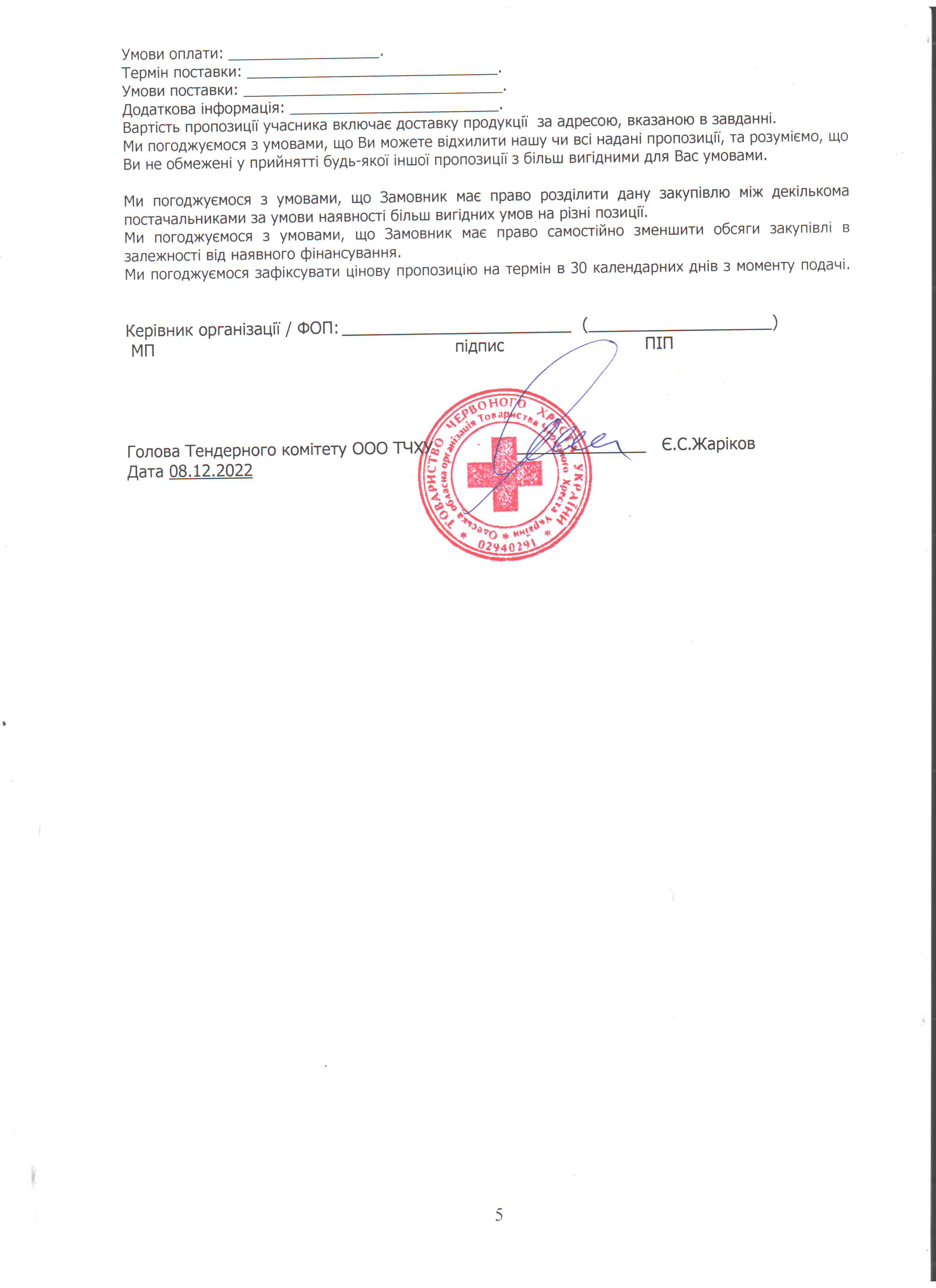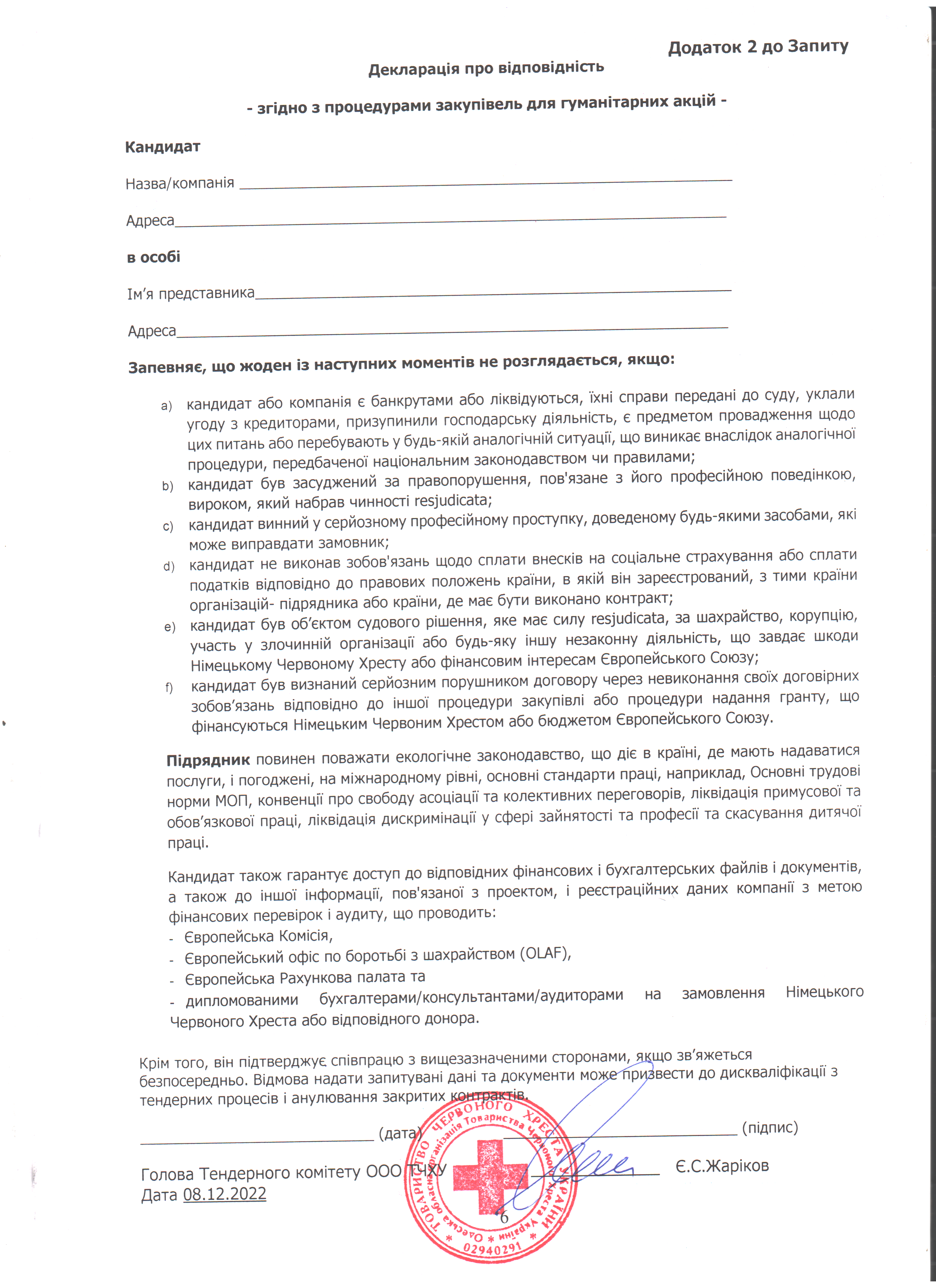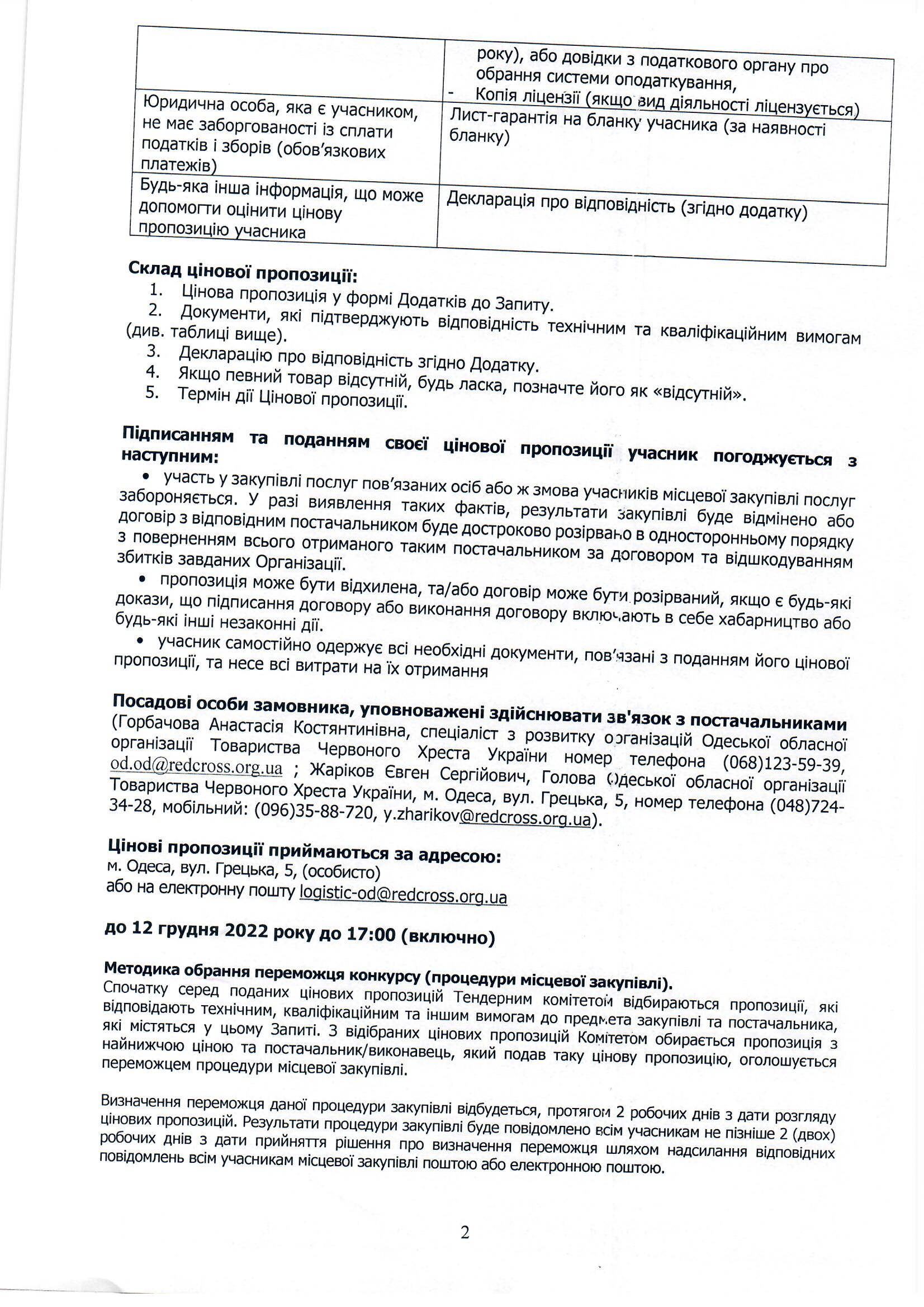 Просимо направляти ваші цінові пропозиції за адресою: м. Одеса, вул. Грецька, 5, (особисто) або на електронну пошту logistic-od@redcross.org.ua
