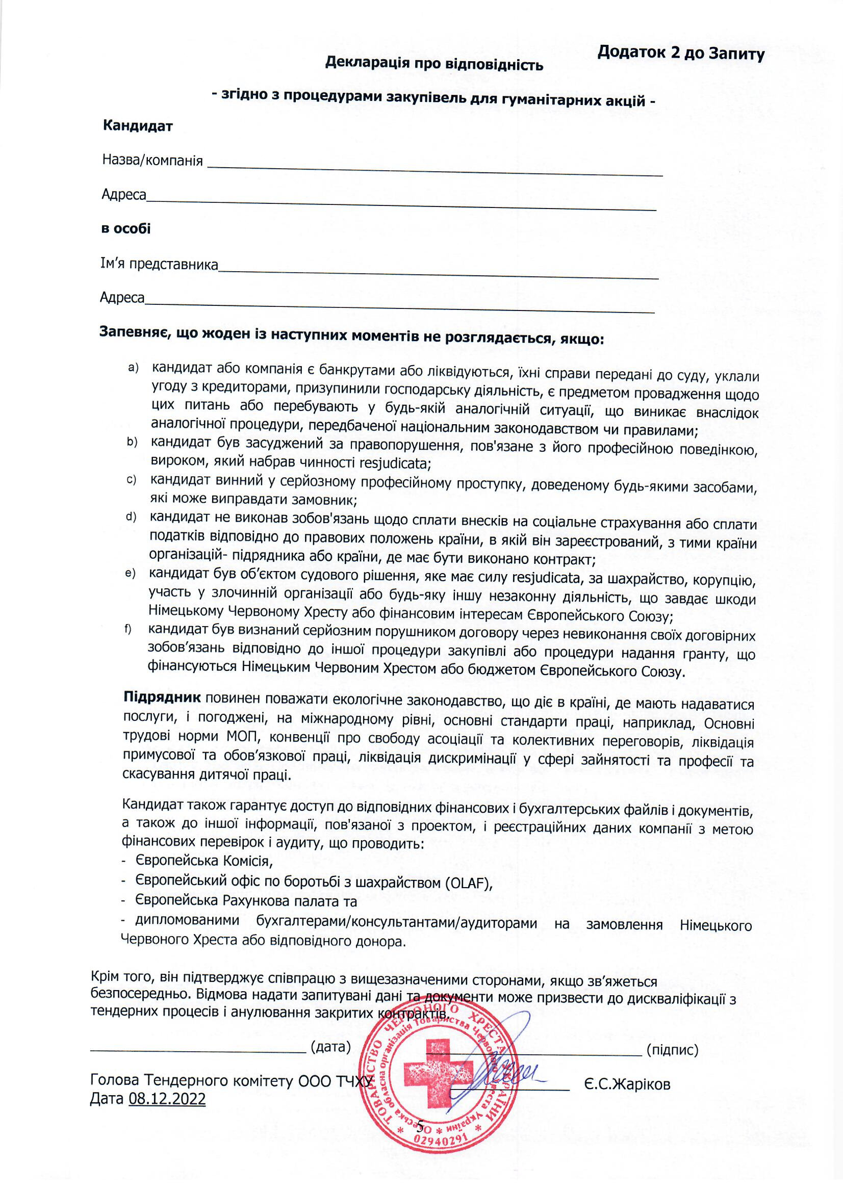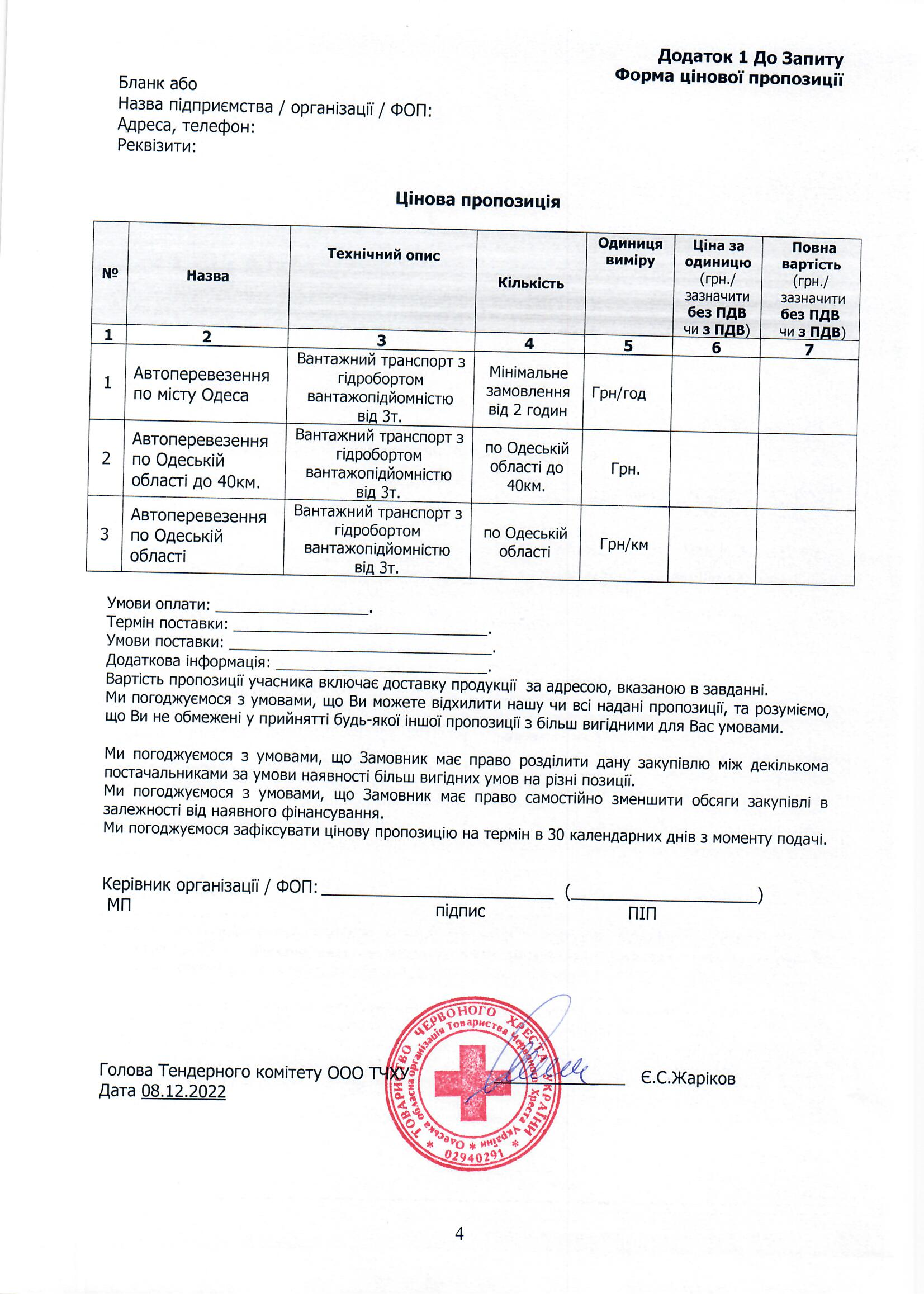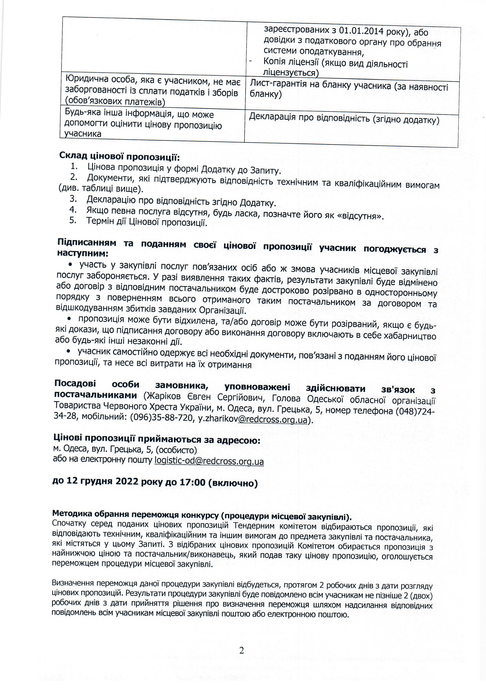 Просимо направляти ваші цінові пропозиції за адресою: м. Одеса, вул. Грецька, 5, (особисто) або на електронну пошту logistic-od@redcross.org.ua