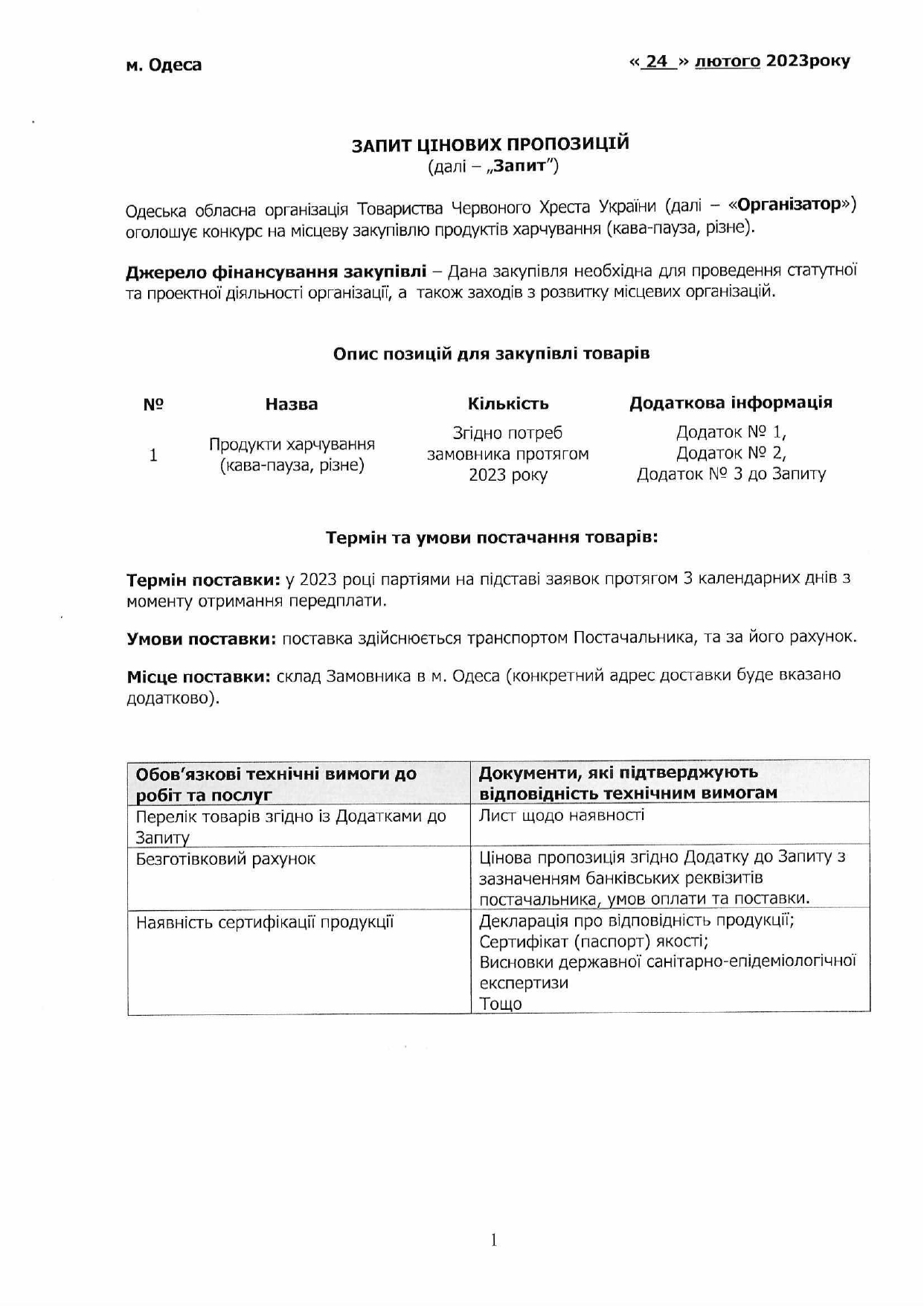 Одеська обласна організація Товариства Червоного Хреста України оголошує конкурс на місцеву закупівлю продуктів харчування (кава-пауза, різне).