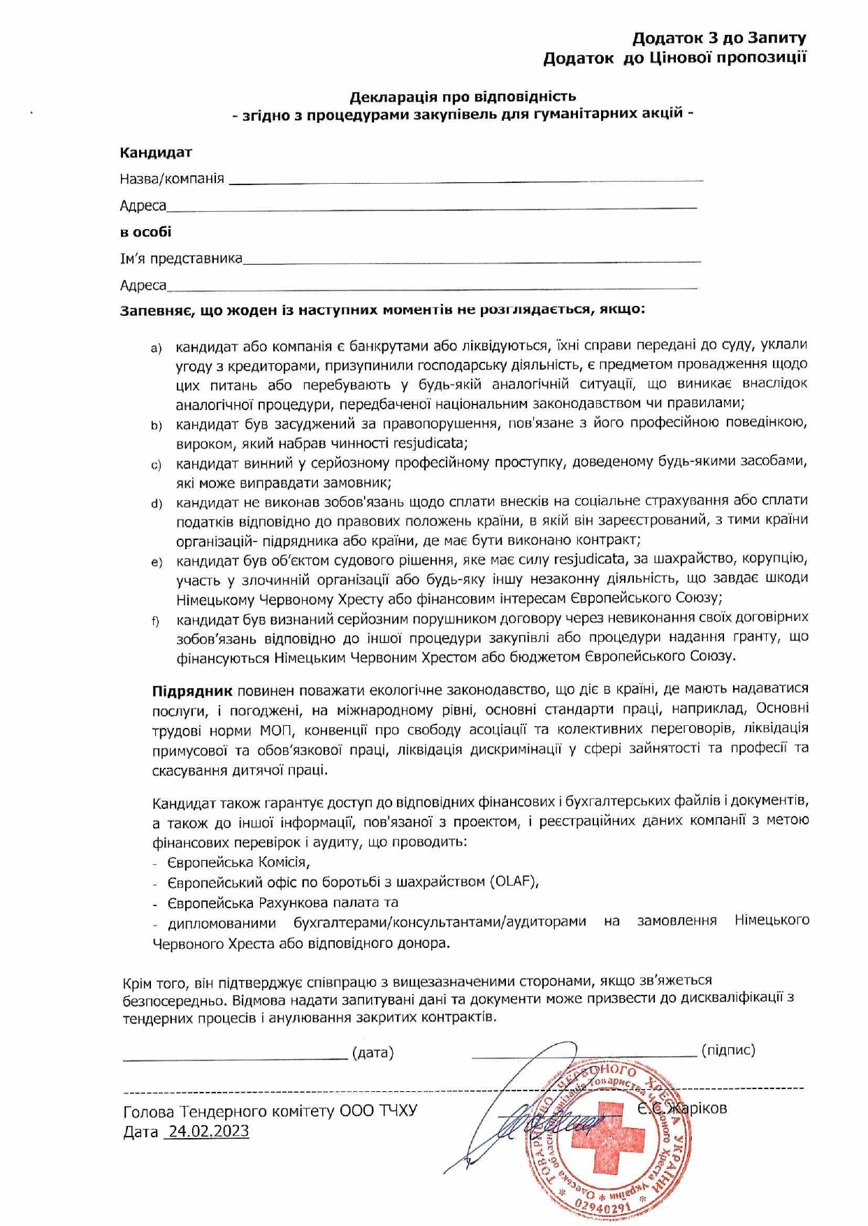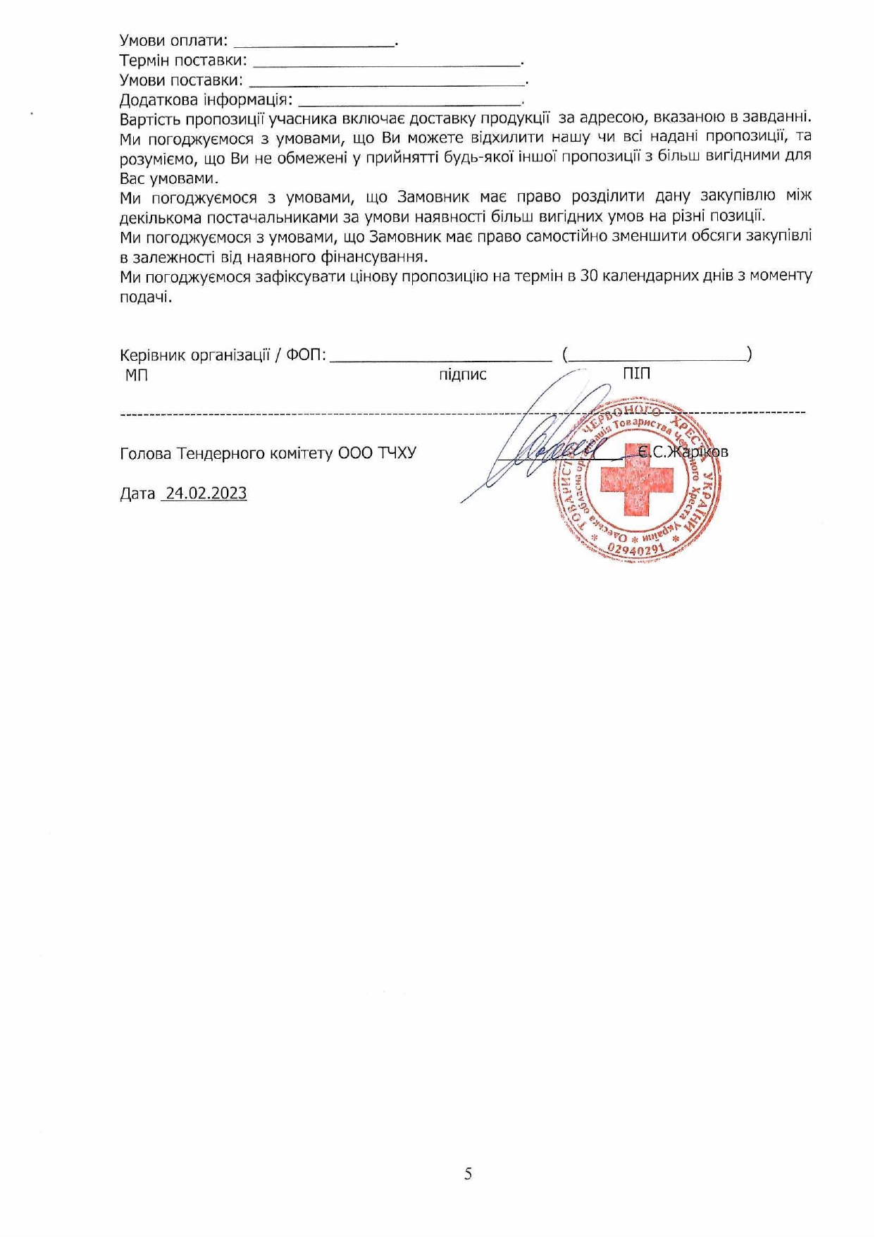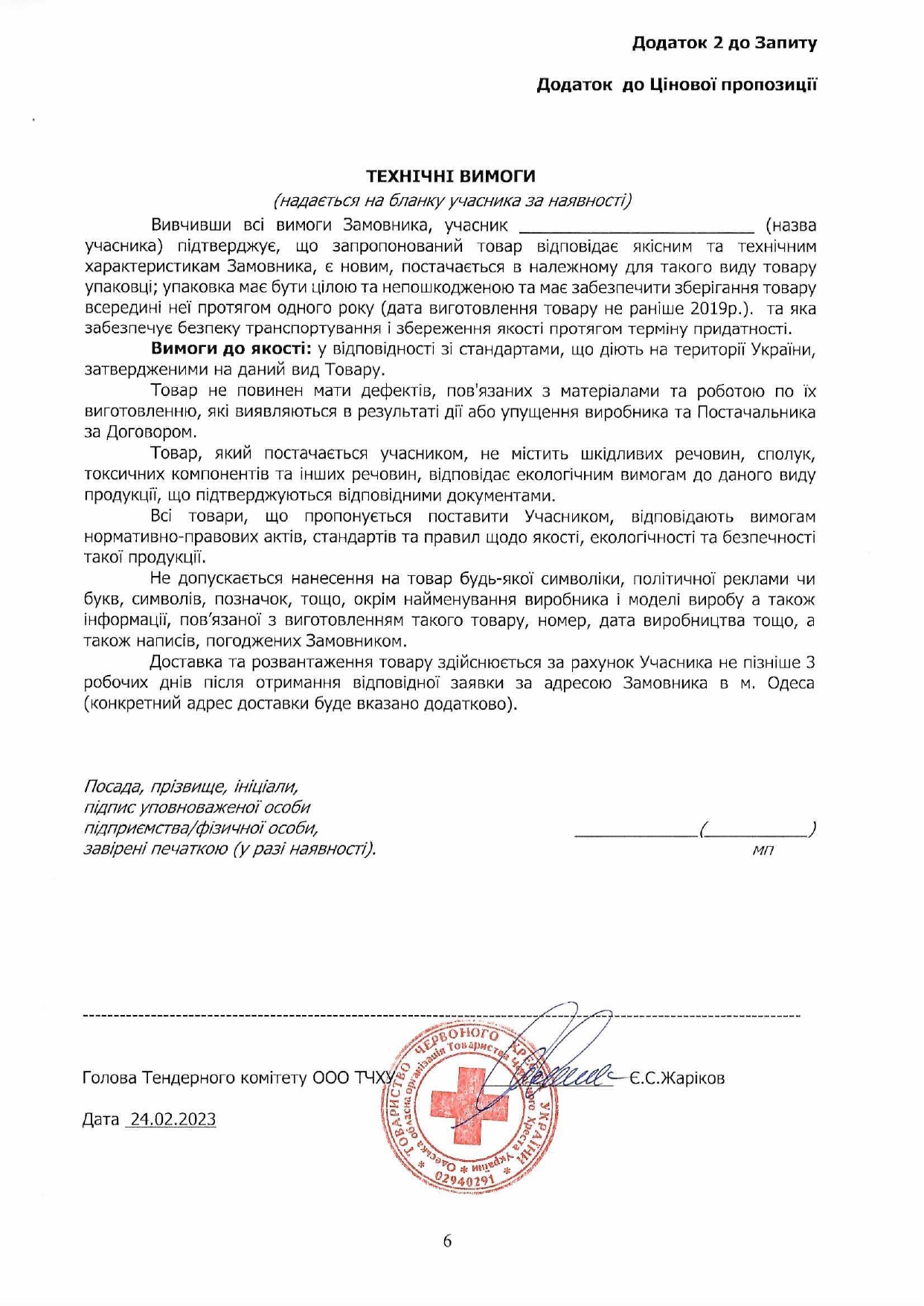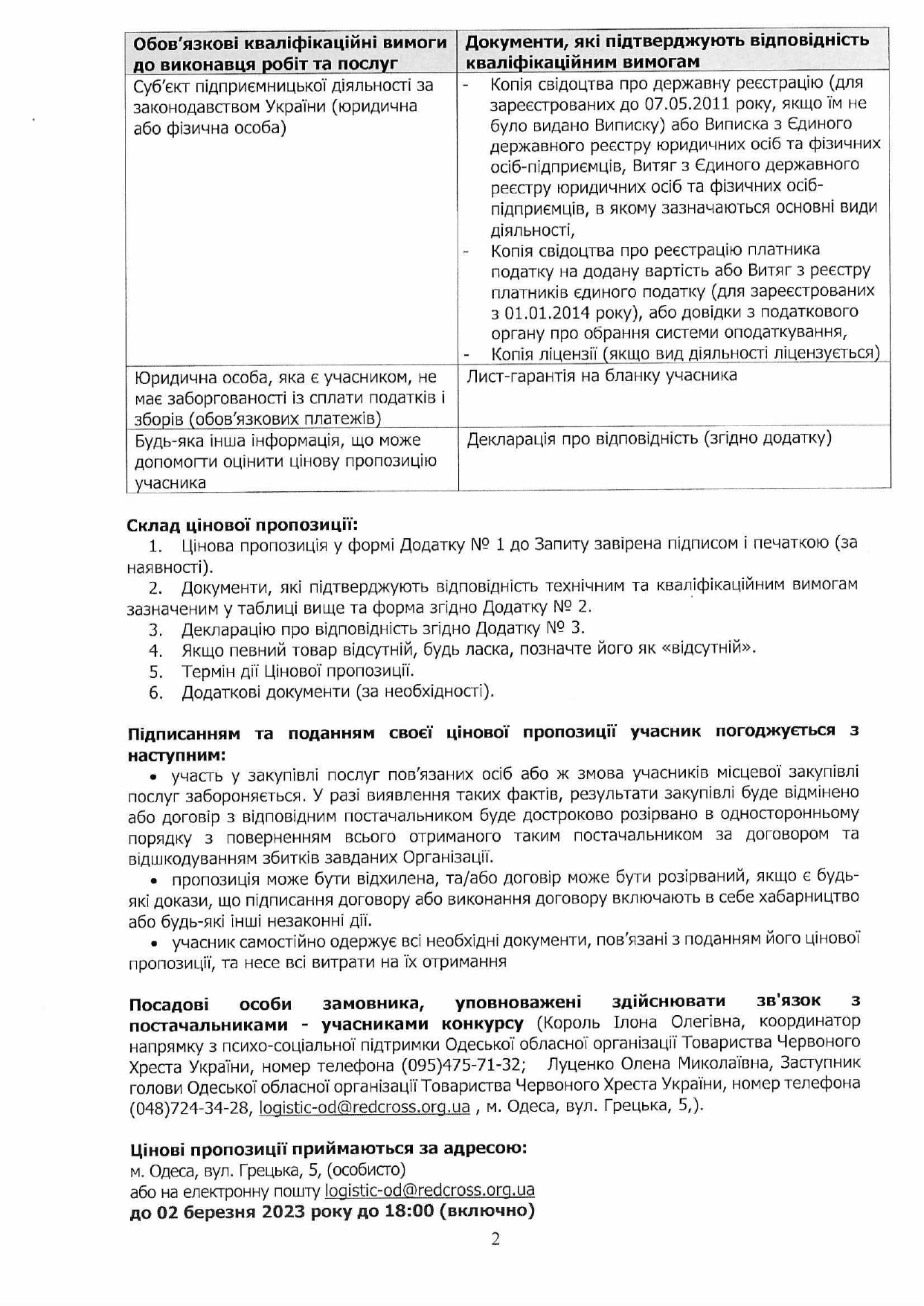 Просимо направляти ваші цінові пропозиції за адресою: м. Одеса, вул. Грецька, 5, (особисто) або на електронну пошту logistic-od@redcross.org.ua